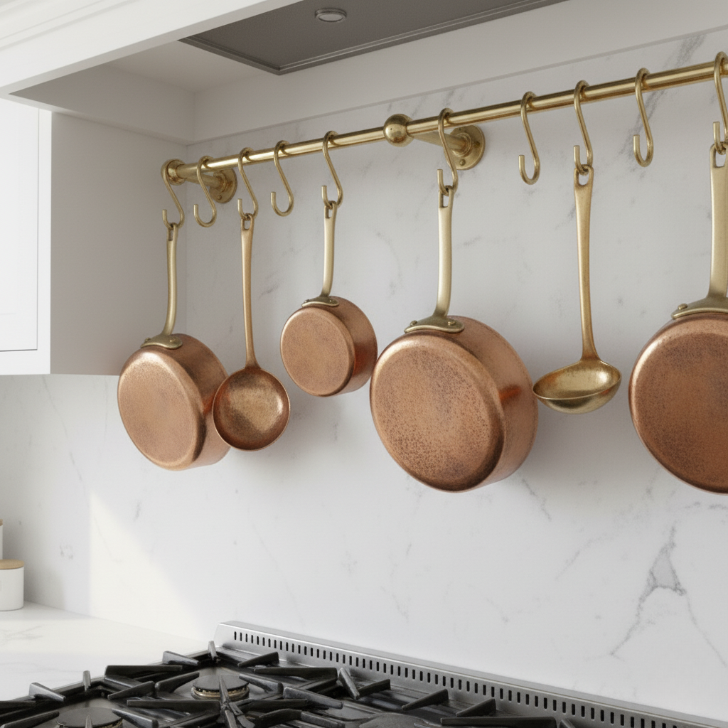 Unlacquered Brass Hanging Pot Rack, Solid Brass Pan Racks, Brass Kitchen Rail With Hooks, Brass Wall Mount Hooks