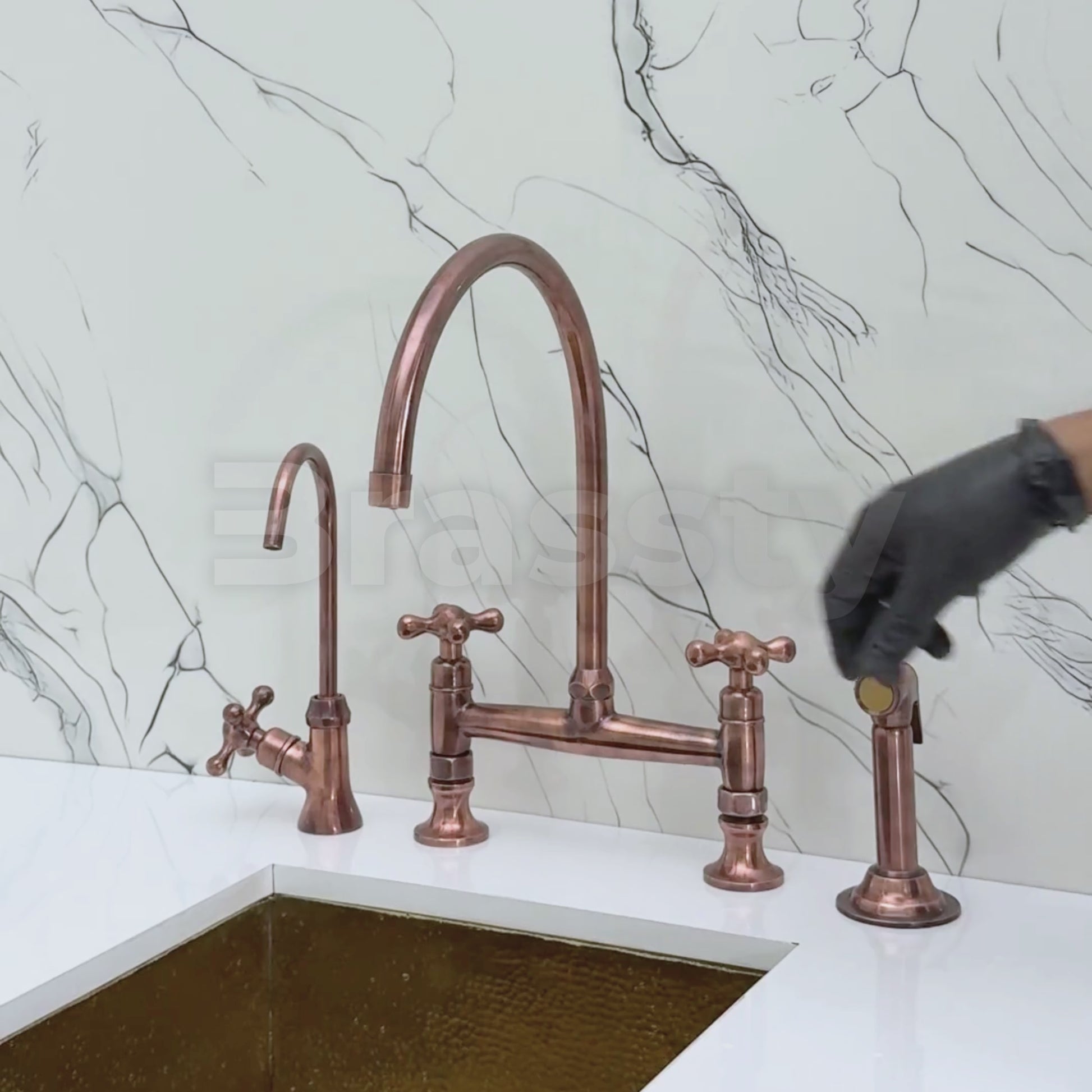 Kitchen Bridge Faucet in Antique Copper Finish blends traditional charm with modern utility. Featuring a striking antique copper finish over solid brass construction, it offers both durability and timeless character. A 360° swivel gooseneck spout with a 10" reach ensures full sink coverage. Designed for practical elegance, it includes a high-pressure side sprayer and a dedicated drinking water tap. Cross handles provide smooth water control, and the antique copper finish resists corrosion and elevates any kitchen aesthetic.