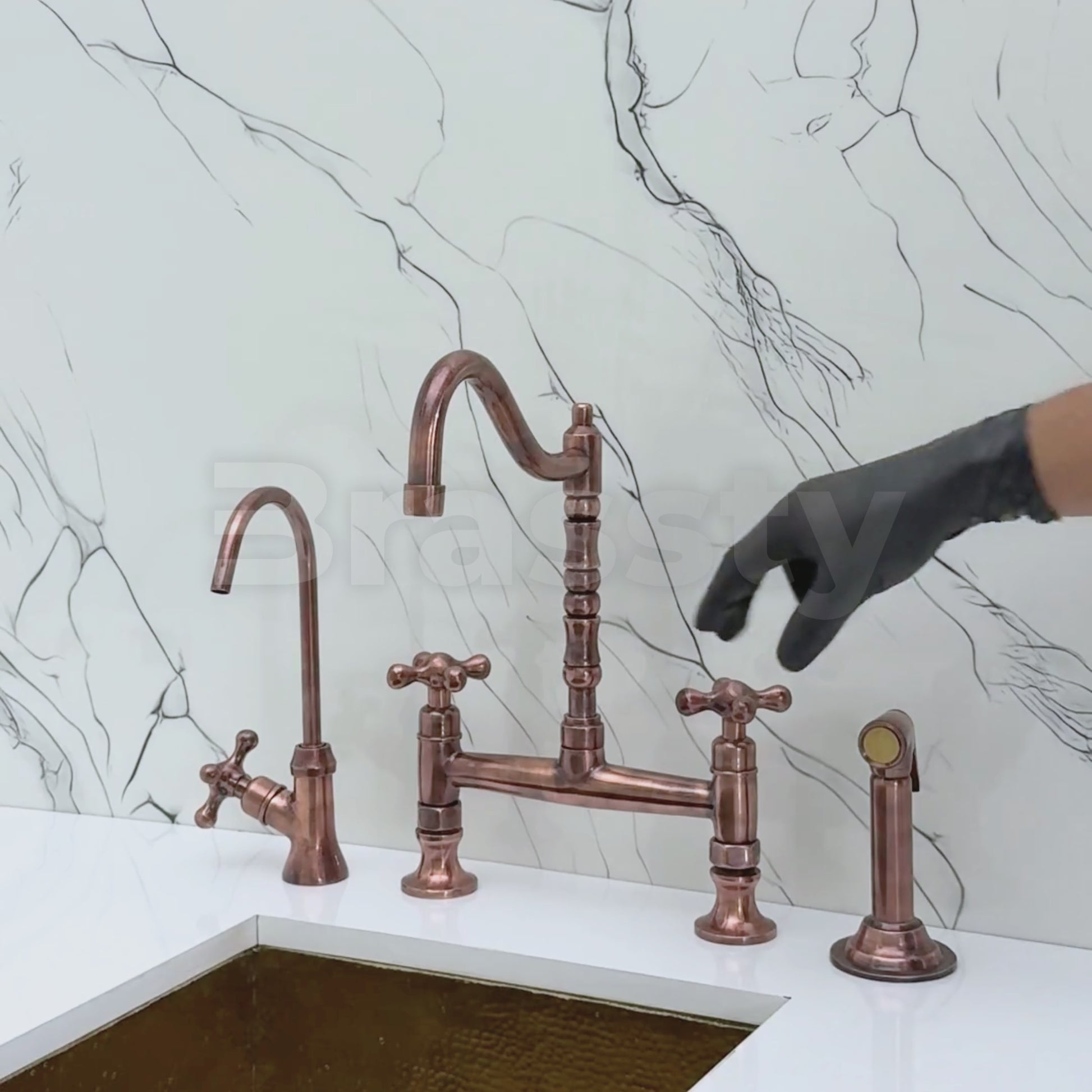 Victorian Kitchen Bridge Faucet in Antique Copper Finish blends traditional charm with modern utility. Featuring a striking antique copper finish over solid brass construction, it offers both durability and timeless character. The sculpted Victorian-style spout adds a timeless touch, echoing classic design traditions. A 360° swivel gooseneck spout ensures full sink coverage. Designed for practical elegance, it includes a high-pressure side sprayer and a dedicated drinking water tap. Cross handles provide smooth water control, and the antique copper finish resists corrosion and elevates any kitchen aesthetic.