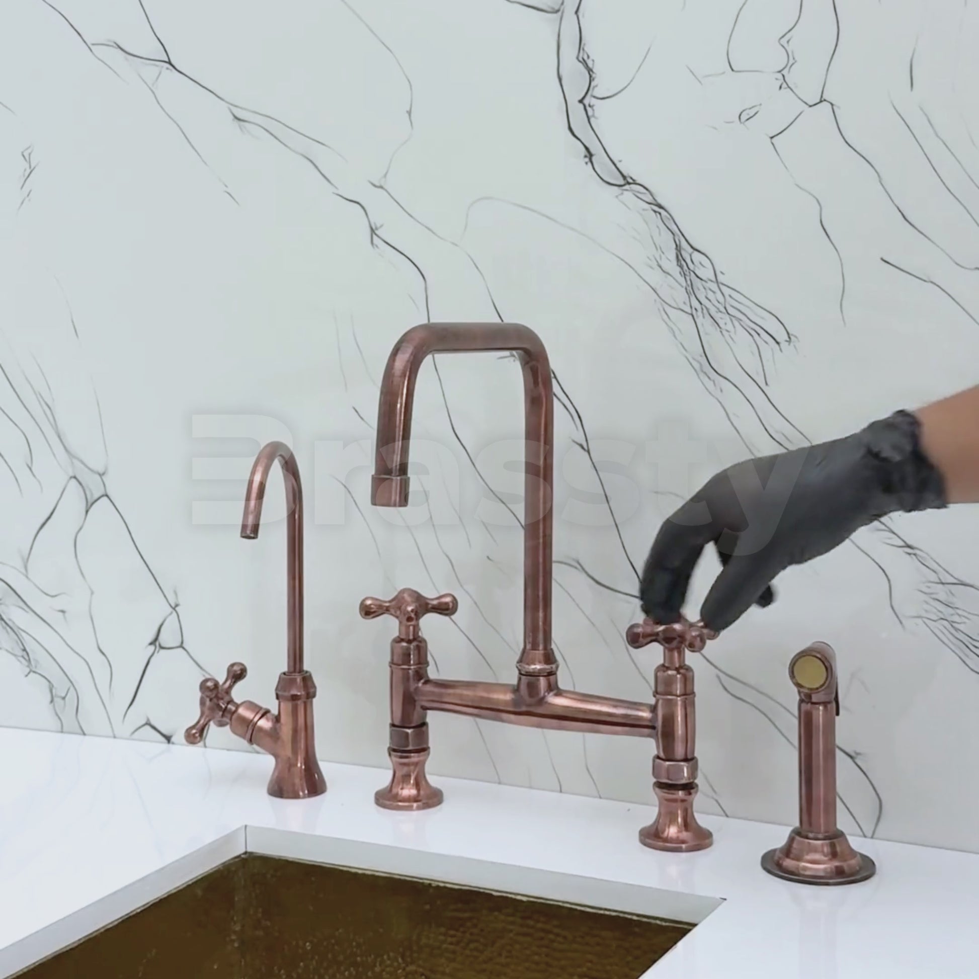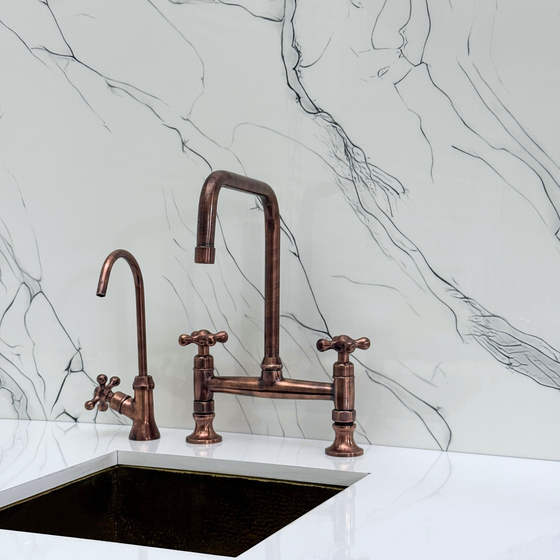Classic Kitchen Bridge Faucet in Antique Copper Finish blends traditional charm with modern utility. Featuring a striking antique copper finish over solid brass construction, it offers both durability and timeless character. A 360° swivel gooseneck spout ensures full sink coverage. Designed for practical elegance, it includes a high-pressure side sprayer and a dedicated drinking water tap. Cross handles provide smooth water control, and the antique copper finish resists corrosion and elevates any kitchen aesthetic.
