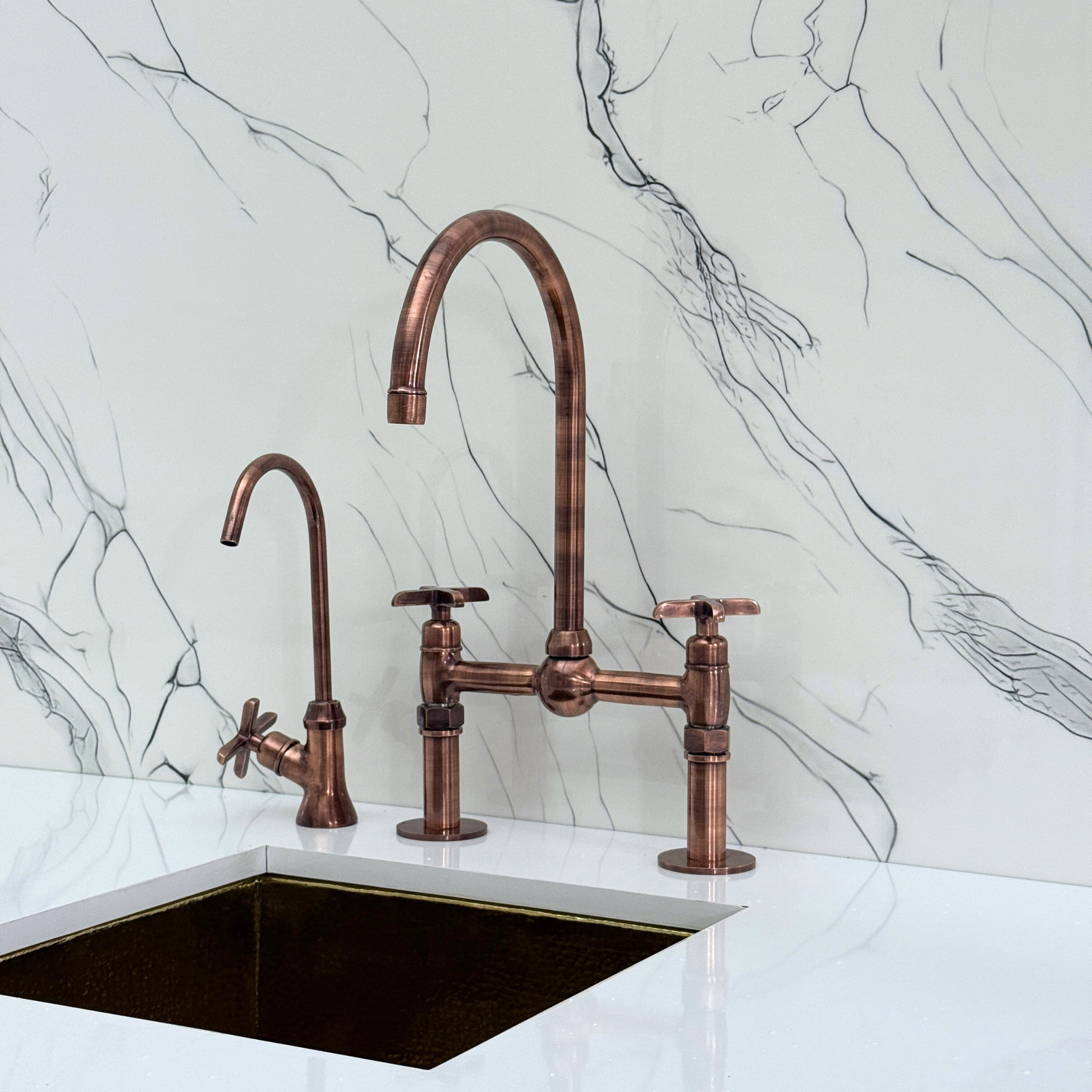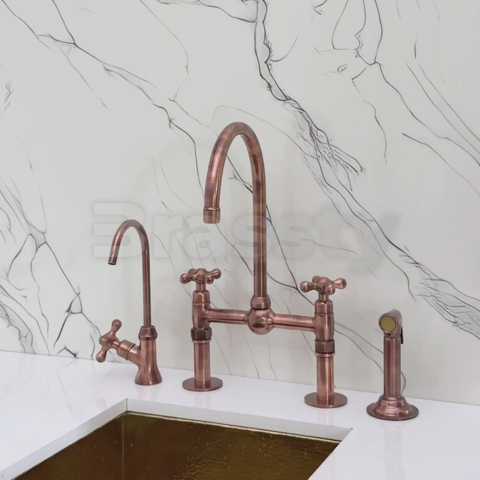 Kitchen Bridge Faucet with Ball Center in Antique Copper Finish blends traditional charm with modern utility. Featuring a striking antique copper finish over solid brass construction, it offers both durability and timeless character. The smooth ball center detail enhances visual symmetry and sophistication. A 360° swivel gooseneck spout ensures full sink coverage, while the straight-leg base delivers stability and classic geometry. Designed for practical elegance, it includes a high-pressure side sprayer and a dedicated drinking water tap. Cross handles provide smooth water control, and the antique copper finish resists corrosion and elevates any kitchen aesthetic.