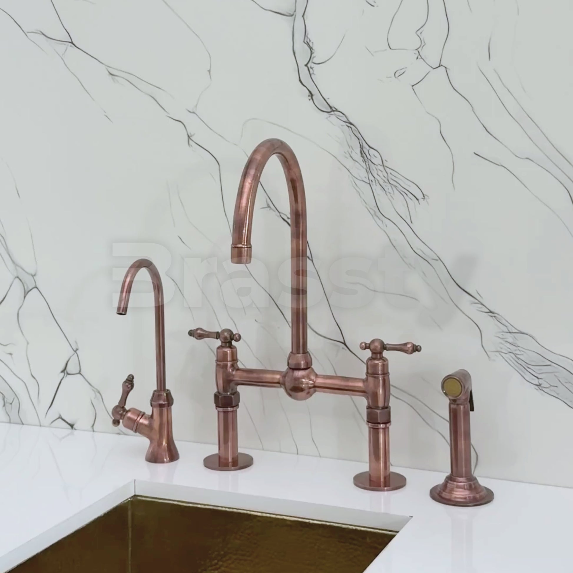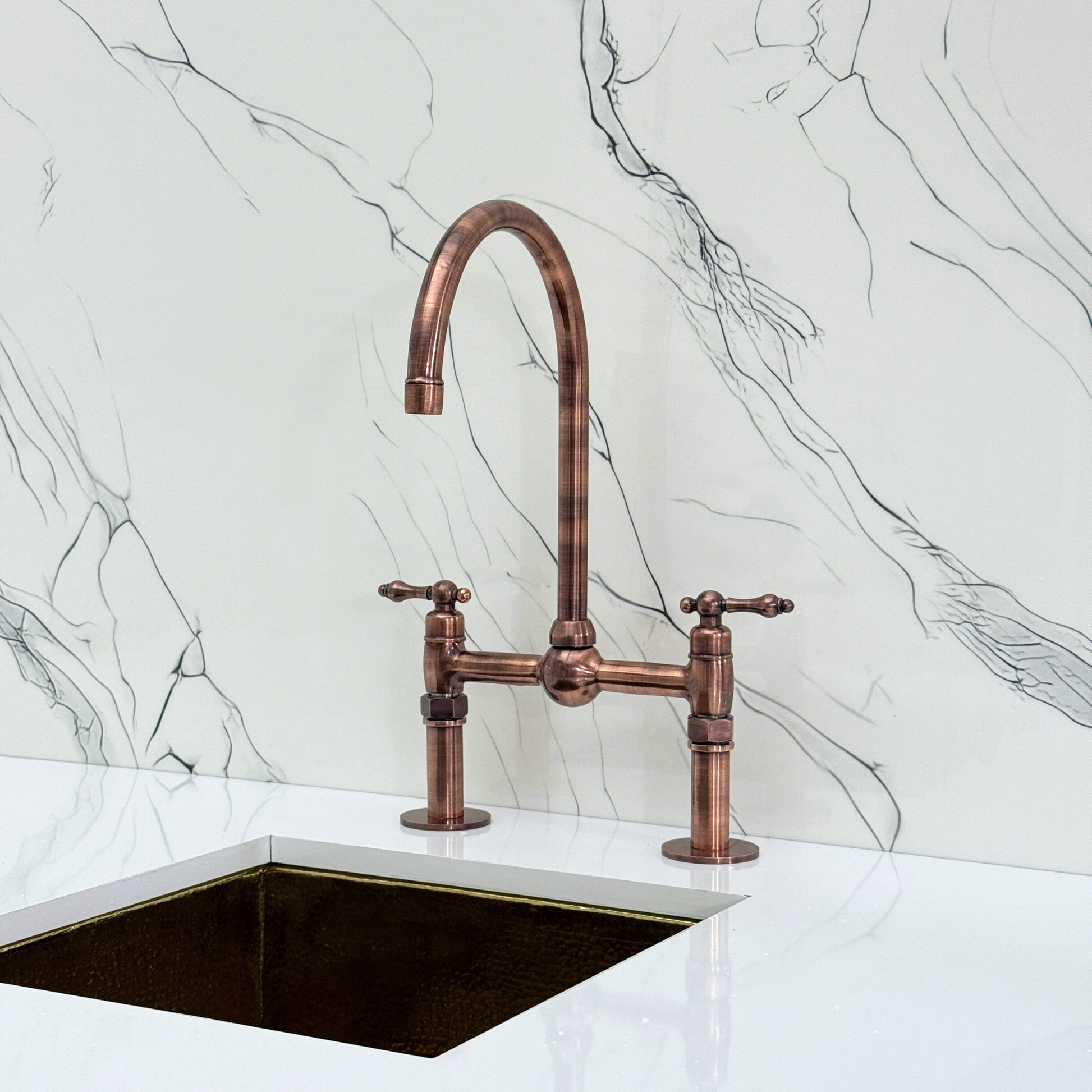 Kitchen Bridge Faucet with Ball Center in Antique Copper Finish blends traditional charm with modern utility. Featuring a striking antique copper finish over solid brass construction, it offers both durability and timeless character. The smooth ball center detail enhances visual symmetry and sophistication. A 360° swivel gooseneck spout ensures full sink coverage, while the straight-leg base delivers stability and classic geometry. Designed for practical elegance, it includes a high-pressure side sprayer and a dedicated drinking water tap. Lever handles provide smooth water control, and the antique copper finish resists corrosion and elevates any kitchen aesthetic.