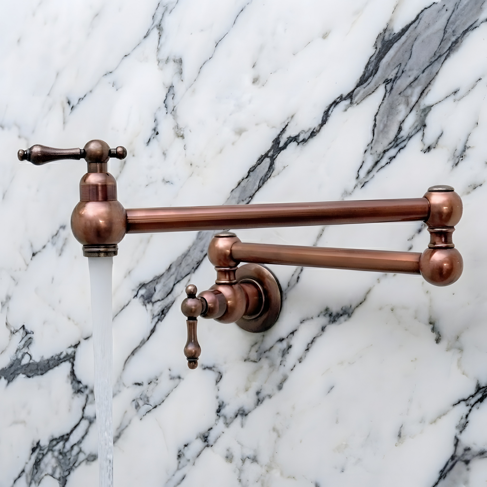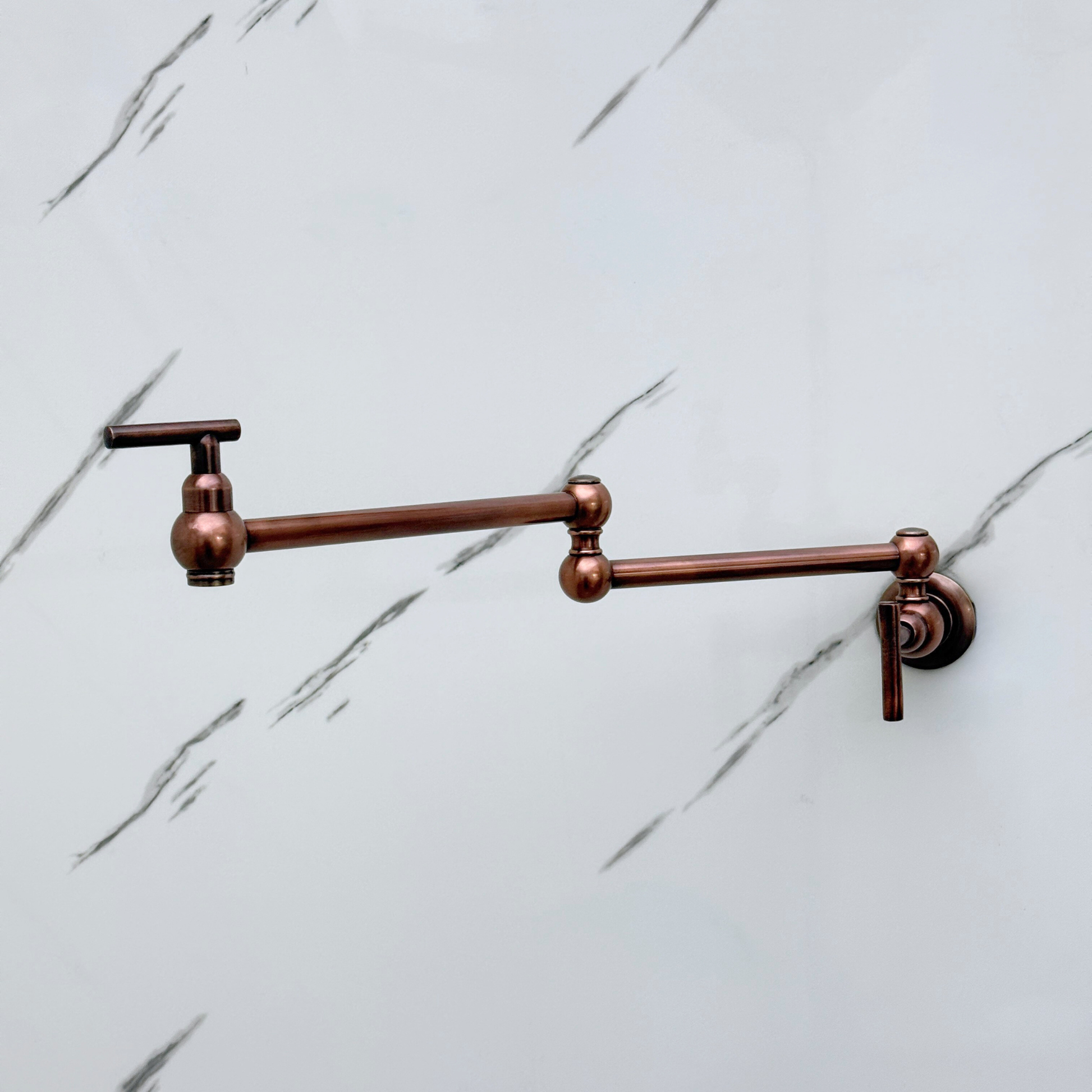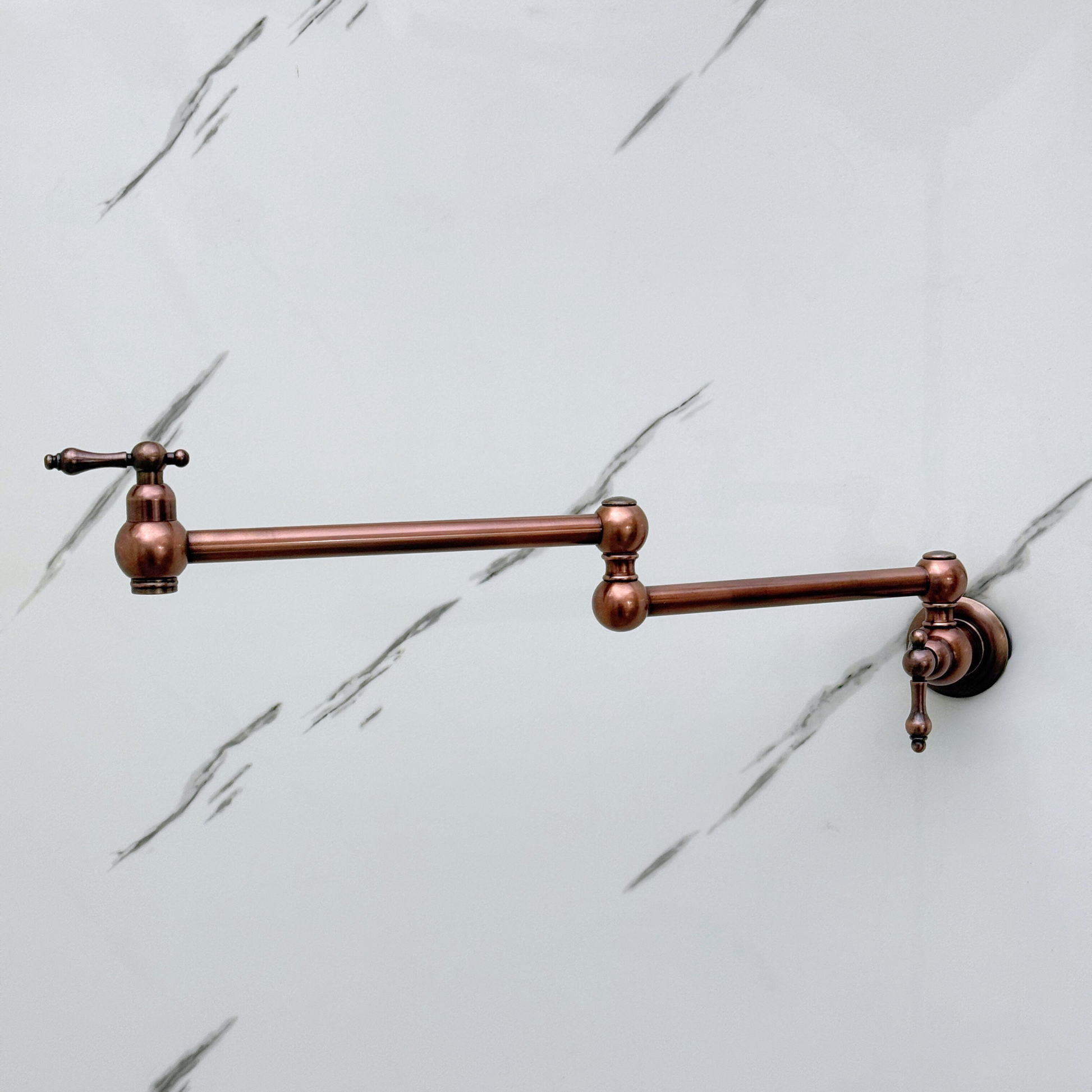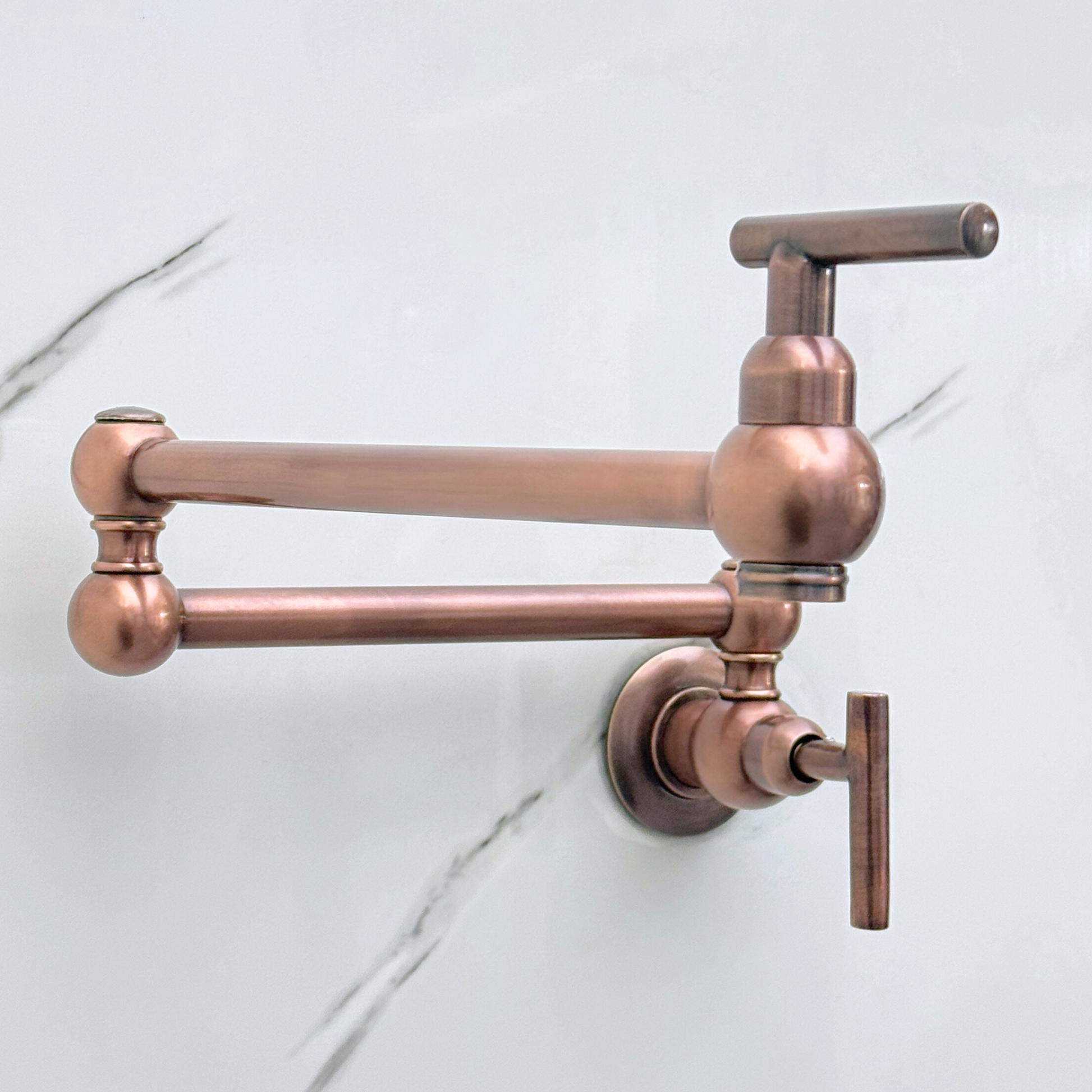 Antique Copper Pot Filler combines artisanal quality with everyday efficiency, designed for kitchens that value beauty. Featuring a striking antique copper finish over solid brass construction. The double-jointed swing arm ensures full stove coverage and folds away for a space-saving design. With smooth lever handles for precise water control, this faucet remains durable, corrosion-resistant, and simple to maintain.