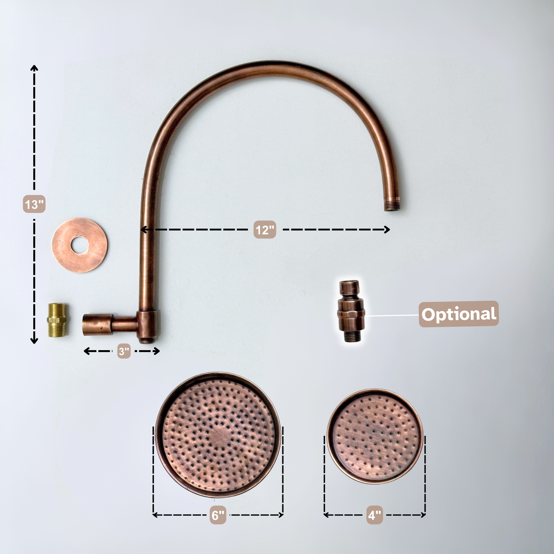 This Antique Copper Rain Shower Head with Arcuate Arm is crafted from premium solid brass and finished in a striking antique copper tone that brings warmth and timeless character to any bathroom. The round rain shower head delivers a soothing rainfall effect, while the gracefully curved arcuate arm provides extended reach and balanced overhead water coverage. An optional Adjustable Shower Head Connector is available, allowing you to customize the shower angle for added comfort and precision.