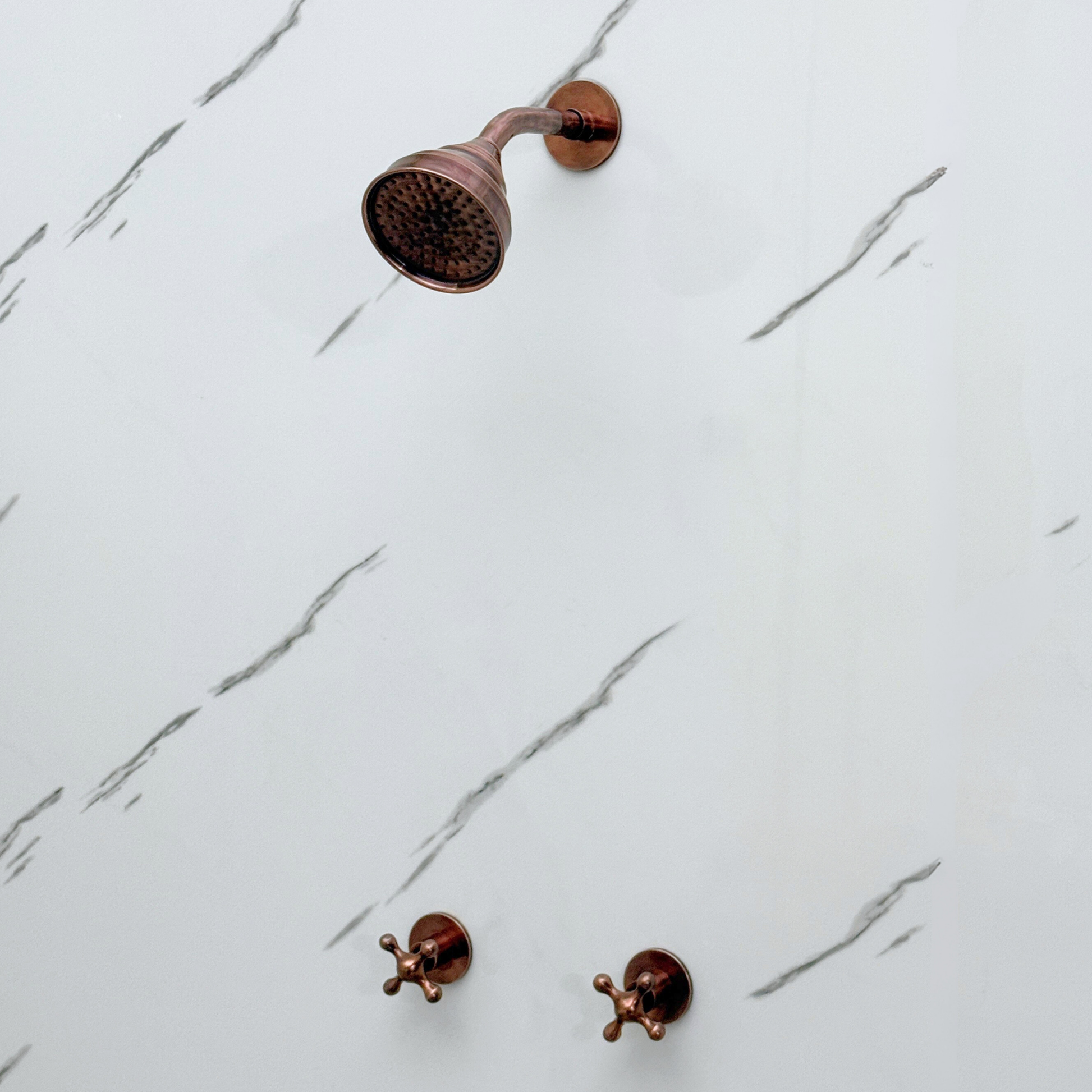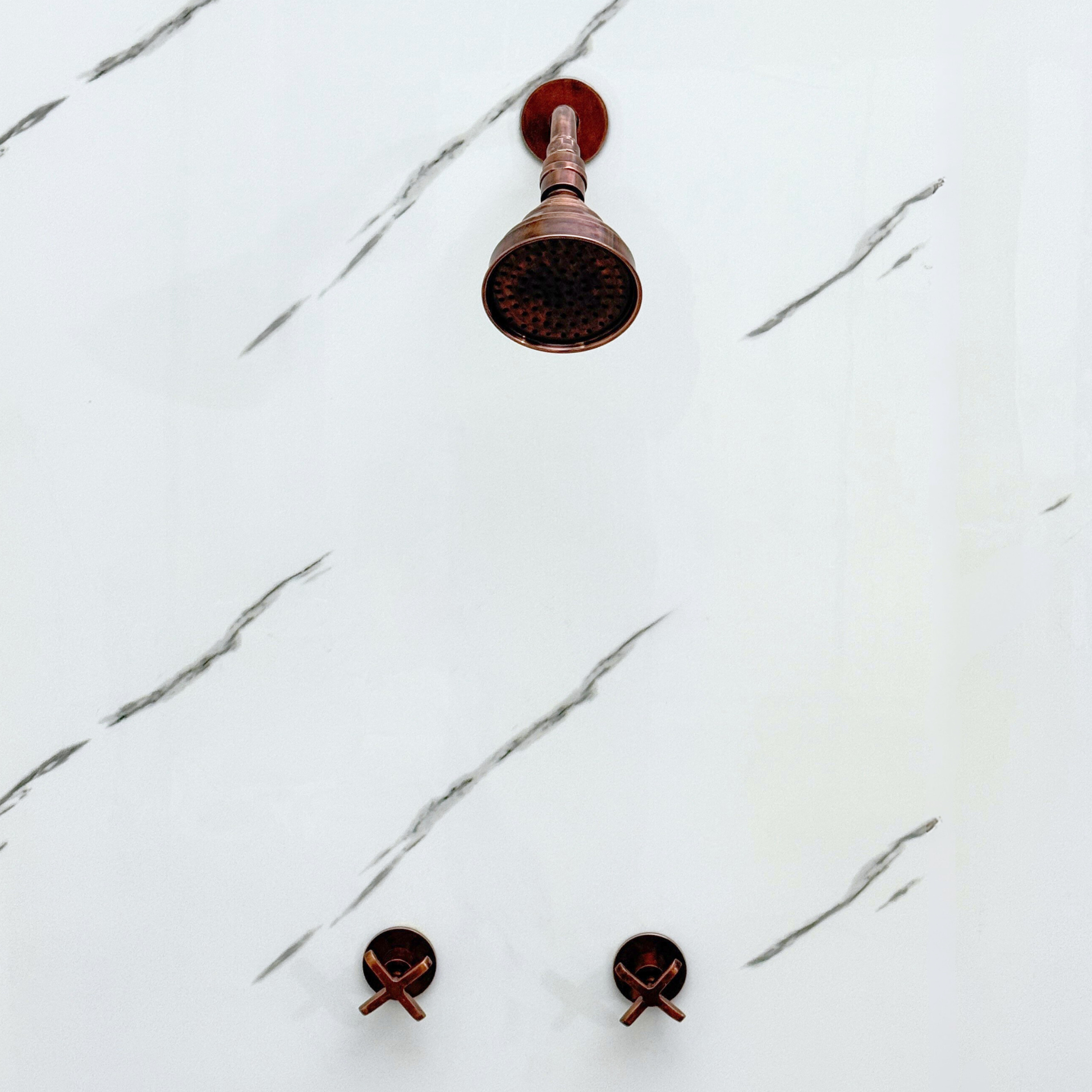 This wall-mounted shower system features a striking antique copper finish over solid brass construction, combining elegance with lasting durability. The brass arm supports a round rain shower head for a soothing rainfall effect, while the cross handles provide precise water control for an effortless and timeless shower experience. An optional Adjustable Shower Head Connector is available, allowing you to customize the shower angle for added comfort.