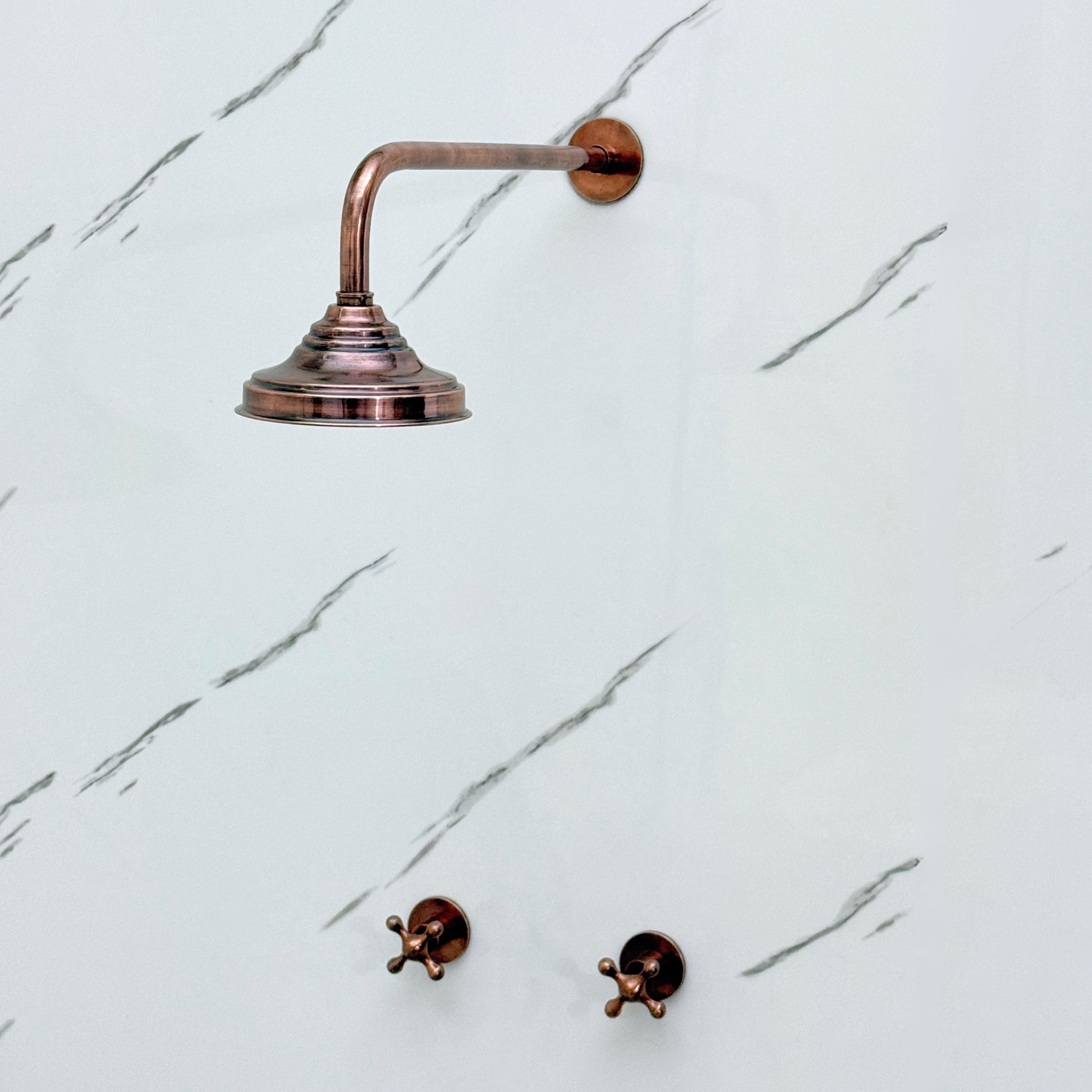 This wall-mounted shower system features a striking antique copper finish over solid brass construction, combining elegance with lasting durability. The straight arm supports a round rain shower head for a soothing rainfall effect, while the cross handles provide precise water control for an effortless and timeless shower experience. An optional Adjustable Shower Head Connector is available, allowing you to customize the shower angle for added comfort.