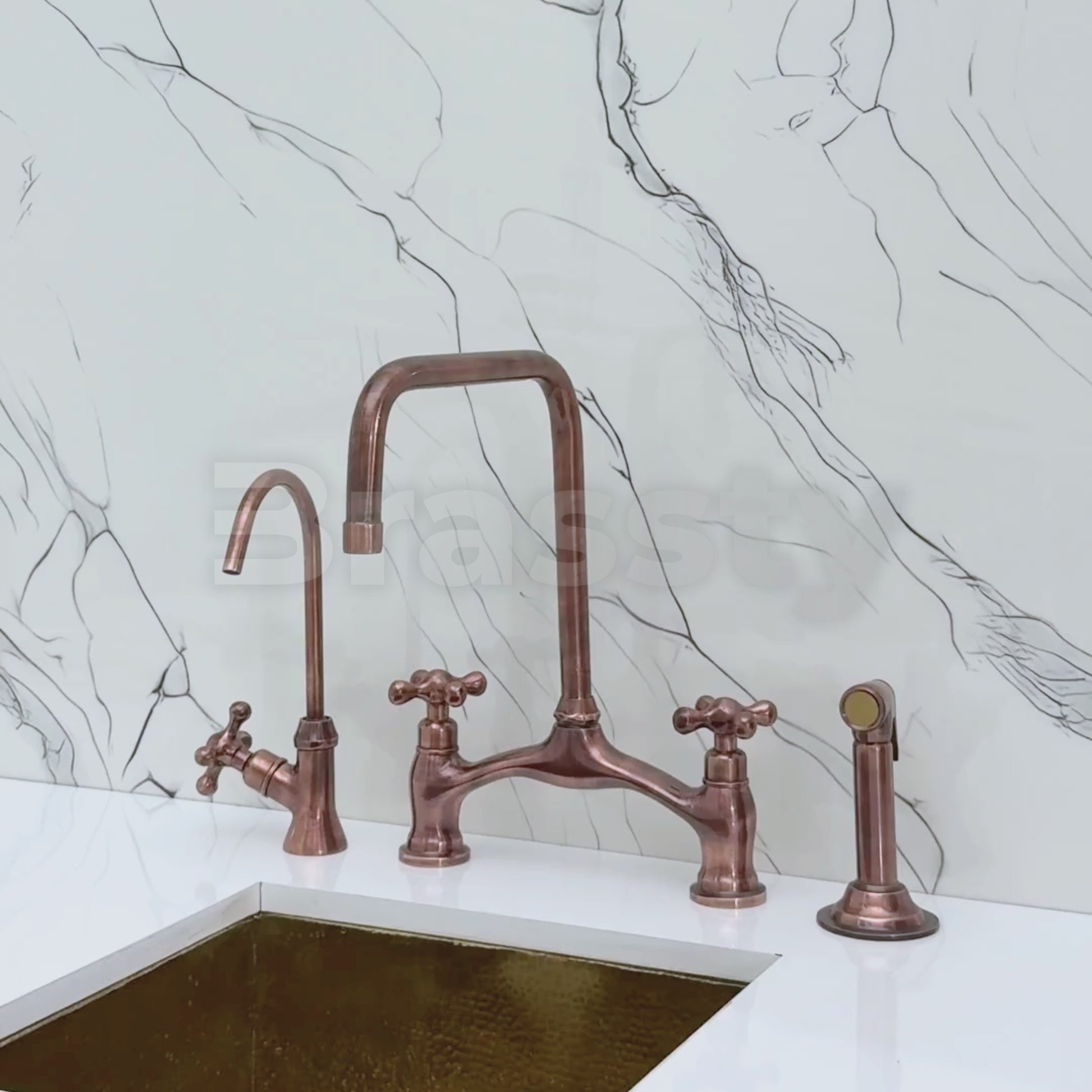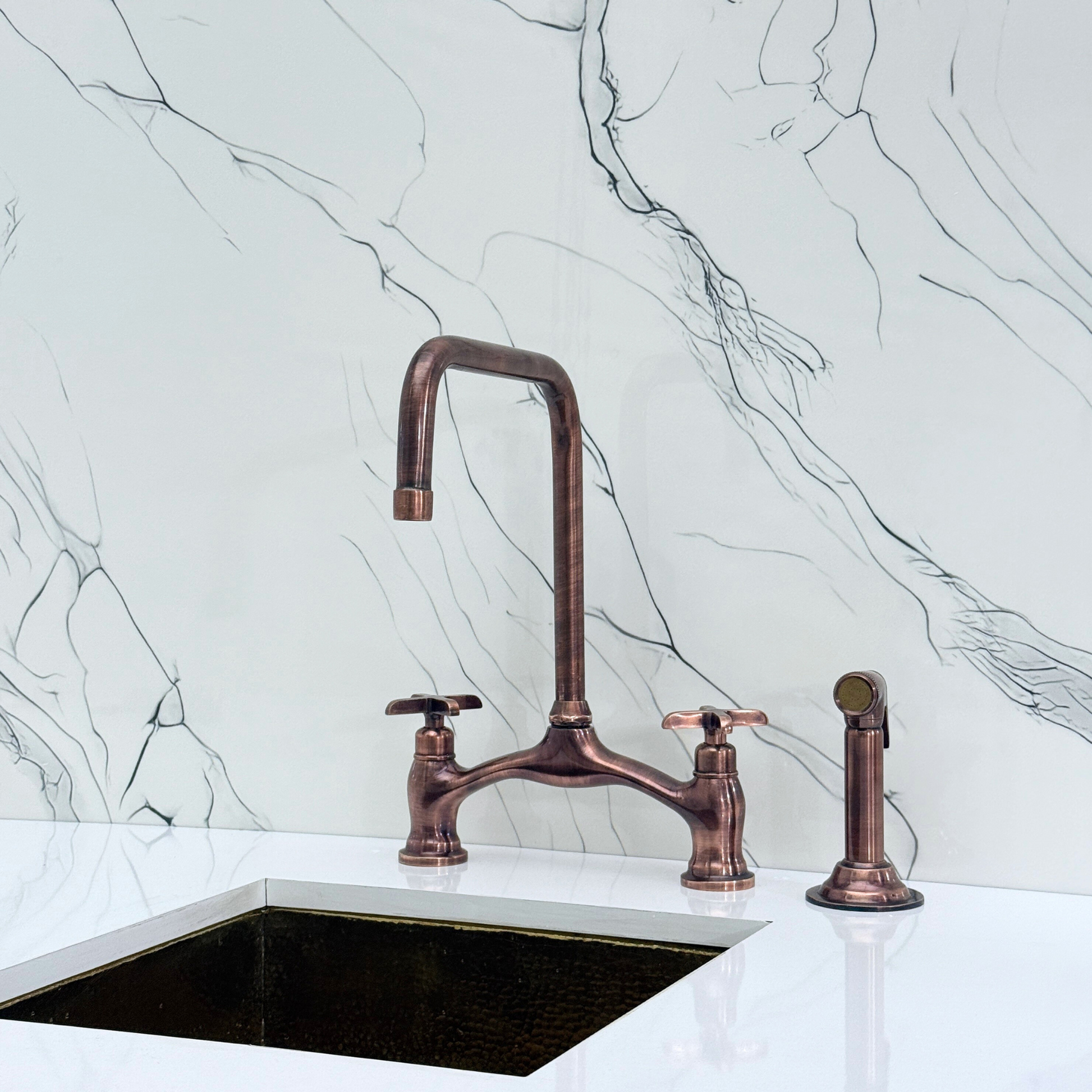 Vintage Bridge Kitchen Faucet in Antique Copper Finish blends traditional charm with modern utility. Featuring a striking antique copper finish over solid brass construction, it offers both durability and timeless character. A 360° swivel gooseneck spout ensures full sink coverage. Designed for practical elegance, it includes a high-pressure side sprayer and a dedicated drinking water tap. Cross handles provide smooth water control, and the antique copper finish resists corrosion and elevates any kitchen aesthetic.