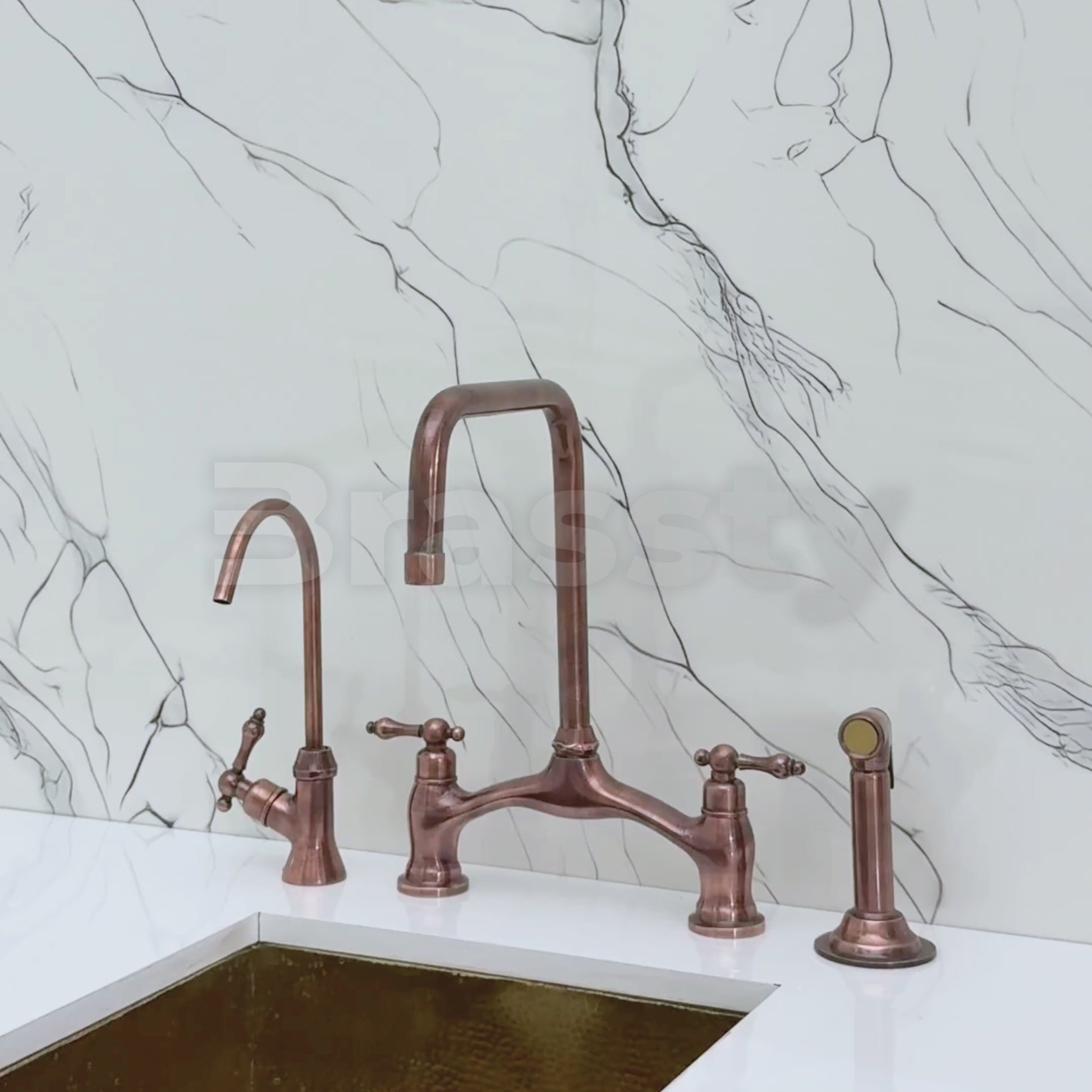 Vintage Bridge Kitchen Faucet in Antique Copper Finish blends traditional charm with modern utility. Featuring a striking antique copper finish over solid brass construction, it offers both durability and timeless character. A 360° swivel gooseneck spout ensures full sink coverage. Designed for practical elegance, it includes a high-pressure side sprayer and a dedicated drinking water tap. Lever handles provide smooth water control, and the antique copper finish resists corrosion and elevates any kitchen aesthetic.