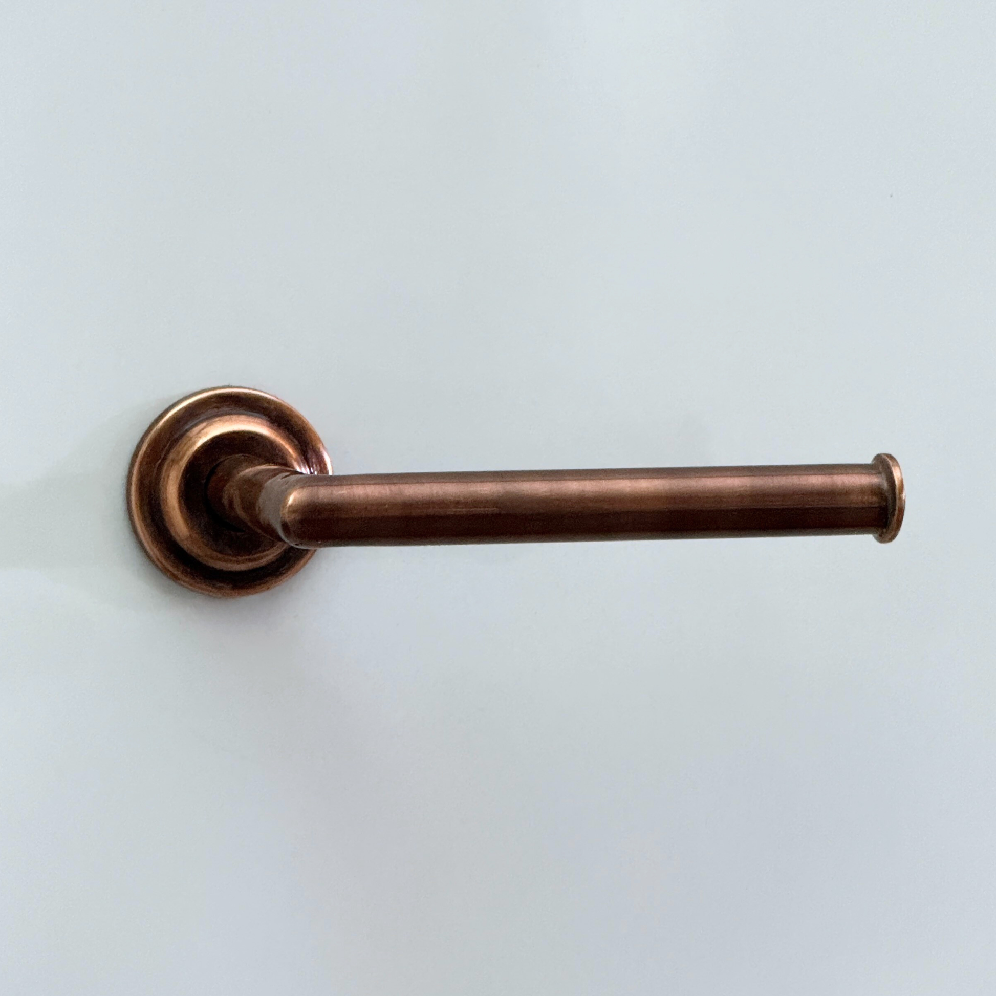Antique Copper toilet paper holder crafted from premium solid brass, finished in a warm antique copper tone. Designed to resist corrosion while offering lasting durability, its sleek wall-mounted form blends timeless elegance and functionality, perfect for both modern and classic bathrooms.