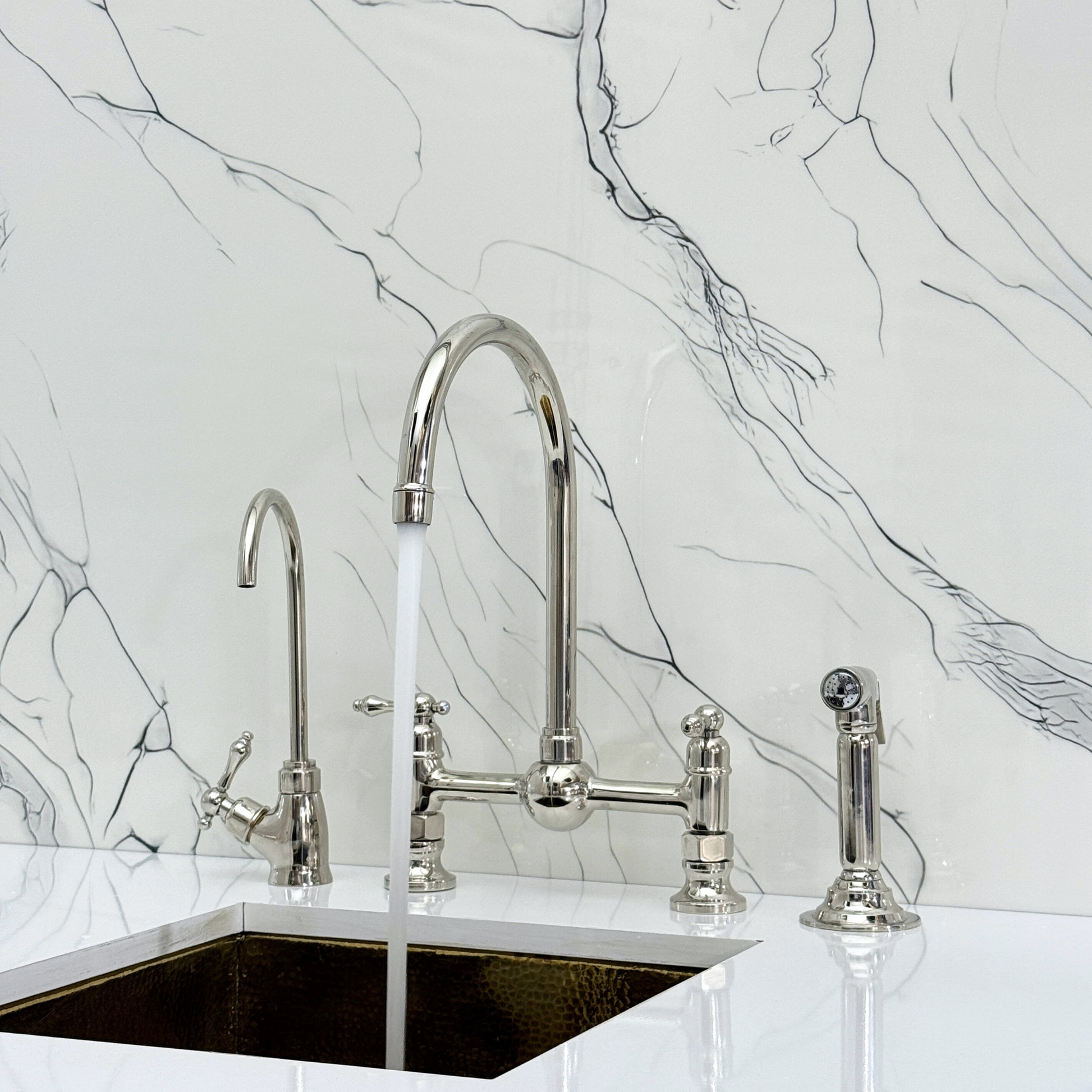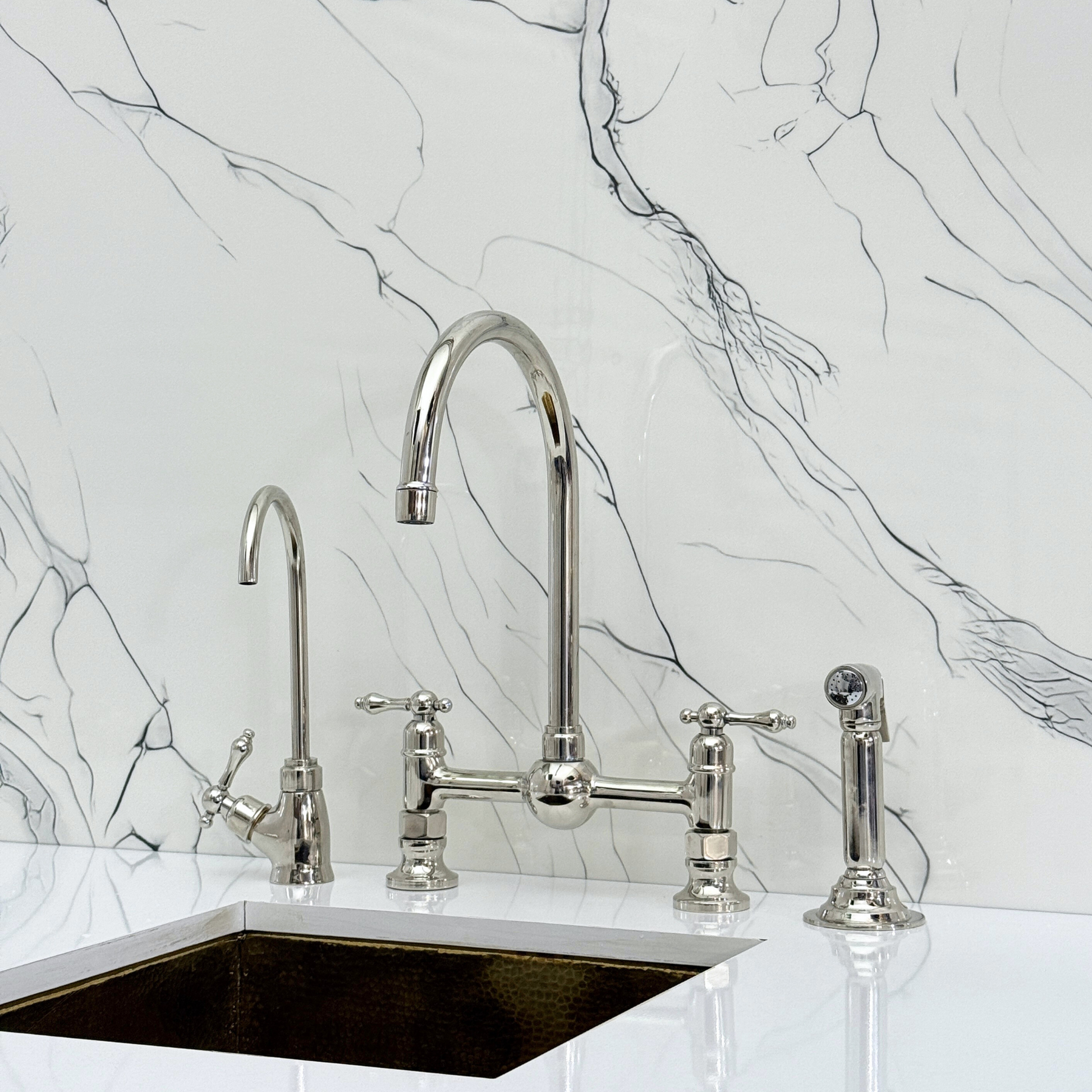 Kitchen Bridge Faucet with Ball Center in Polished Nickel Finish blends traditional charm with modern utility. Featuring a striking a polished nickel finish over solid brass construction, it offers both durability and timeless character. The smooth ball center detail enhances visual symmetry and sophistication. A 360° swivel gooseneck spout ensures full sink coverage. Designed for practical elegance, it includes a high-pressure side sprayer and a dedicated drinking water tap. Lever handles provide smooth water control, and the polished nickel finish resists corrosion and elevates any kitchen aesthetic.
