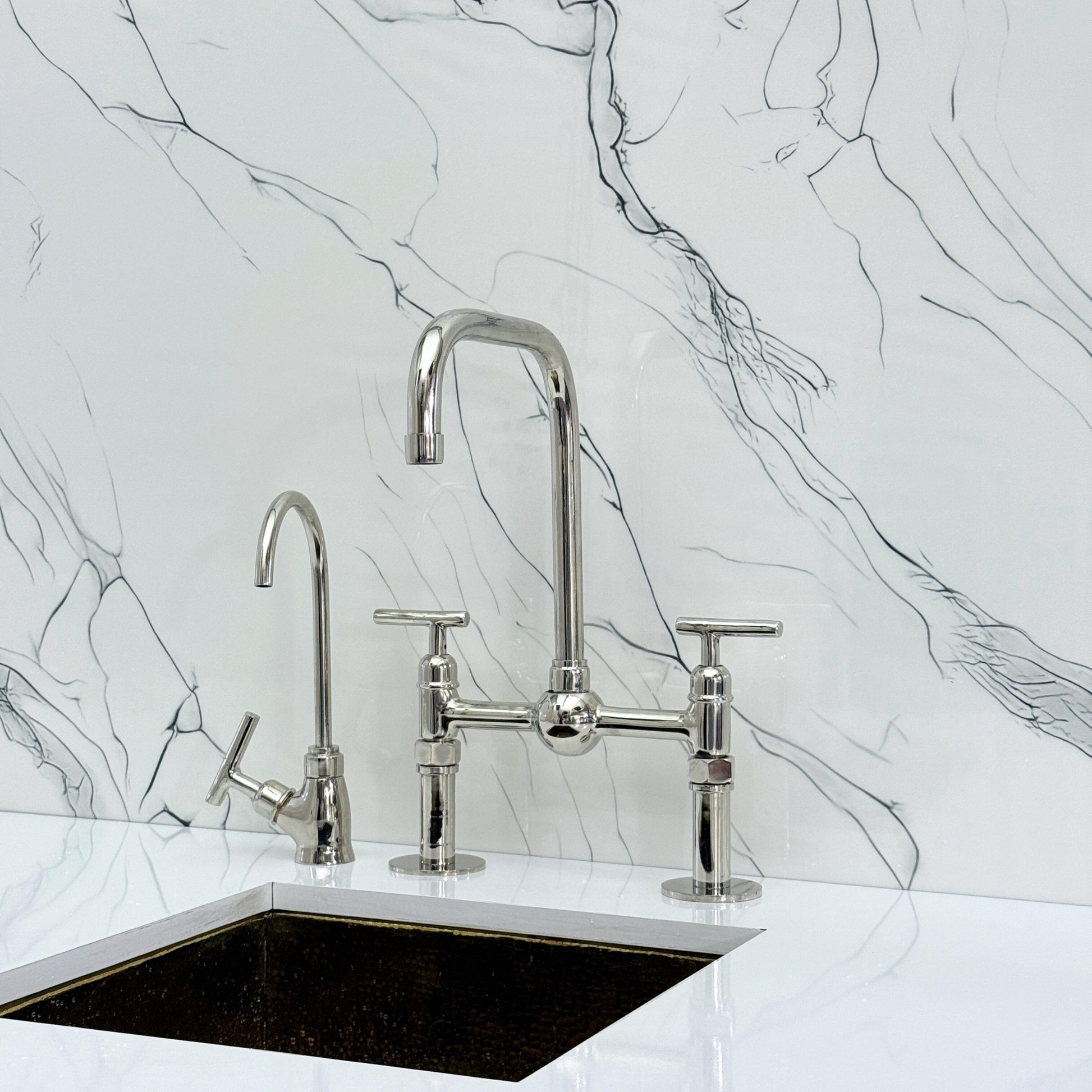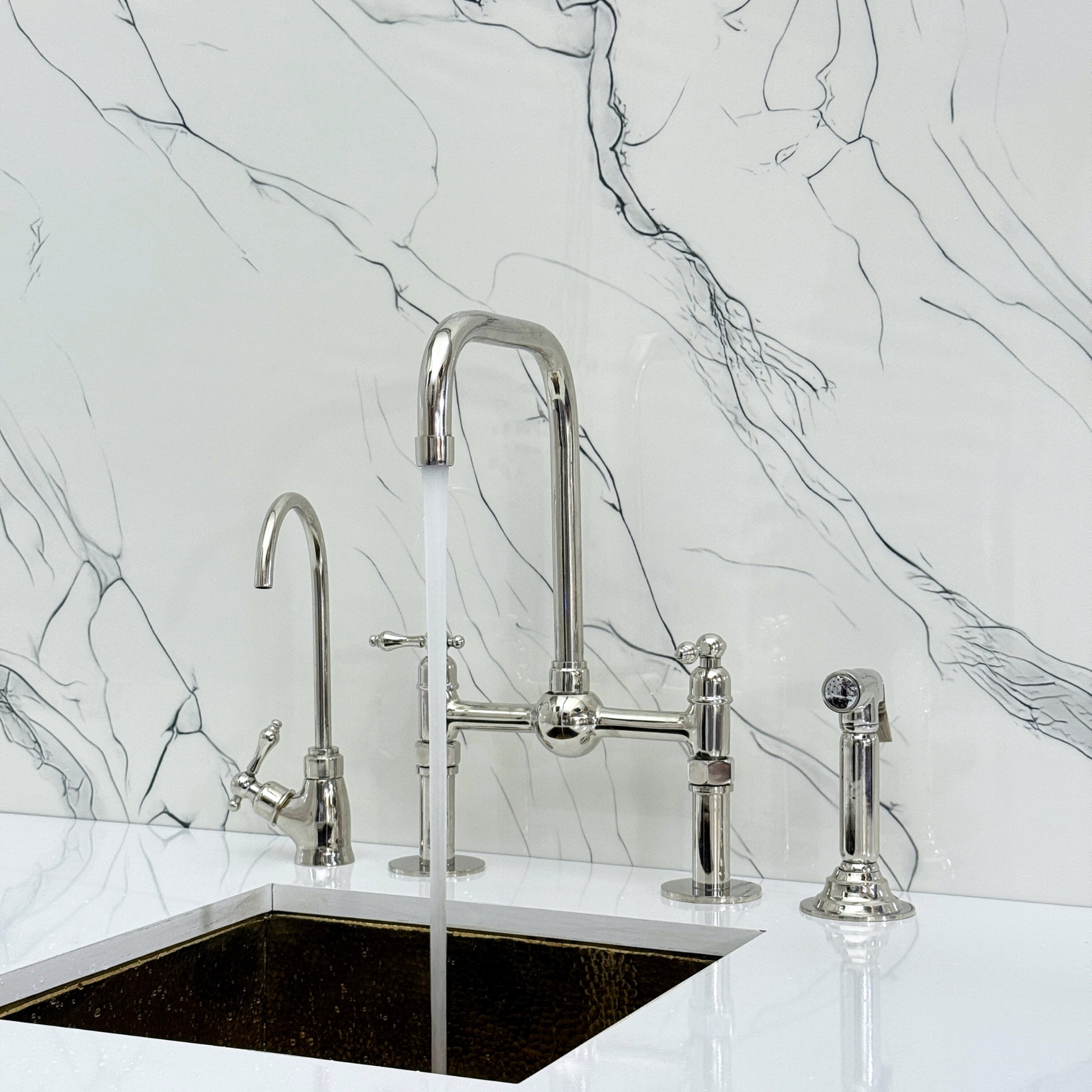 Kitchen Bridge Faucet with Ball Center in Polished Nickel Finish blends traditional charm with modern utility. Featuring a striking polished nickel finish over solid brass construction, it offers both durability and timeless character. The sculpted Classic-style spout adds a timeless touch, echoing classic design traditions. The smooth ball center detail enhances visual symmetry and sophistication. A 360° swivel gooseneck spout ensures full sink coverage. Designed for practical elegance, it includes a high-pressure side sprayer and a dedicated drinking water tap. Lever handles provide smooth water control, and the polished nickel finish resists corrosion and elevates any kitchen aesthetic.