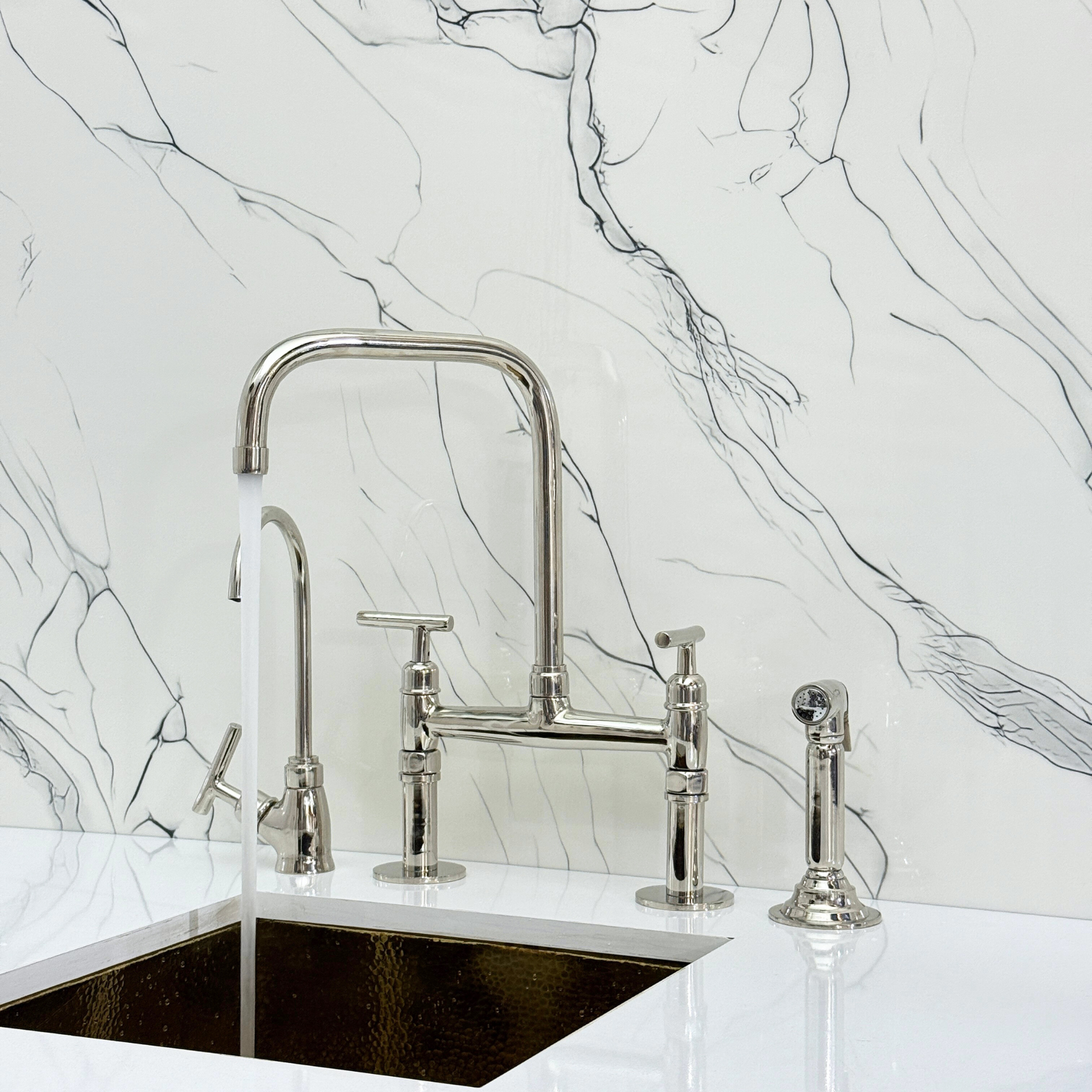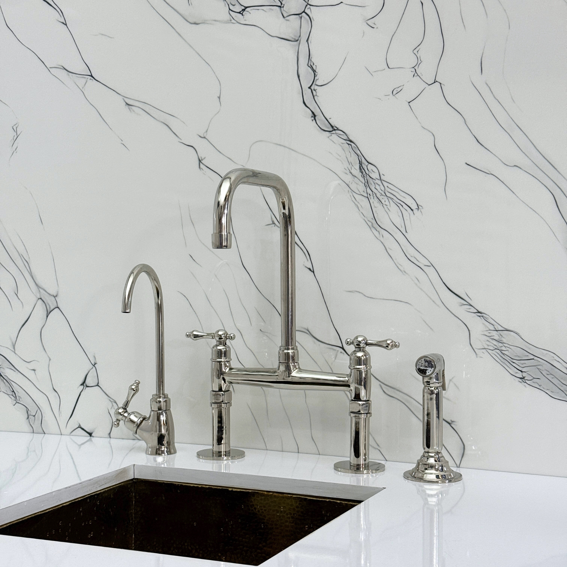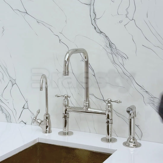 Classic Kitchen Bridge Faucet with Straight Legs in Polished Nickel Finish blends traditional charm with modern utility. Featuring a striking polished nickel finish over solid brass construction, it offers both durability and timeless character. A 360° swivel gooseneck spout ensures full sink coverage. Designed for practical elegance, it includes a high-pressure side sprayer and a dedicated drinking water tap. Lever handles provide smooth water control, and the polished nickel finish resists corrosion and elevates any kitchen aesthetic.