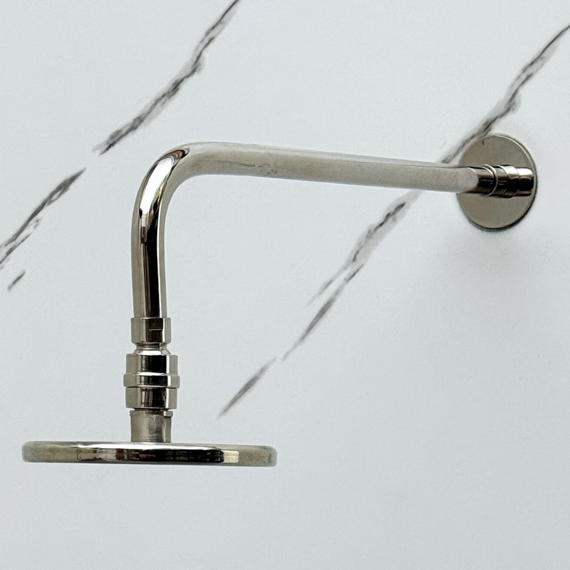 This Polished Nickel Rain Shower Head with Straight Arm is crafted from premium solid brass and finished in a sleek polished nickel tone that delivers a clean, refined look with timeless appeal for any bathroom. The flat round rain shower head delivers a soothing rainfall effect, while the clean, straight shower arm provides a streamlined profile with consistent overhead water coverage. An Adjustable Shower Head Connector is available, allowing you to customize the shower angle for added comfort and precision.