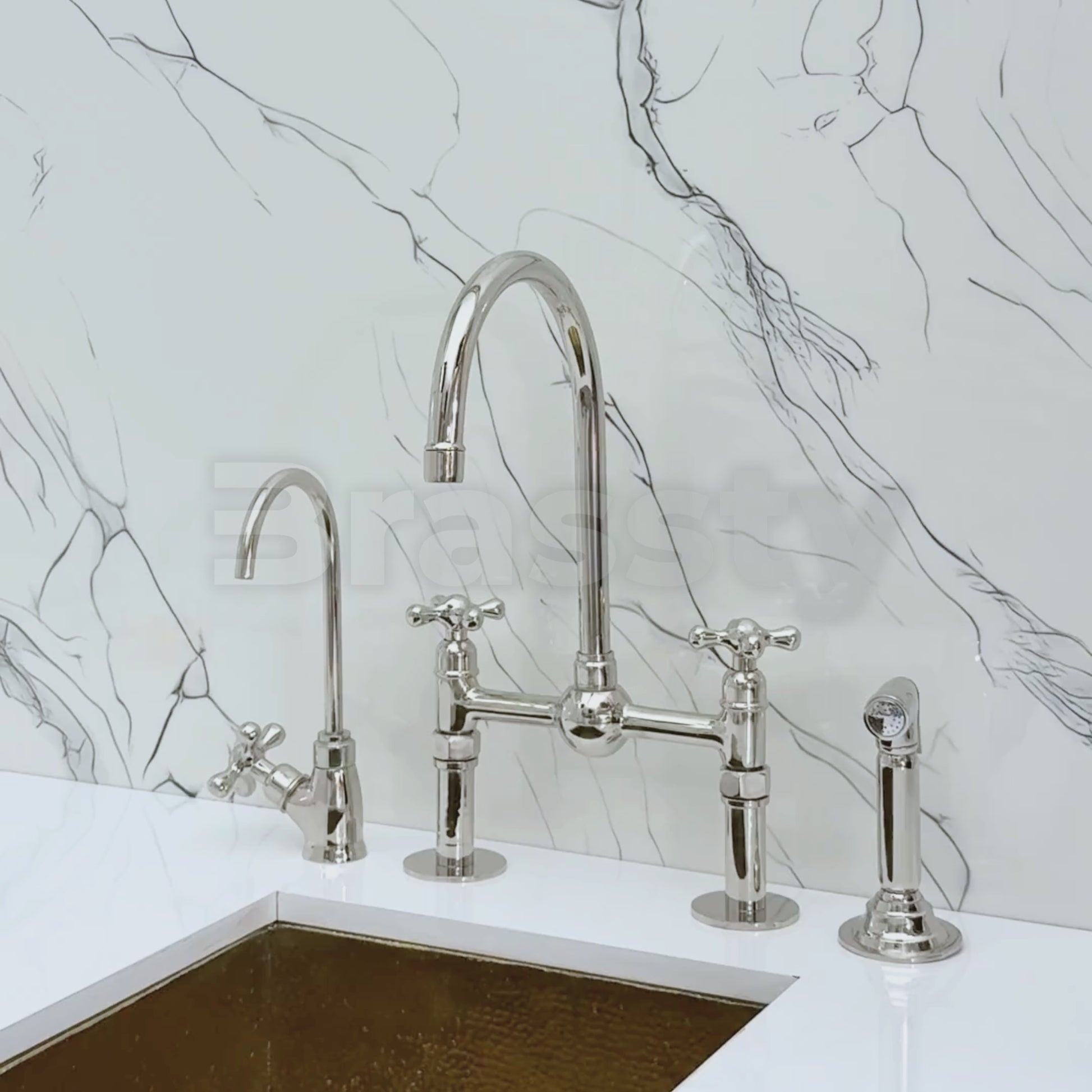 Kitchen Bridge Faucet with Ball Center in Polished Nickel Finish blends traditional charm with modern utility. Featuring a striking polished nickel finish over solid brass construction, it offers both durability and timeless character. The smooth ball center detail enhances visual symmetry and sophistication. A 360° swivel gooseneck spout ensures full sink coverage, while the straight-leg base delivers stability and classic geometry. Designed for practical elegance, it includes a high-pressure side sprayer and a dedicated drinking water tap. Cross handles provide smooth water control, and the polished nickel finish resists corrosion and elevates any kitchen aesthetic.