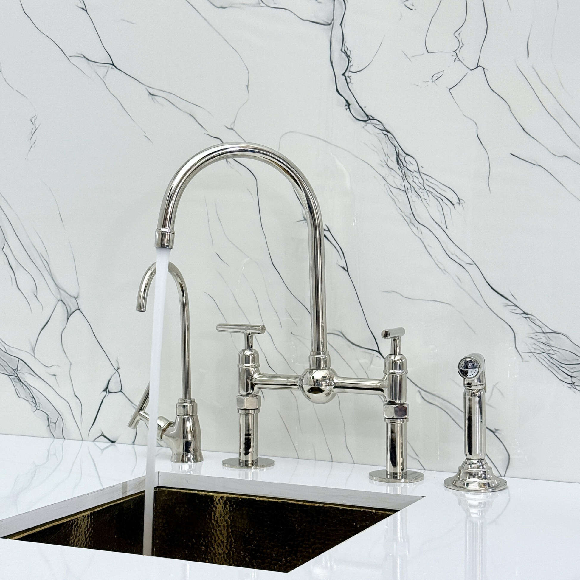 Kitchen Bridge Faucet with Ball Center in Polished Nickel Finish blends traditional charm with modern utility. Featuring a striking polished nickel finish over solid brass construction, it offers both durability and timeless character. The smooth ball center detail enhances visual symmetry and sophistication. A 360° swivel gooseneck spout ensures full sink coverage, while the straight-leg base delivers stability and classic geometry. Designed for practical elegance, it includes a high-pressure side sprayer and a dedicated drinking water tap. Lever handles provide smooth water control, and the polished nickel finish resists corrosion and elevates any kitchen aesthetic.