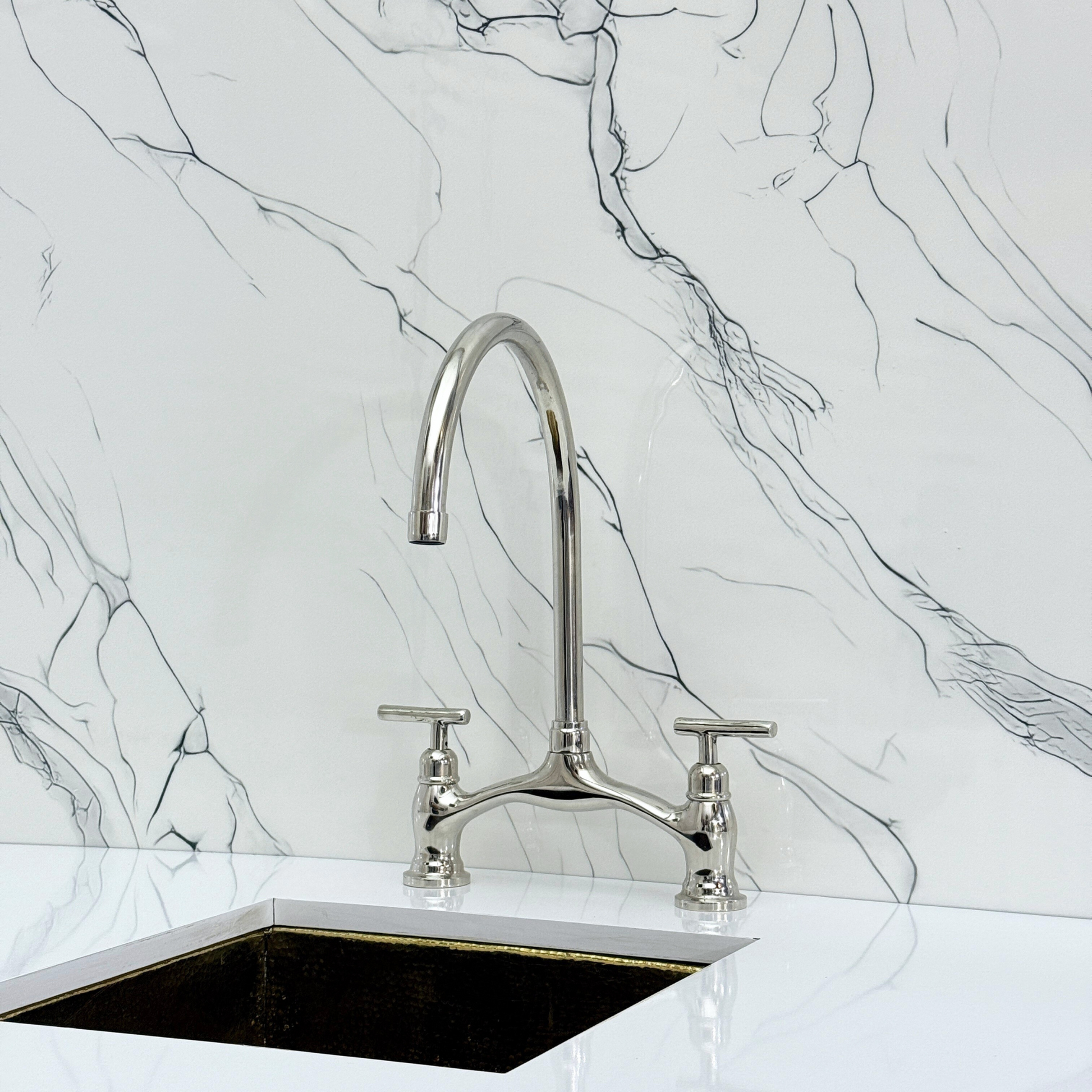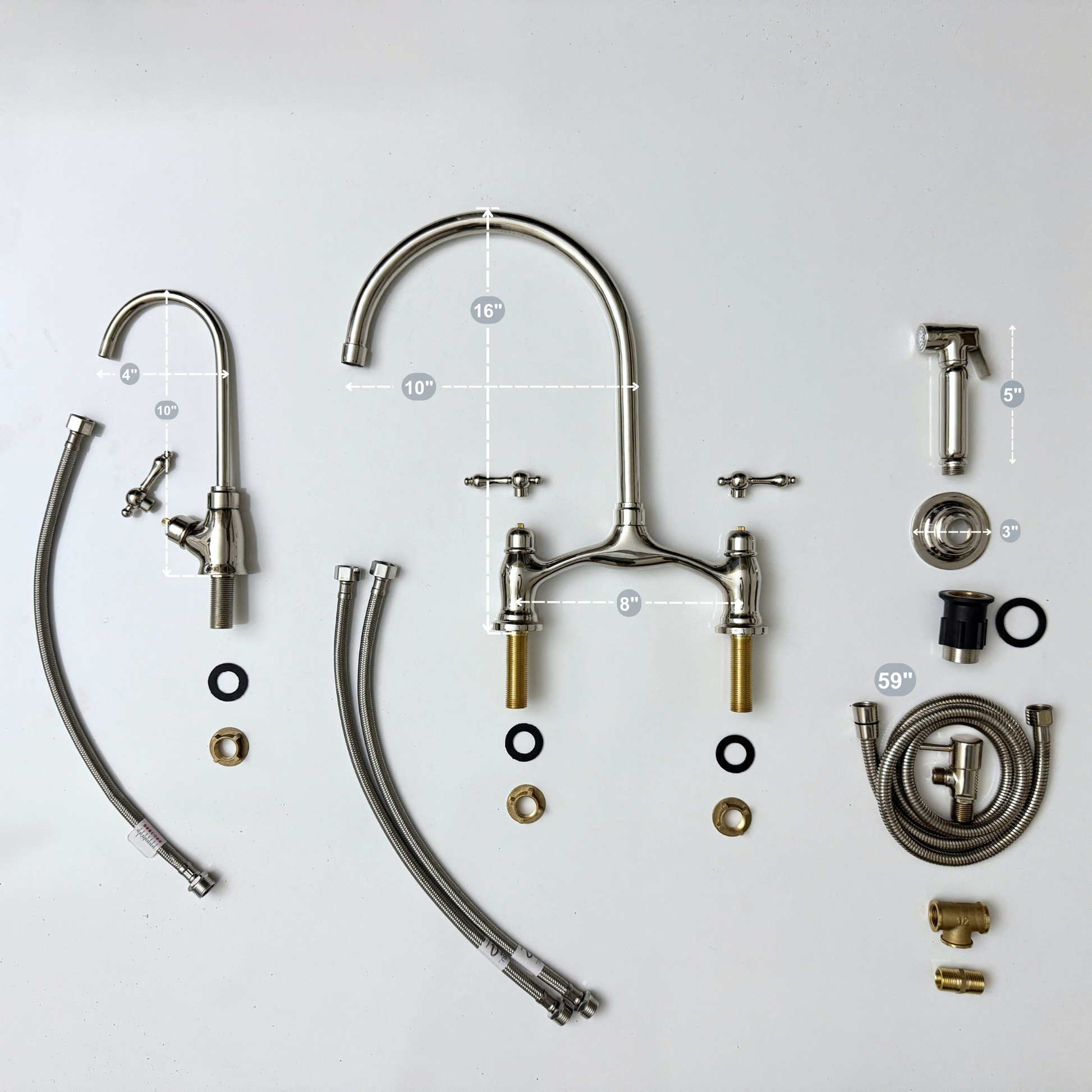 Kitchen Bridge Faucet in Polished Nickel Finish blends traditional charm with modern utility. Featuring a striking polished nickel finish over solid brass construction, it offers both durability and timeless character. A 360° swivel gooseneck spout with a 10" reach ensures full sink coverage. Designed for practical elegance, it includes a high-pressure side sprayer and a dedicated drinking water tap. Lever handles provide smooth water control, and the polished nickel finish resists corrosion and elevates any kitchen aesthetic.