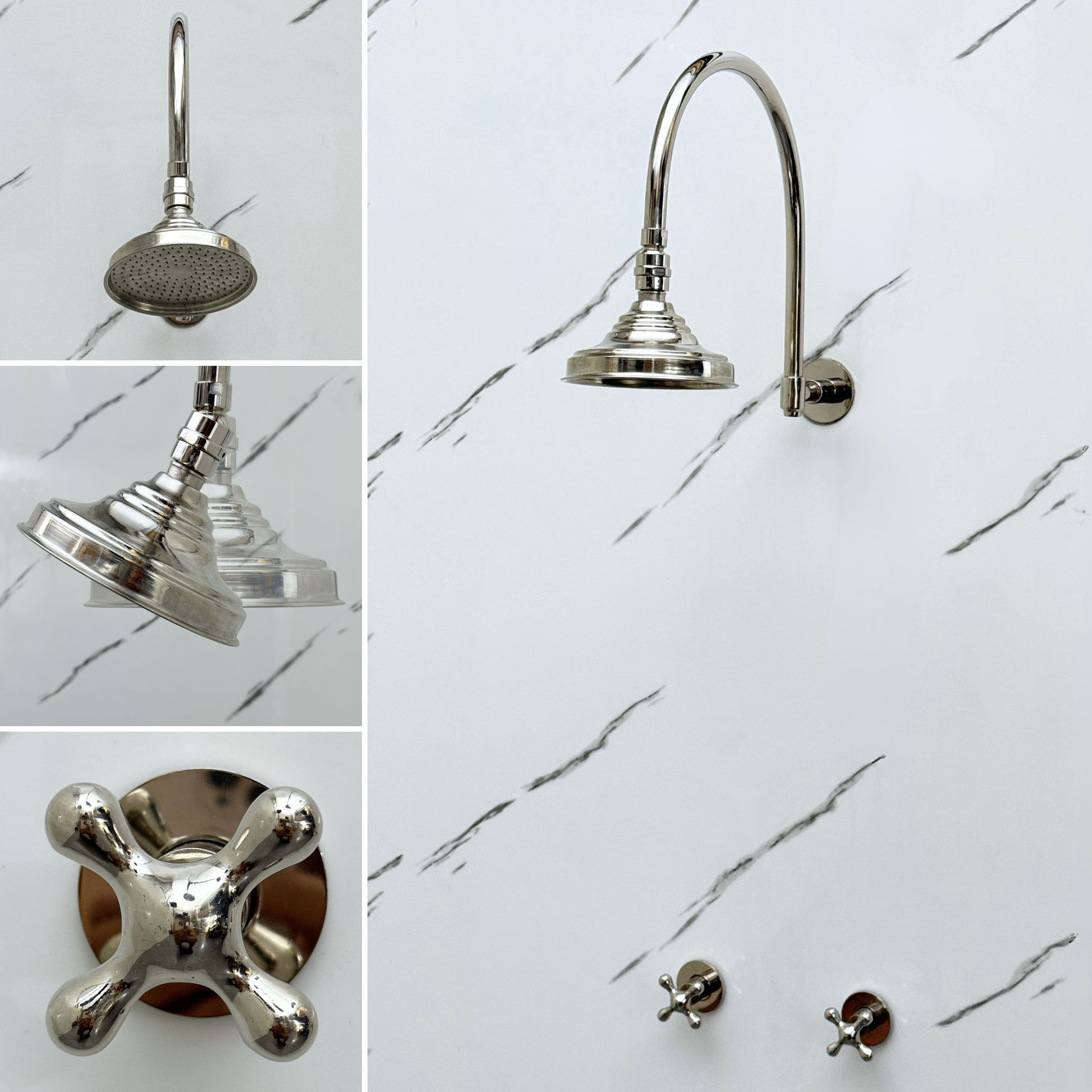 This wall-mounted shower system features a striking polished nickel finish over solid brass construction, combining elegance with lasting durability. The arcuate arm supports a round rain shower head for a soothing rainfall effect, while the cross handles provide precise water control for an effortless and timeless shower experience. An optional Adjustable Shower Head Connector is available, allowing you to customize the shower angle for added comfort.