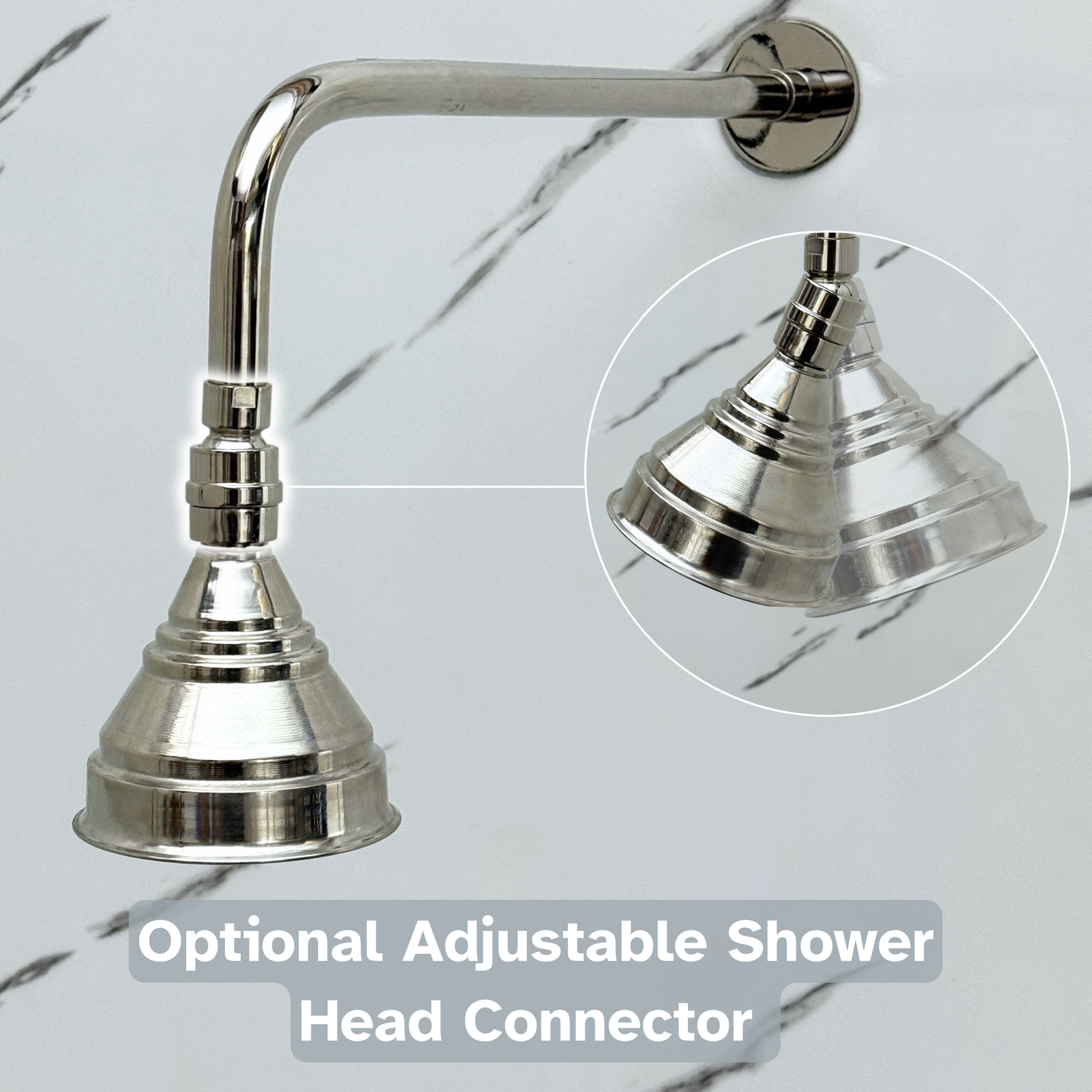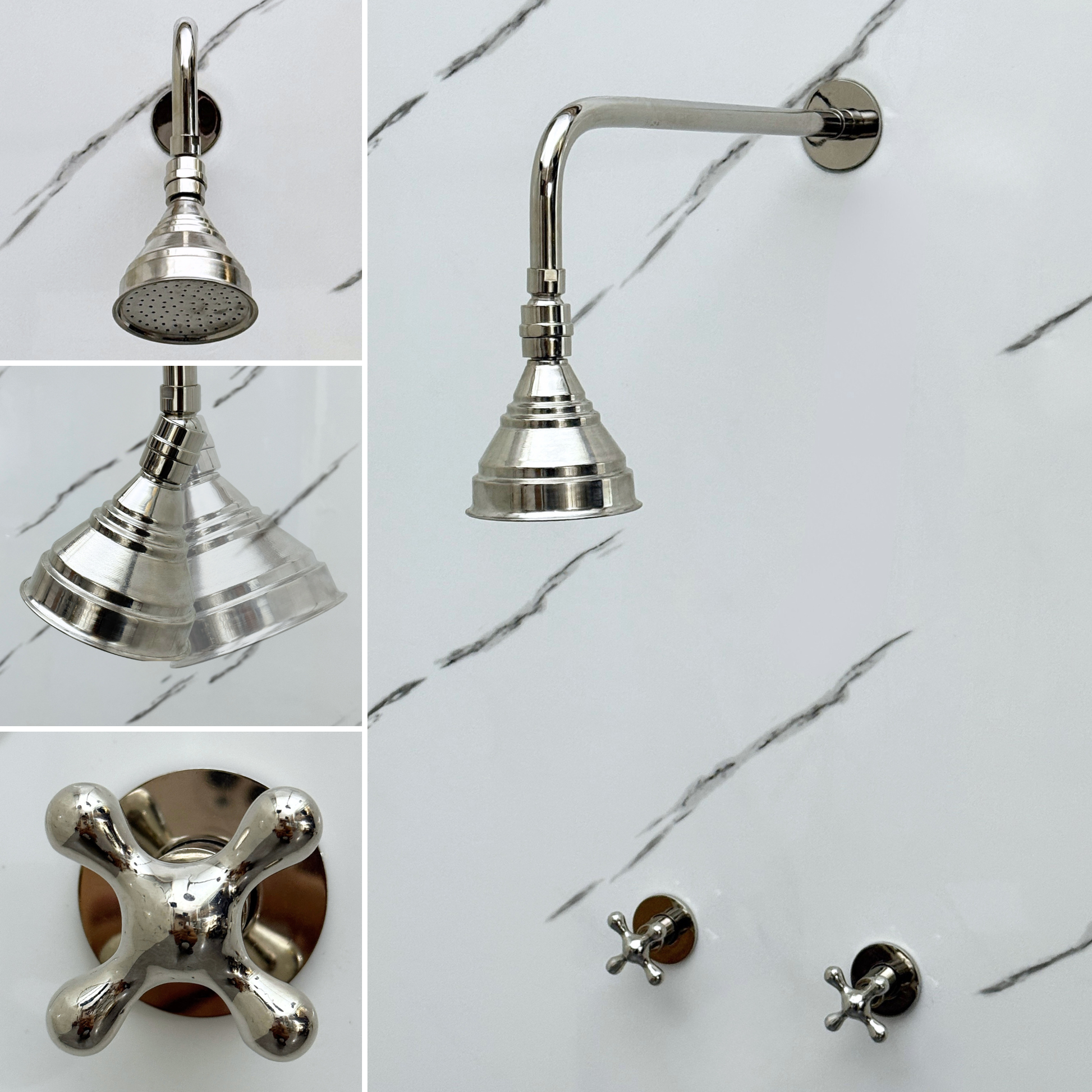 This wall-mounted shower system features a striking polished nickel finish over solid brass construction, combining elegance with lasting durability. The straight arm supports a round rain shower head for a soothing rainfall effect, while the cross handles provide precise water control for an effortless and timeless shower experience. An optional Adjustable Shower Head Connector is available, allowing you to customize the shower angle for added comfort.