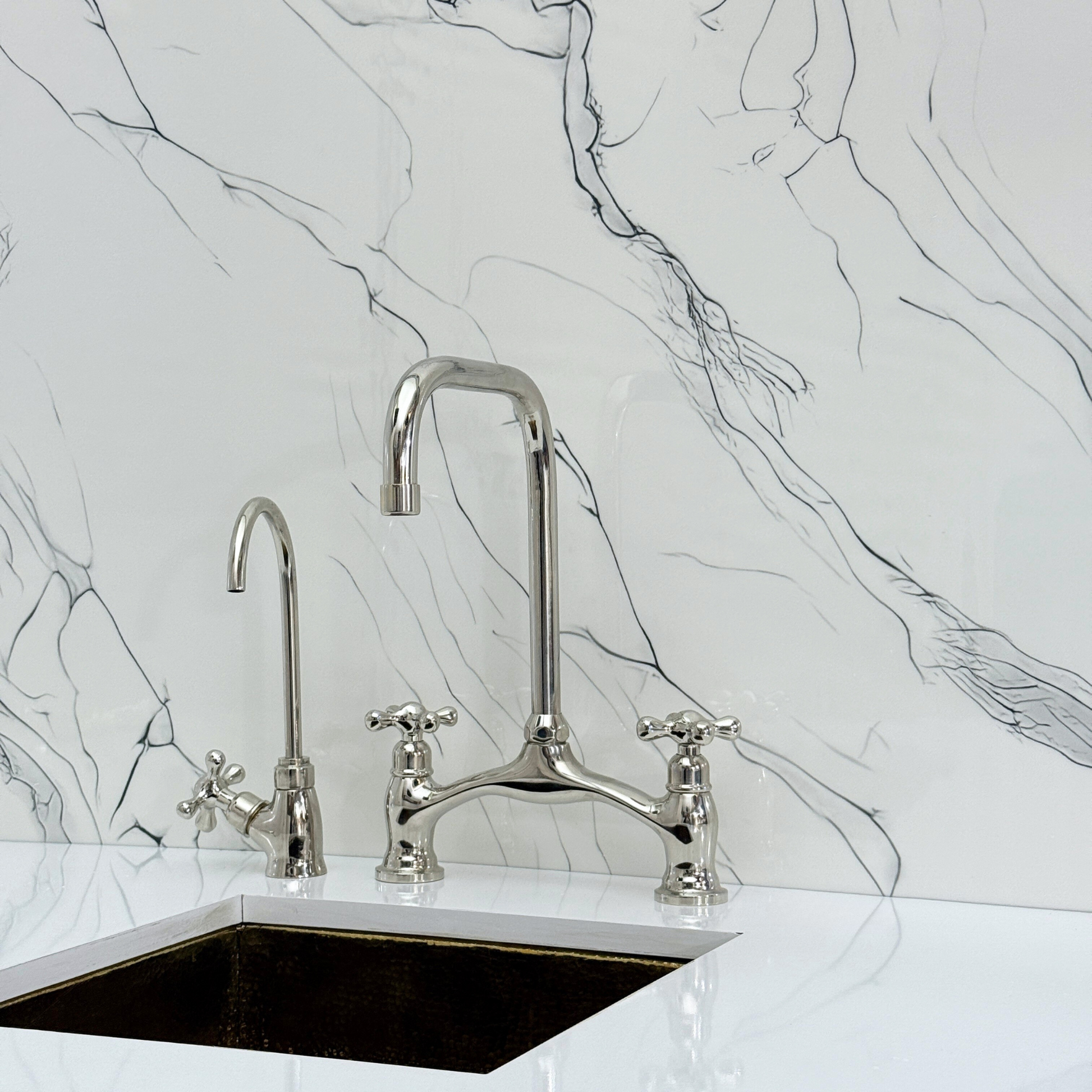 Vintage Bridge Kitchen Faucet in Polished Nickel Finish blends traditional charm with modern utility. Featuring a striking polished nickel finish over solid brass construction, it offers both durability and timeless character. A 360° swivel gooseneck spout ensures full sink coverage. Designed for practical elegance, it includes a high-pressure side sprayer and a dedicated drinking water tap. Cross handles provide smooth water control, and the polished nickel finish resists corrosion and elevates any kitchen aesthetic.