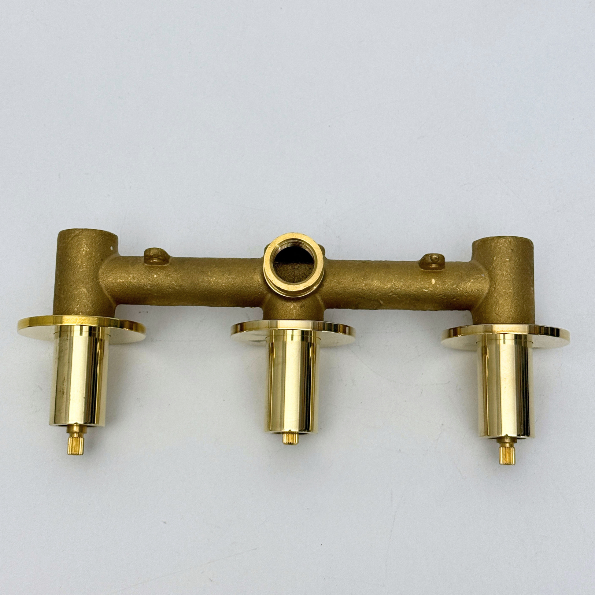 This Solid Brass 2 Way, 3 Handles Bathroom Shower Valve is a robust and versatile rough-in valve designed for custom shower systems. Constructed from high-quality solid brass, this valve is built for long-lasting durability and resistance to corrosion. It features a two-way diverter mechanism, allowing you to control water flow to two separate shower outlets, such as a showerhead and handheld shower. The valve requires three separate handles for independent operation of each function.