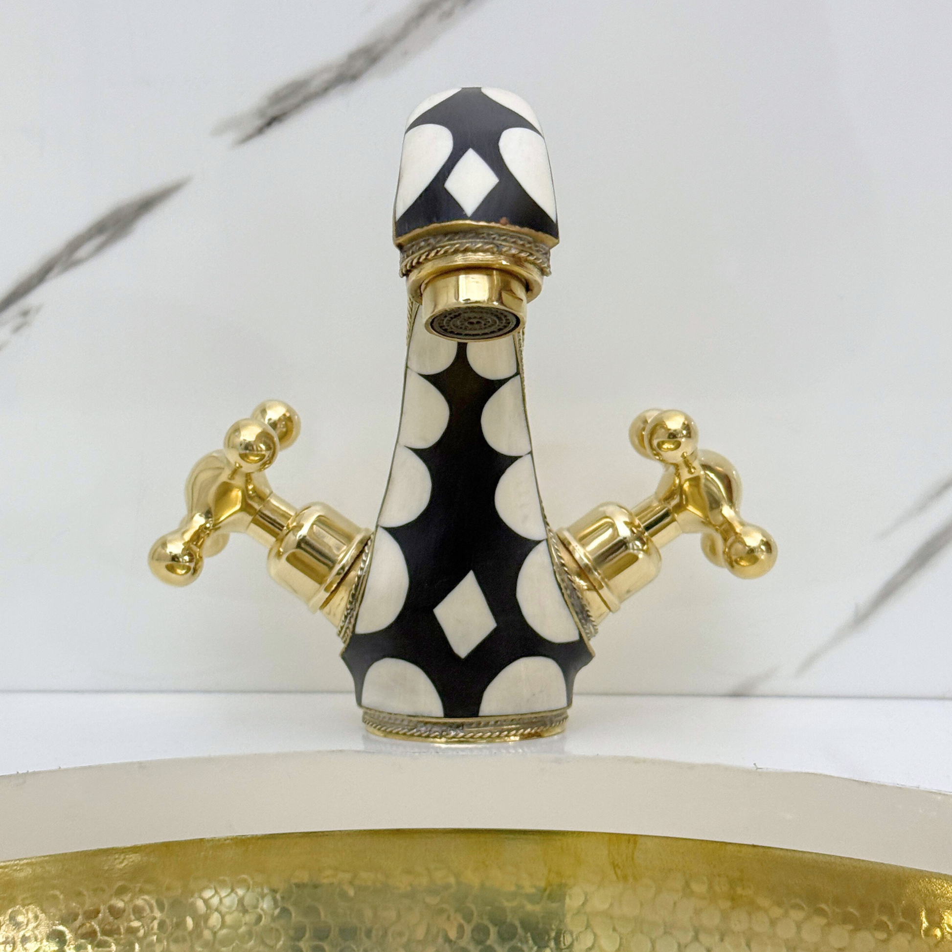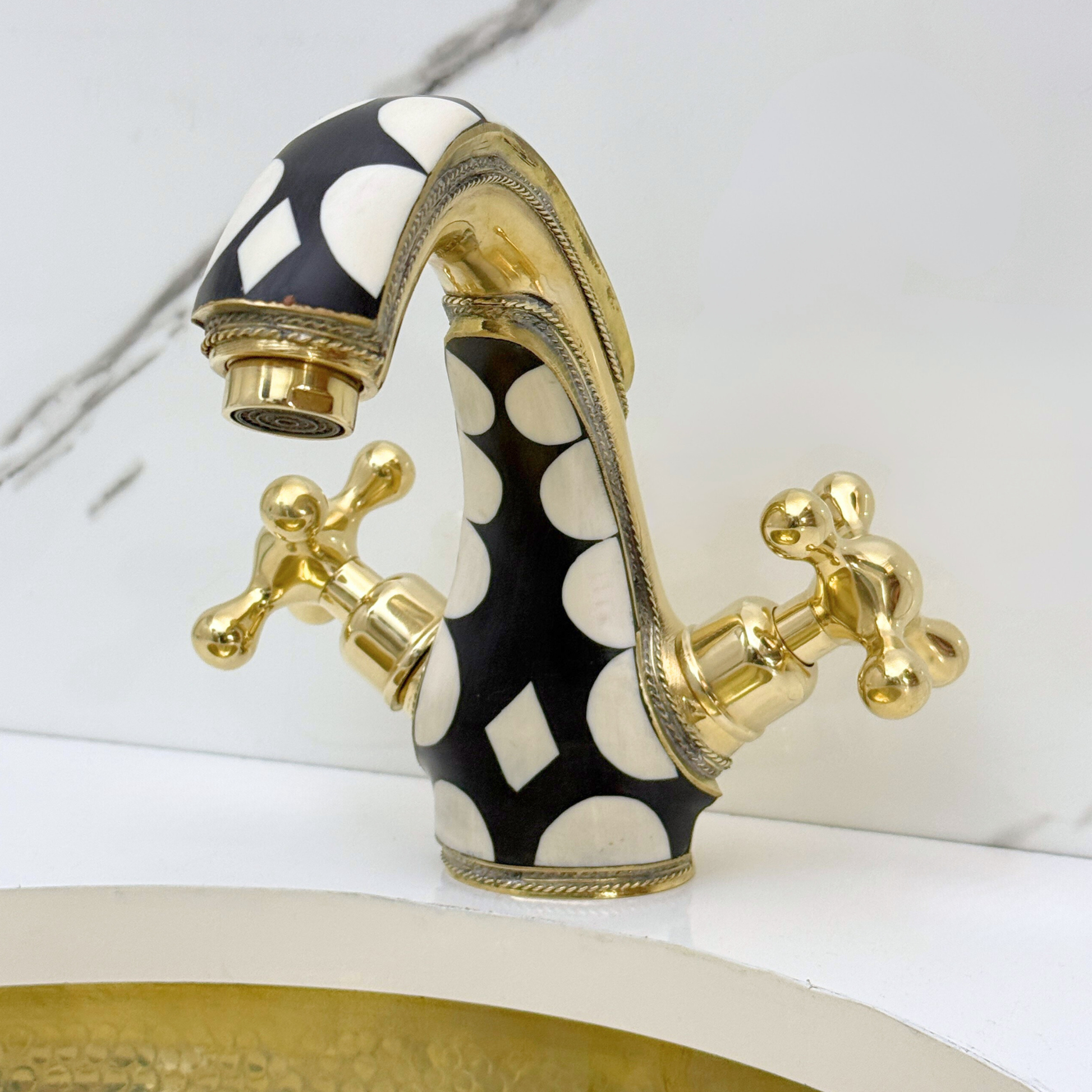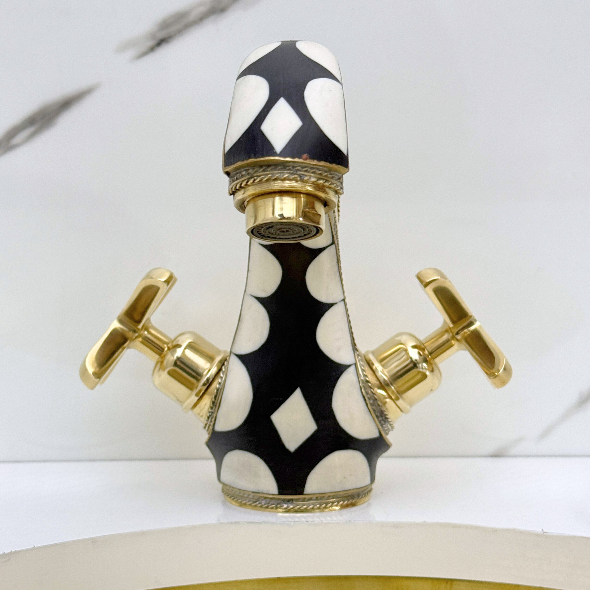 Unlacquered Brass and Resin Single Hole Bathroom Faucet with Cross Handles