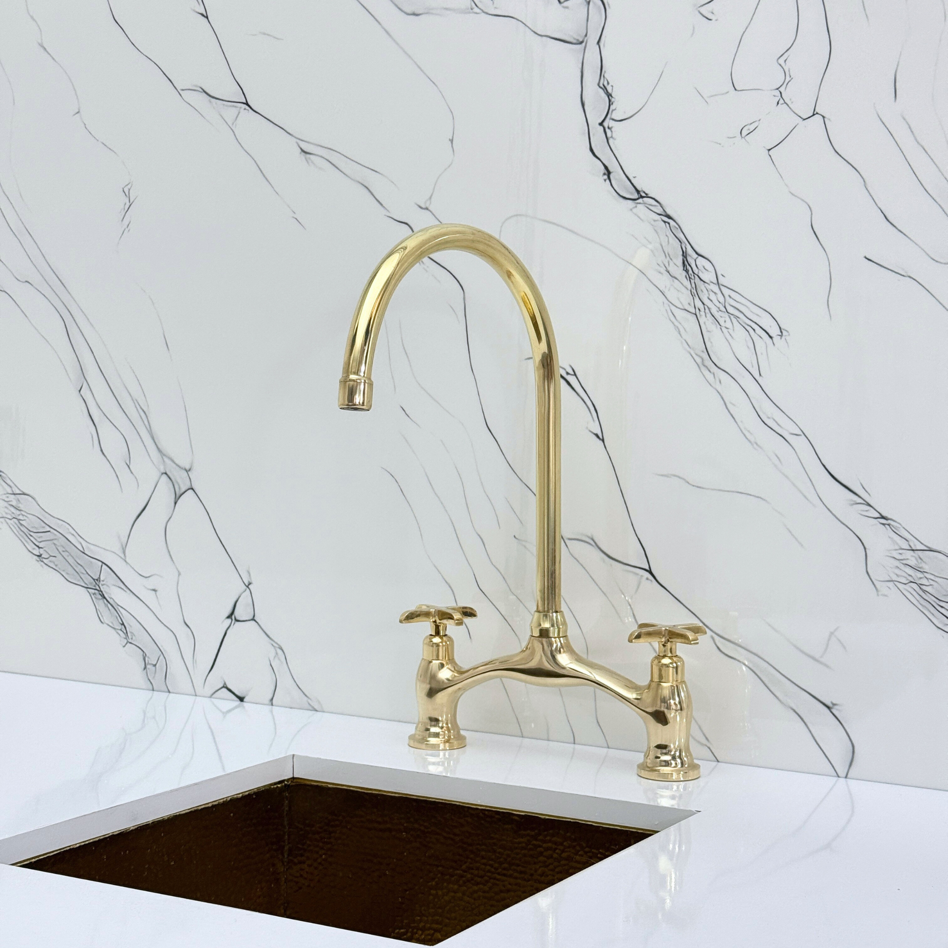 Unlacquered brass bridge antique faucet brings together artisanal quality and everyday performance, tailored for kitchens that value both beauty and reliability. Crafted from premium solid brass, it features a natural unlacquered finish that develops a graceful patina over time. The 360° swivel gooseneck spout offers a 7" reach, combining compact design with elegant functionality. Designed with a dedicated drinking water tap and a high-pressure side sprayer, this set delivers full performance in a refined form. Cross handles ensure easy water control, while the faucet remains durable, corrosion-resistant, and simple to install and maintain.
