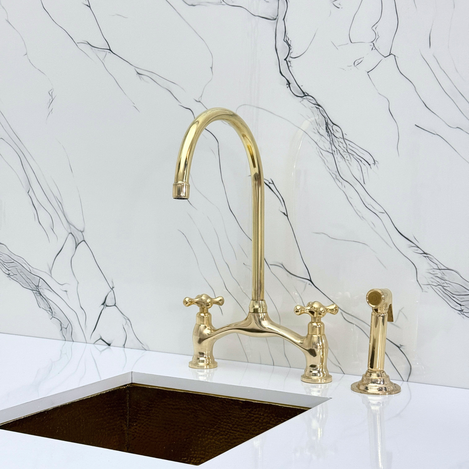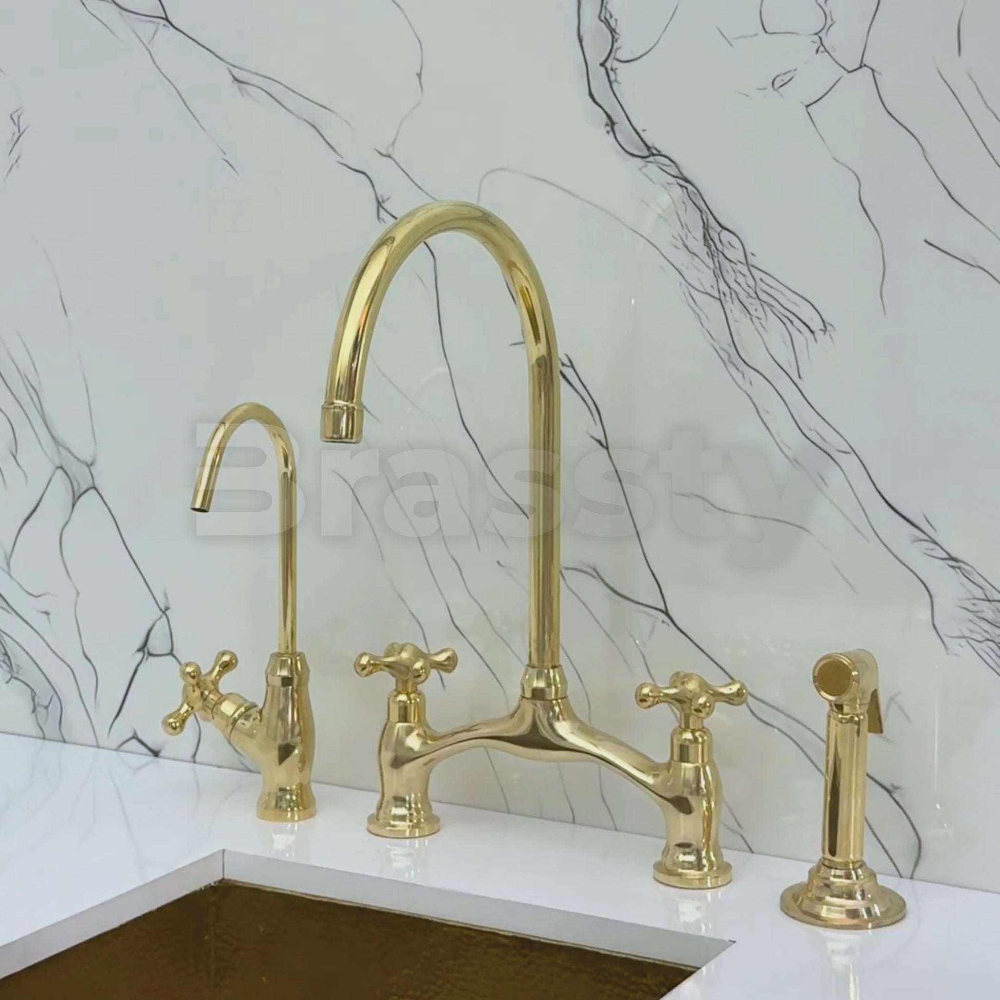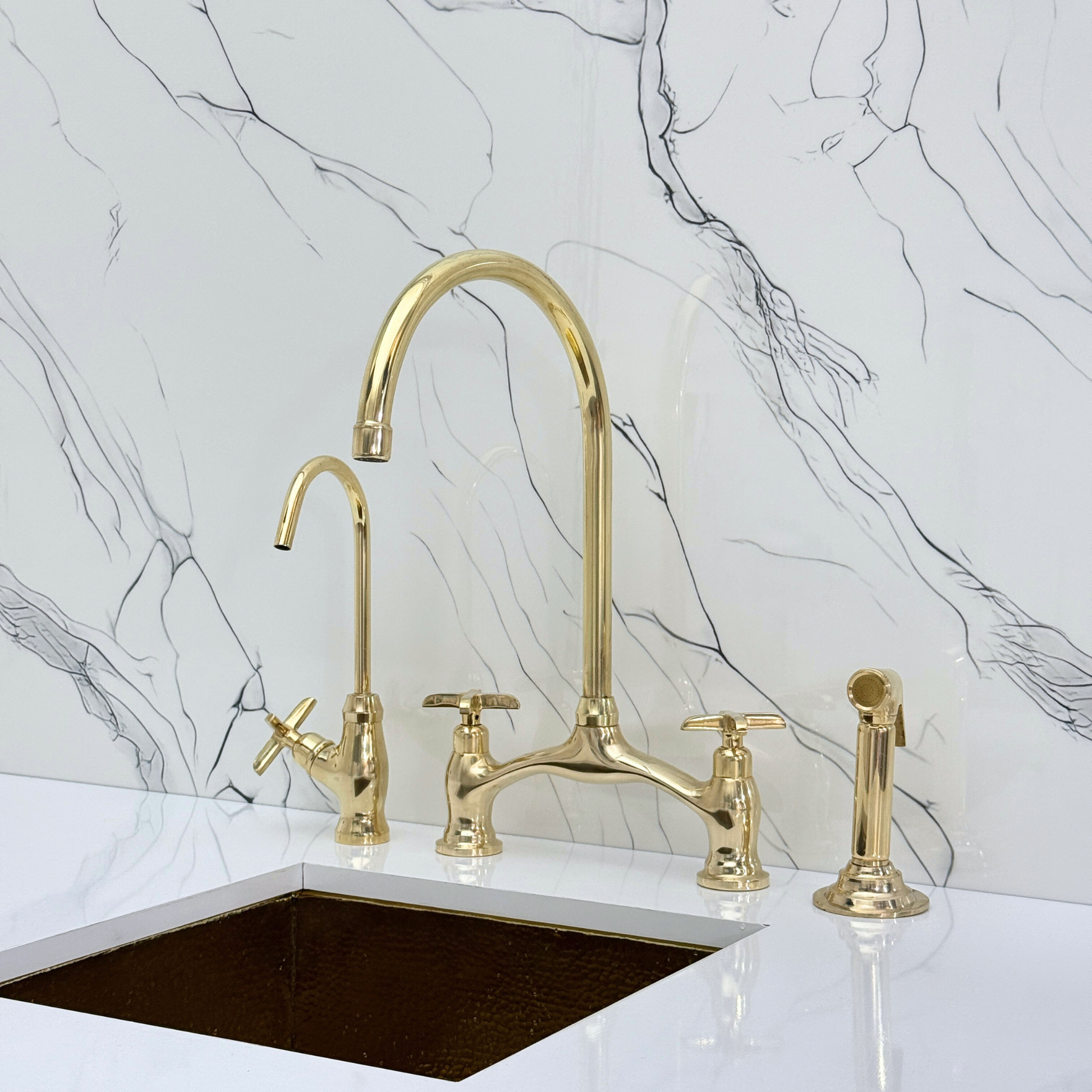 Unlacquered Brass Bridge Antique Faucet with Sprayer, Drinking Water Tap and Cross Handles