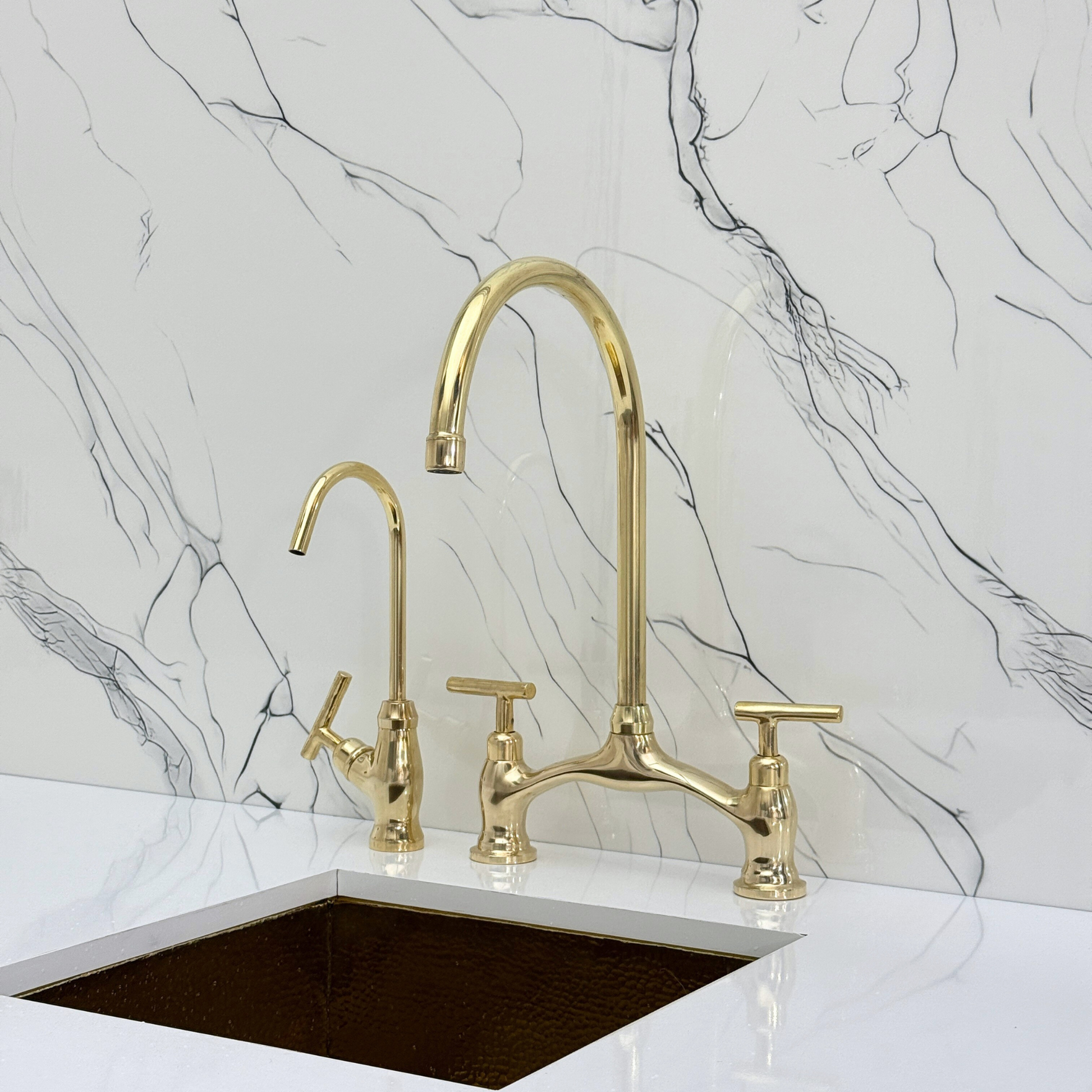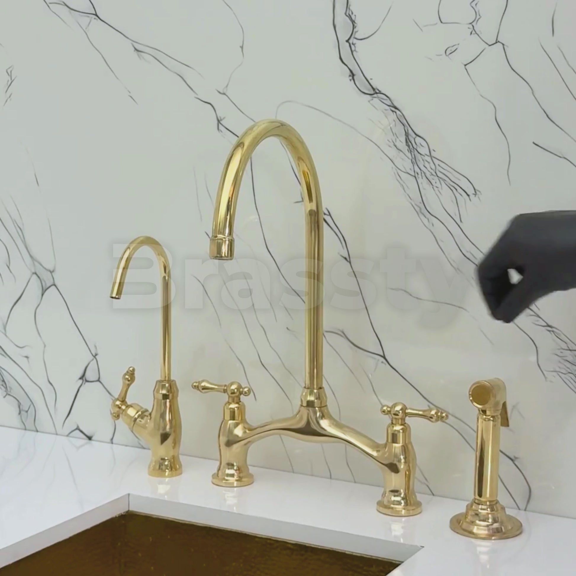 Unlacquered brass bridge antique faucet brings together artisanal quality and everyday performance, tailored for kitchens that value both beauty and reliability. Crafted from premium solid brass, it features a natural unlacquered finish that develops a graceful patina over time. The 360° swivel gooseneck spout offers a 7" reach, combining compact design with elegant functionality. Designed with a dedicated drinking water tap and a high-pressure side sprayer, this set delivers full performance in a refined form. Lever handles ensure easy water control, while the faucet remains durable, corrosion-resistant, and simple to install and maintain.