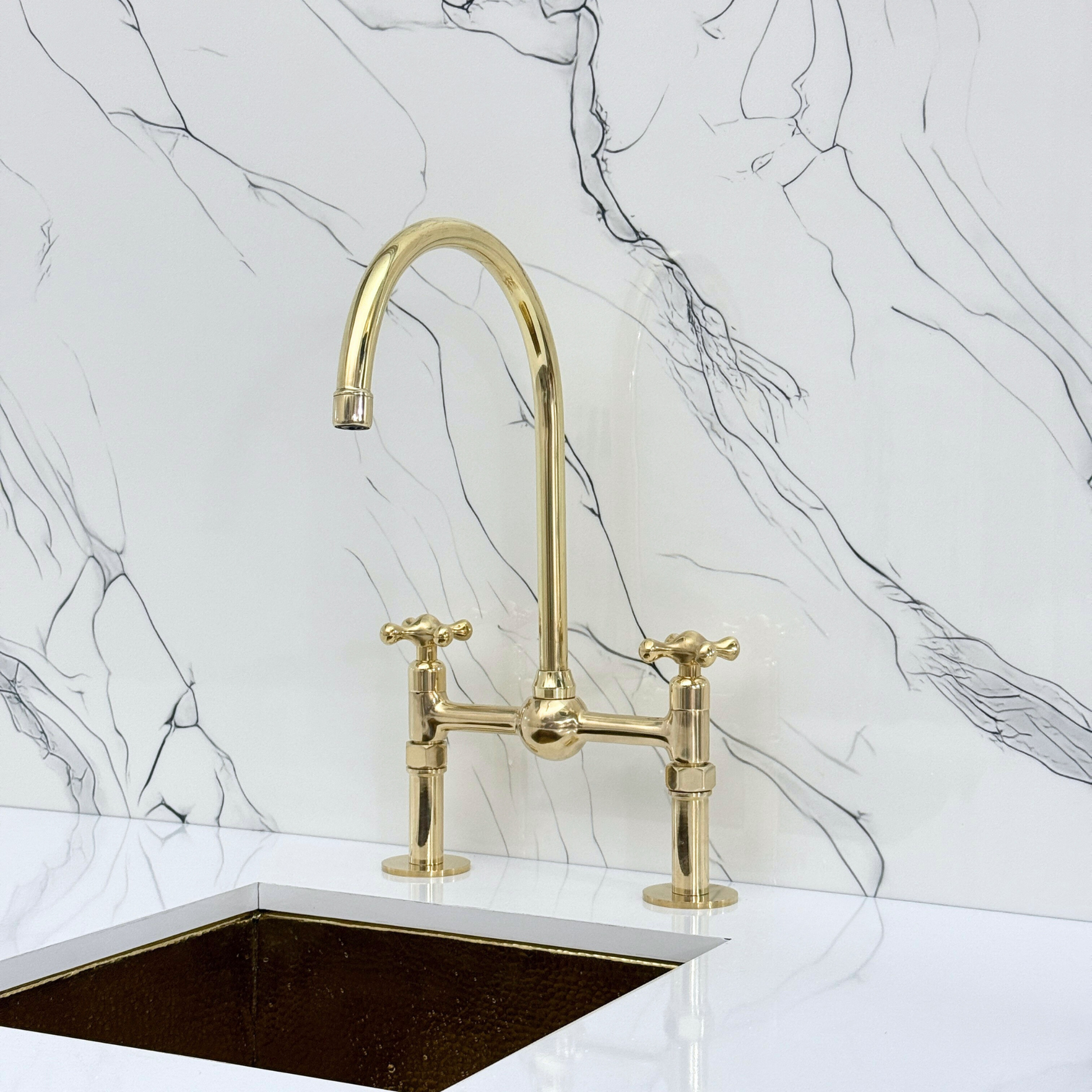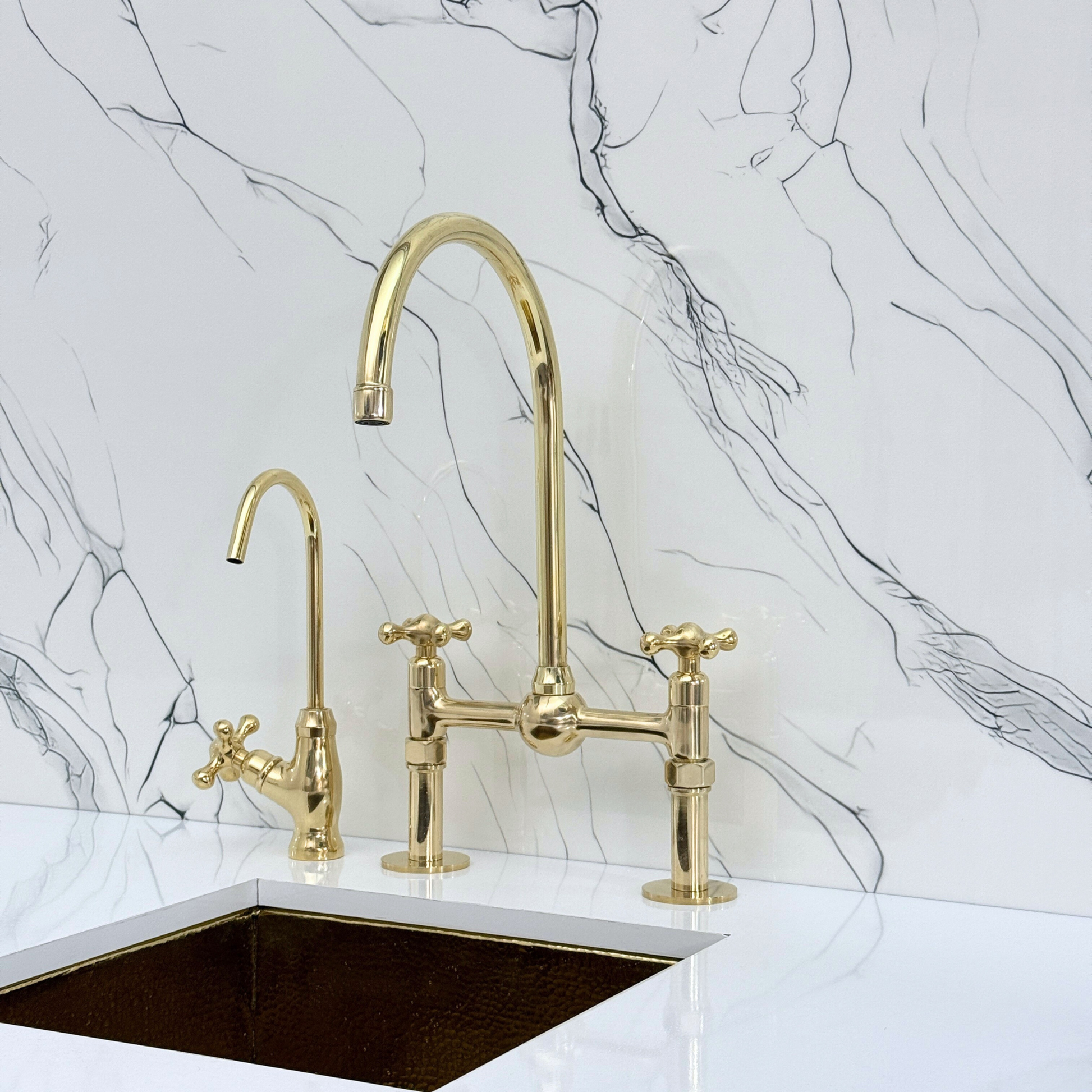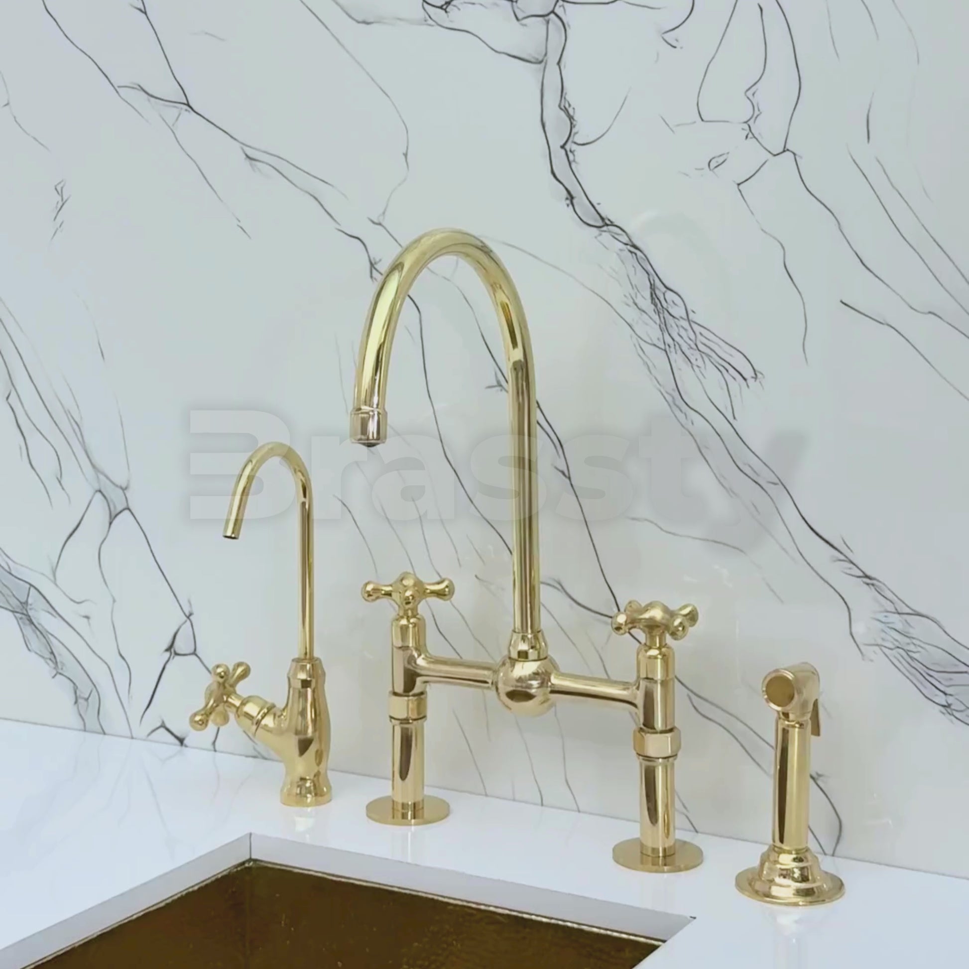 Unlacquered brass Vintage bridge faucet brings together artisanal quality and everyday performance, tailored for kitchens that value both beauty and reliability. Crafted from premium solid brass, it features a natural unlacquered finish that develops a graceful patina over time. A 360° swivel gooseneck spout ensures full sink coverage and elegant movement. Designed with a dedicated drinking water tap, a high-pressure side sprayer, and a straight-leg base this set delivers full performance in a refined form. Cross handles ensure easy water control, while the faucet remains durable, corrosion-resistant, and simple to install and maintain.