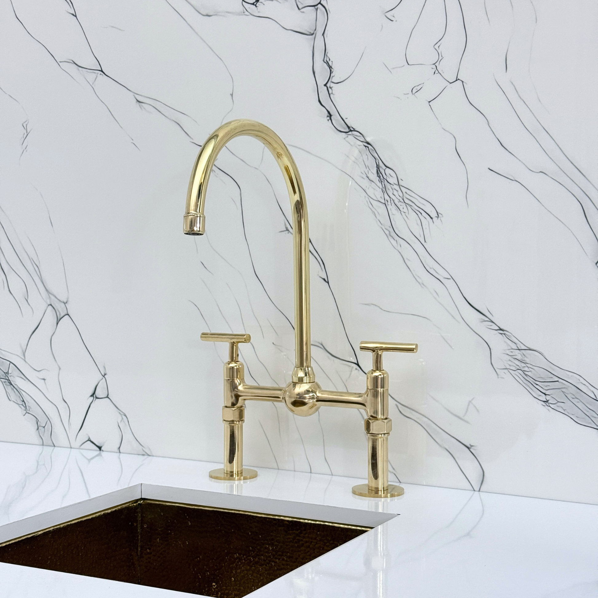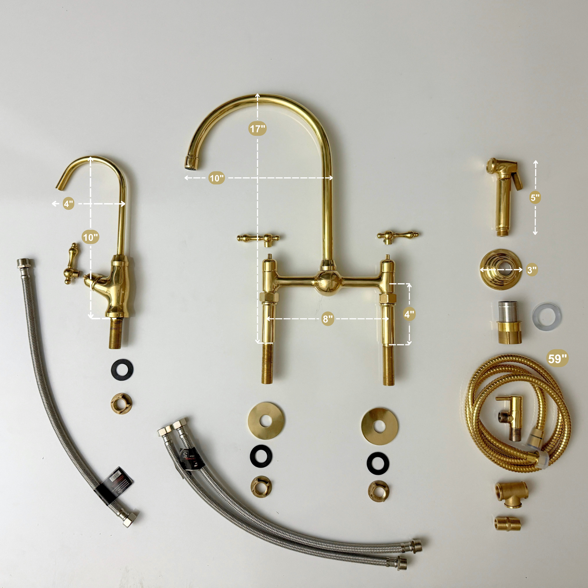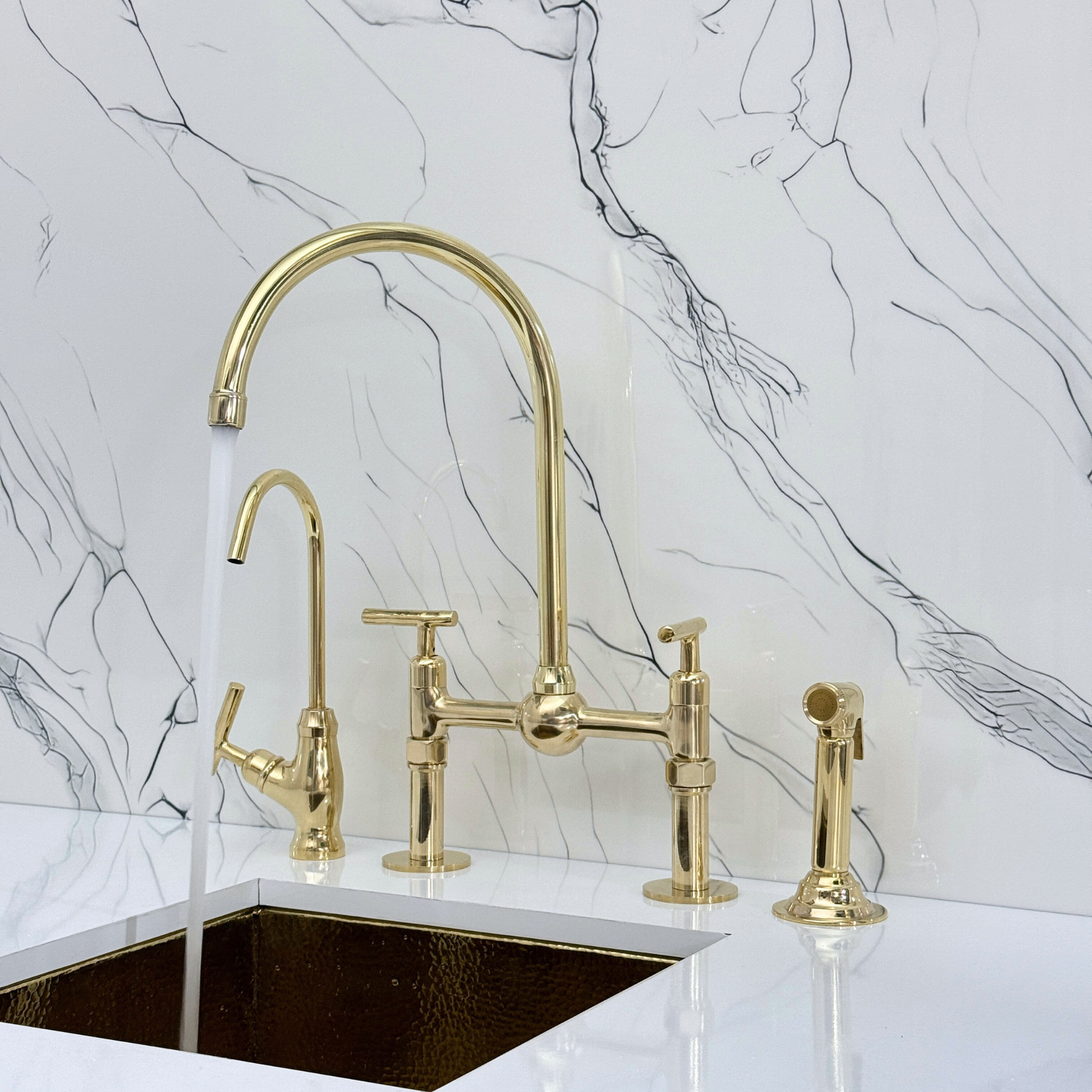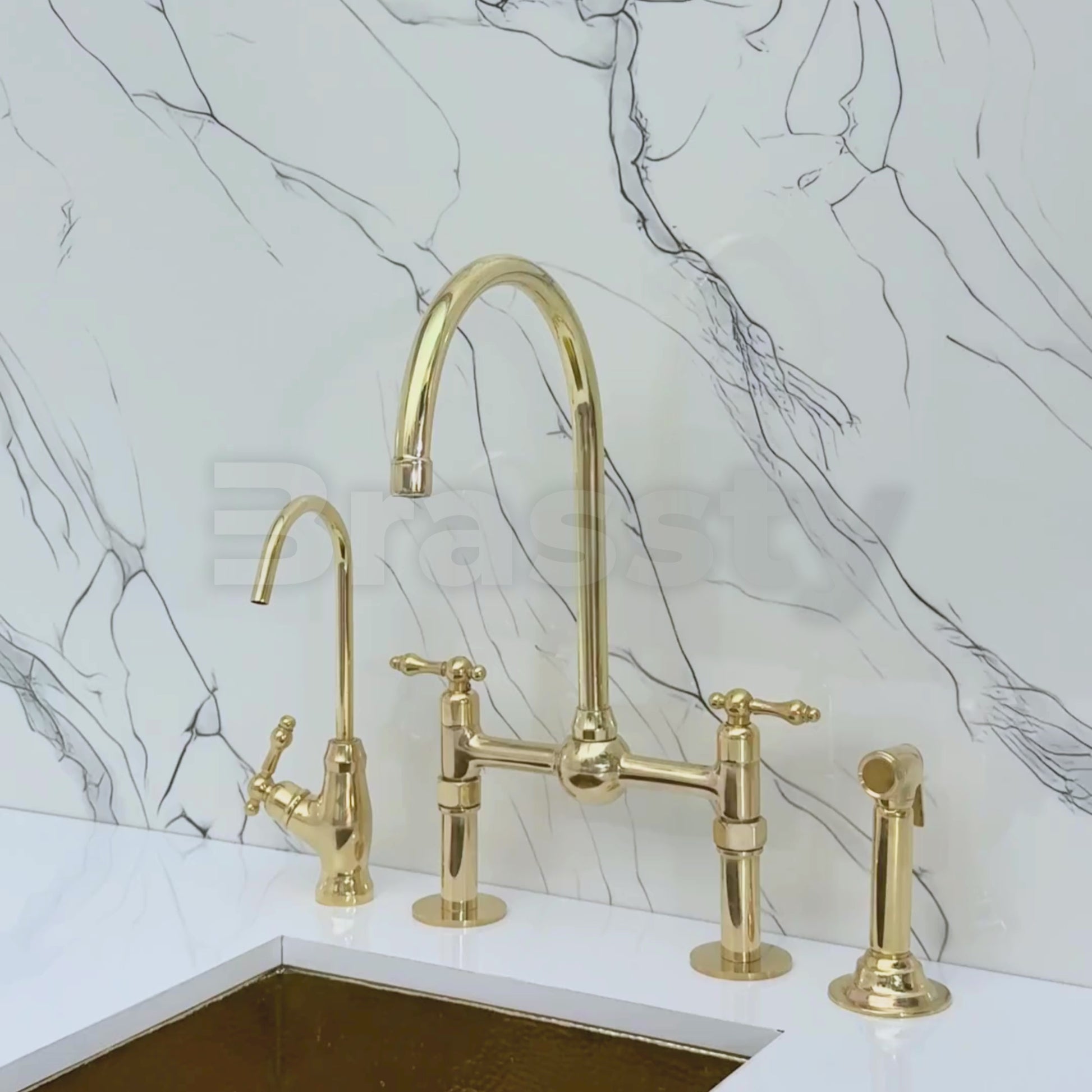 Unlacquered brass Vintage bridge faucet brings together artisanal quality and everyday performance, tailored for kitchens that value both beauty and reliability. Crafted from premium solid brass, it features a natural unlacquered finish that develops a graceful patina over time. A 360° swivel gooseneck spout ensures full sink coverage and elegant movement. Designed with a dedicated drinking water tap, a high-pressure side sprayer, and a straight-leg base this set delivers full performance in a refined form. Lever handles ensure easy water control, while the faucet remains durable, corrosion-resistant, and simple to install and maintain.