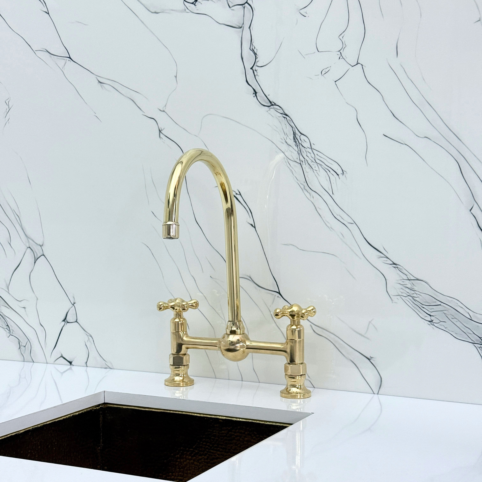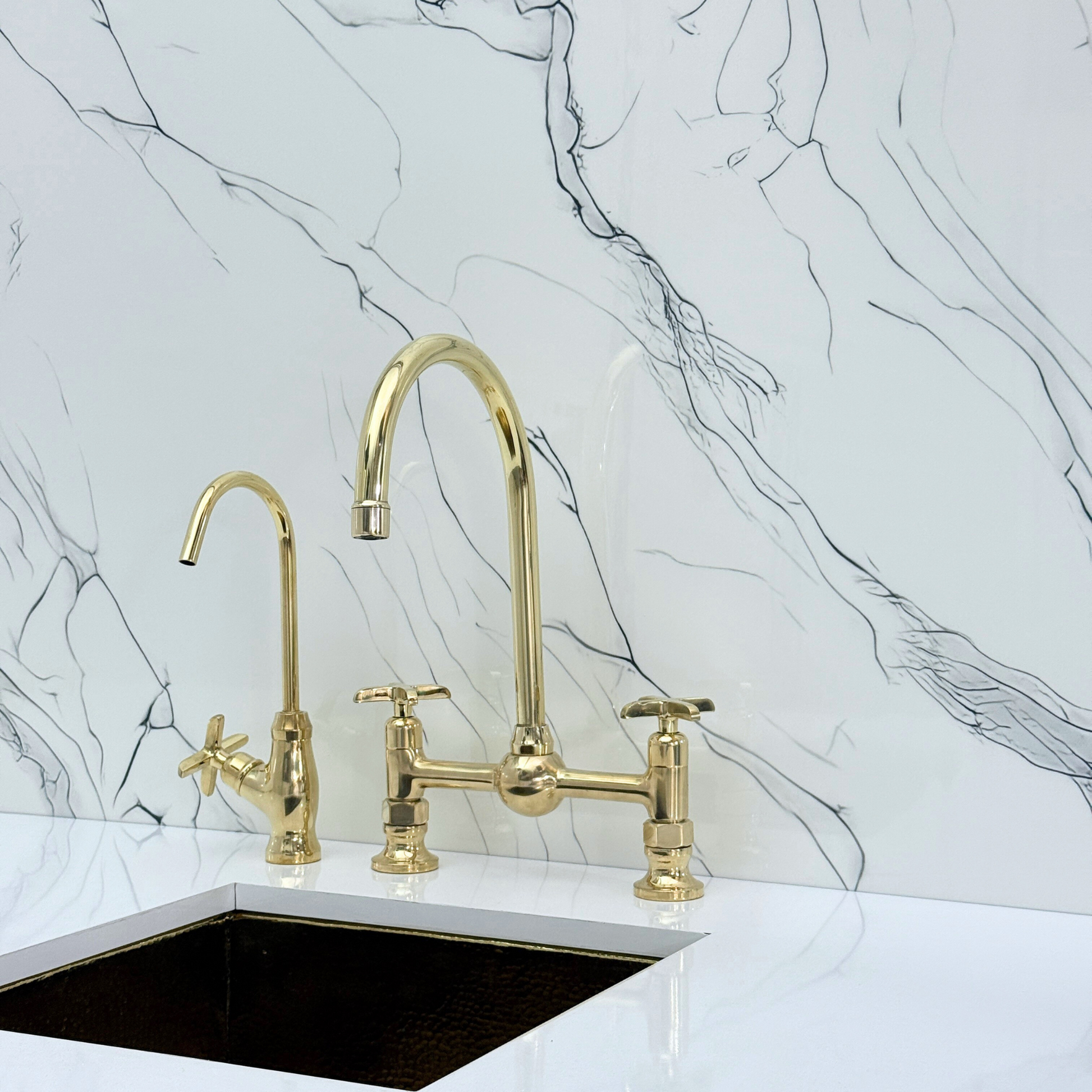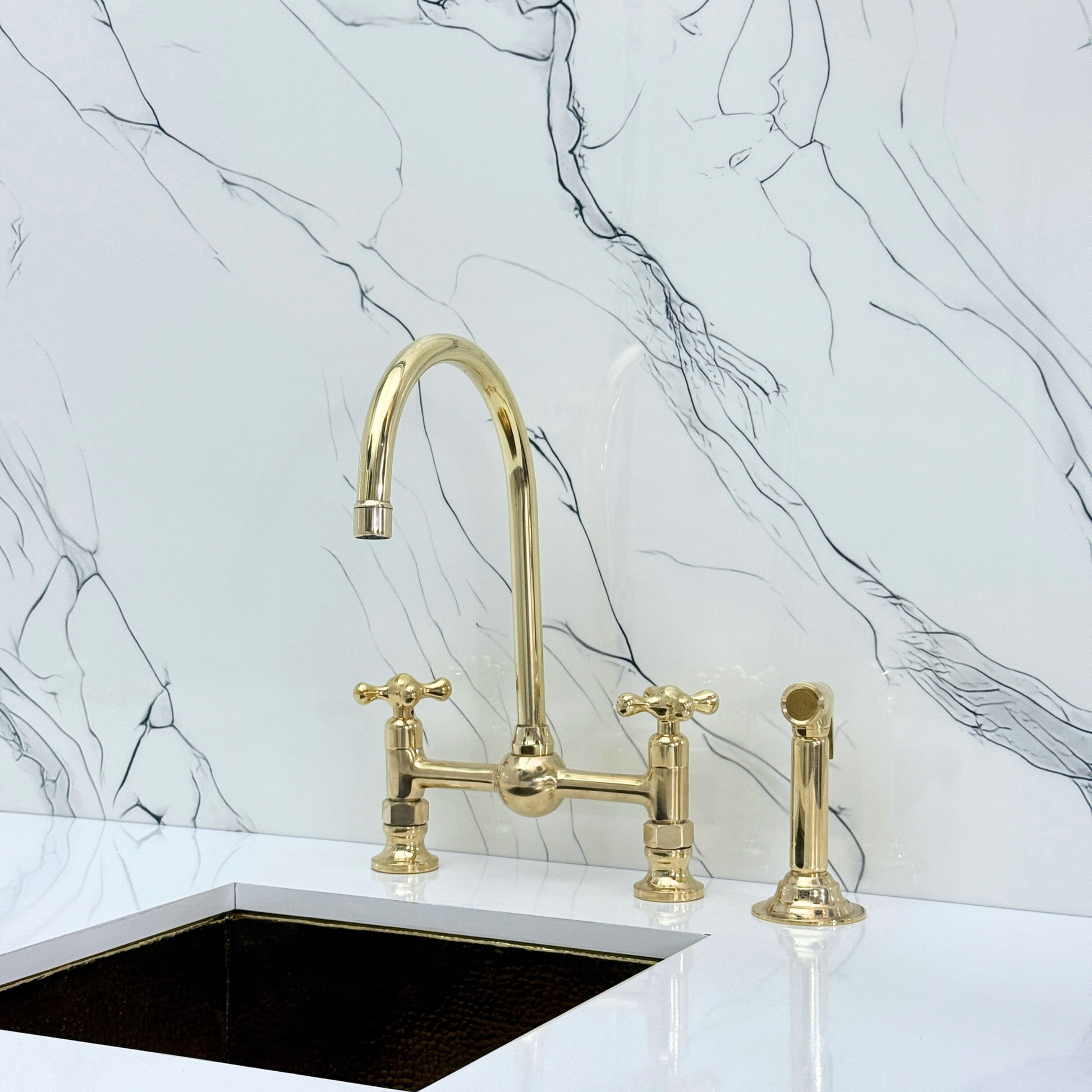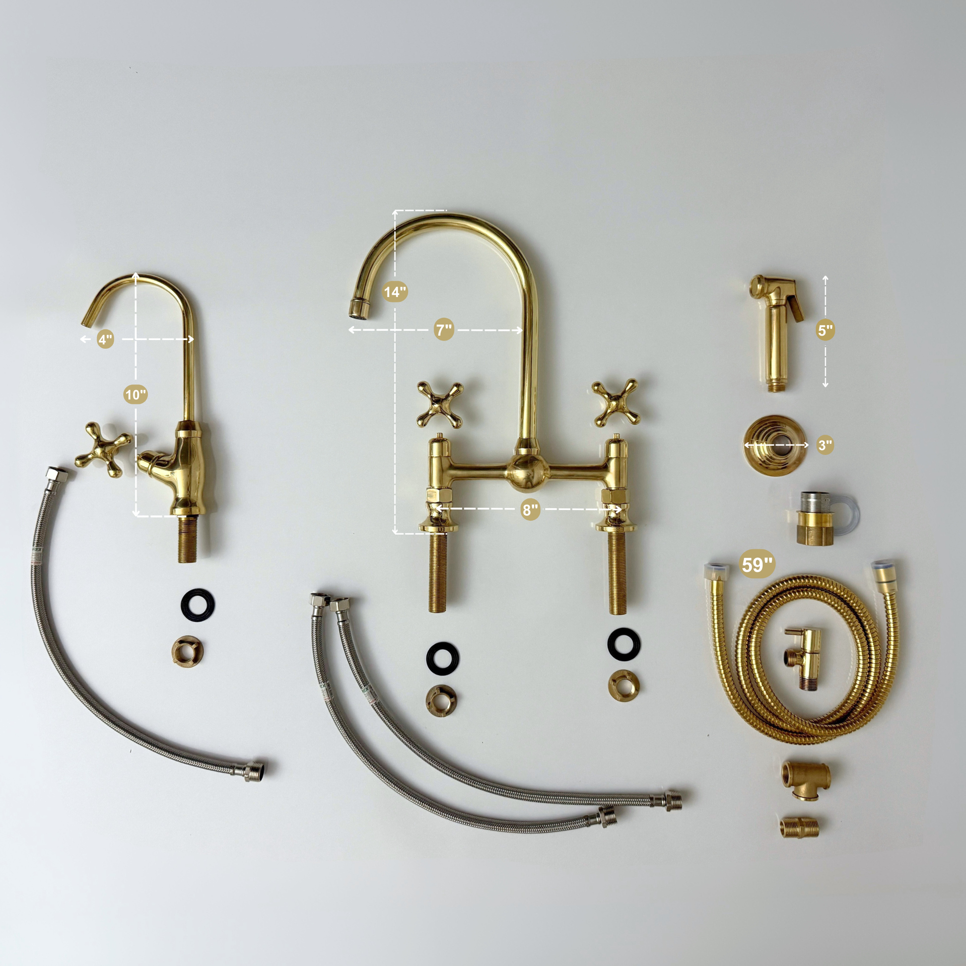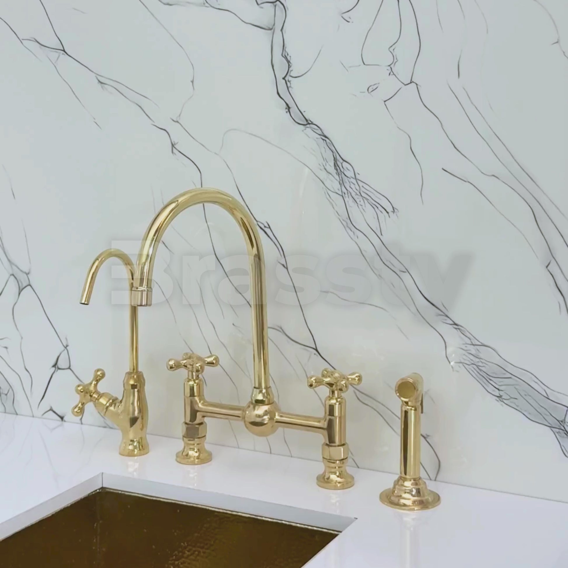 Unlacquered brass bridge kitchen faucet brings together artisanal quality and everyday performance, tailored for kitchens that value both beauty and reliability. The smooth ball center detail enhances visual appeal, adding balance and sophistication to the design. Crafted from premium solid brass, it features a natural unlacquered finish that develops a graceful patina over time. A 360° swivel gooseneck spout ensures full sink coverage and elegant movement. Designed with a dedicated drinking water tap and a high-pressure side sprayer, this set delivers full performance in a refined form. Cross handles ensure easy water control, while the faucet remains durable, corrosion-resistant, and simple to install and maintain.
