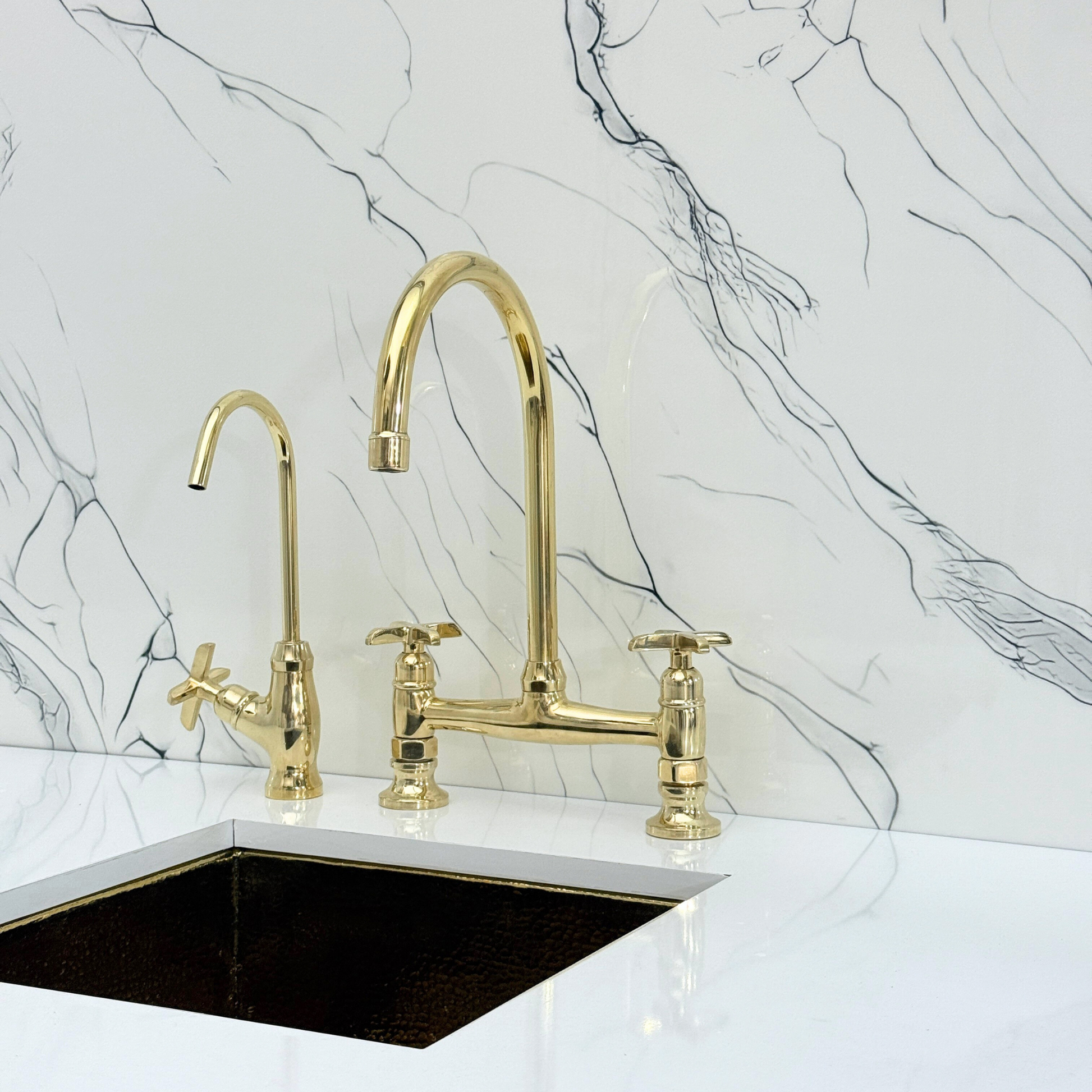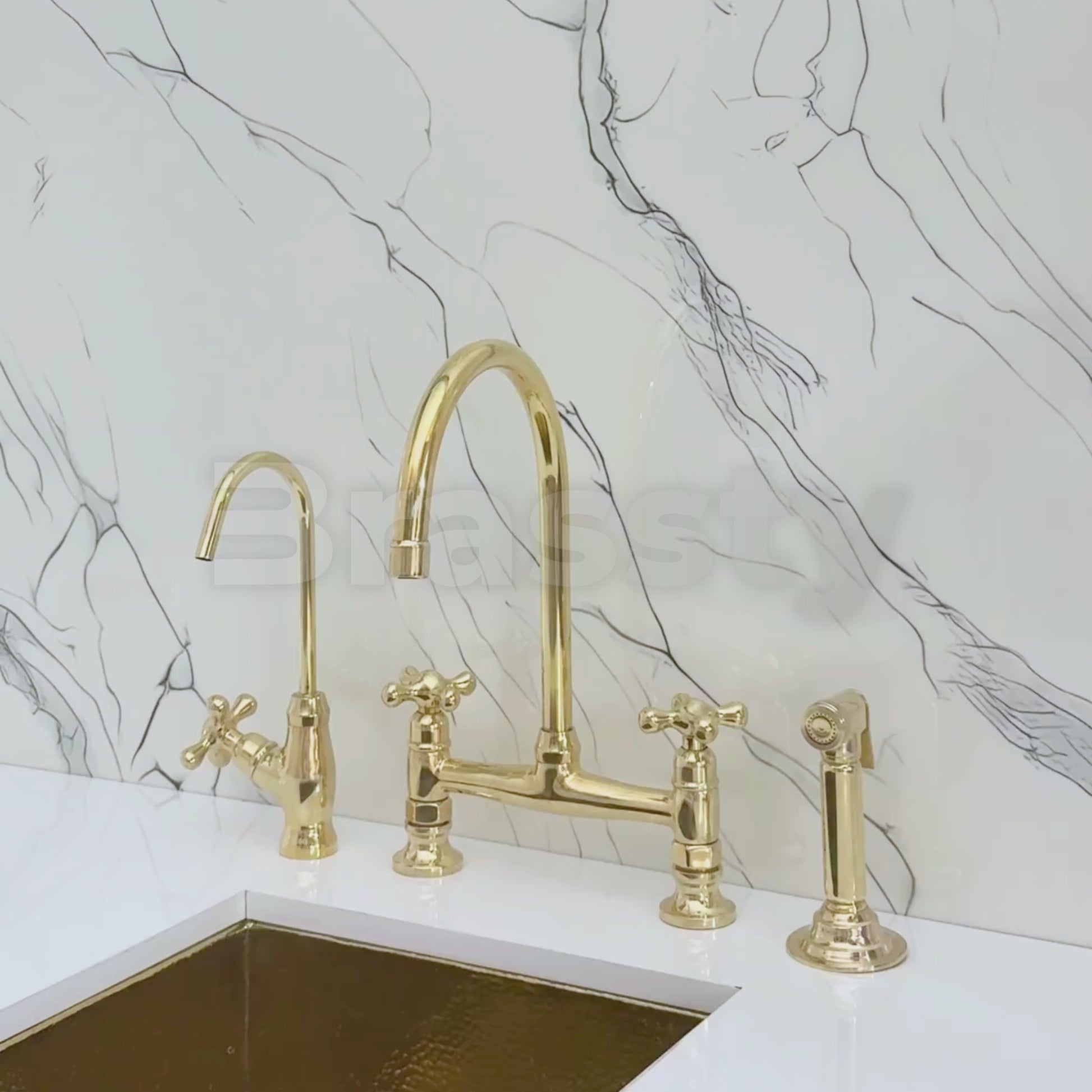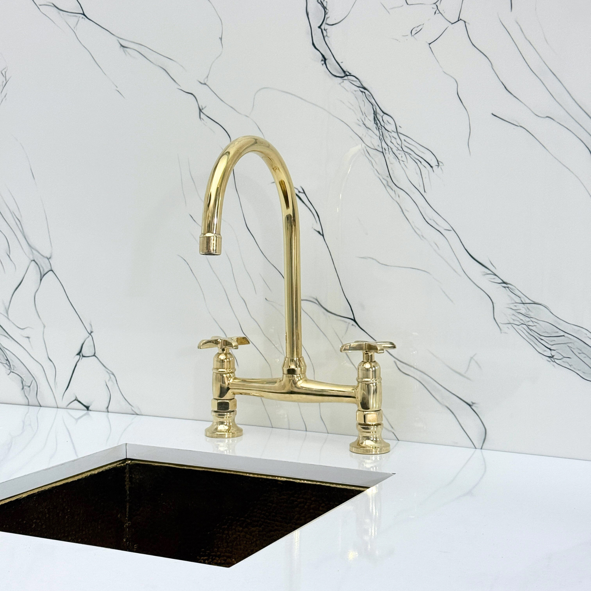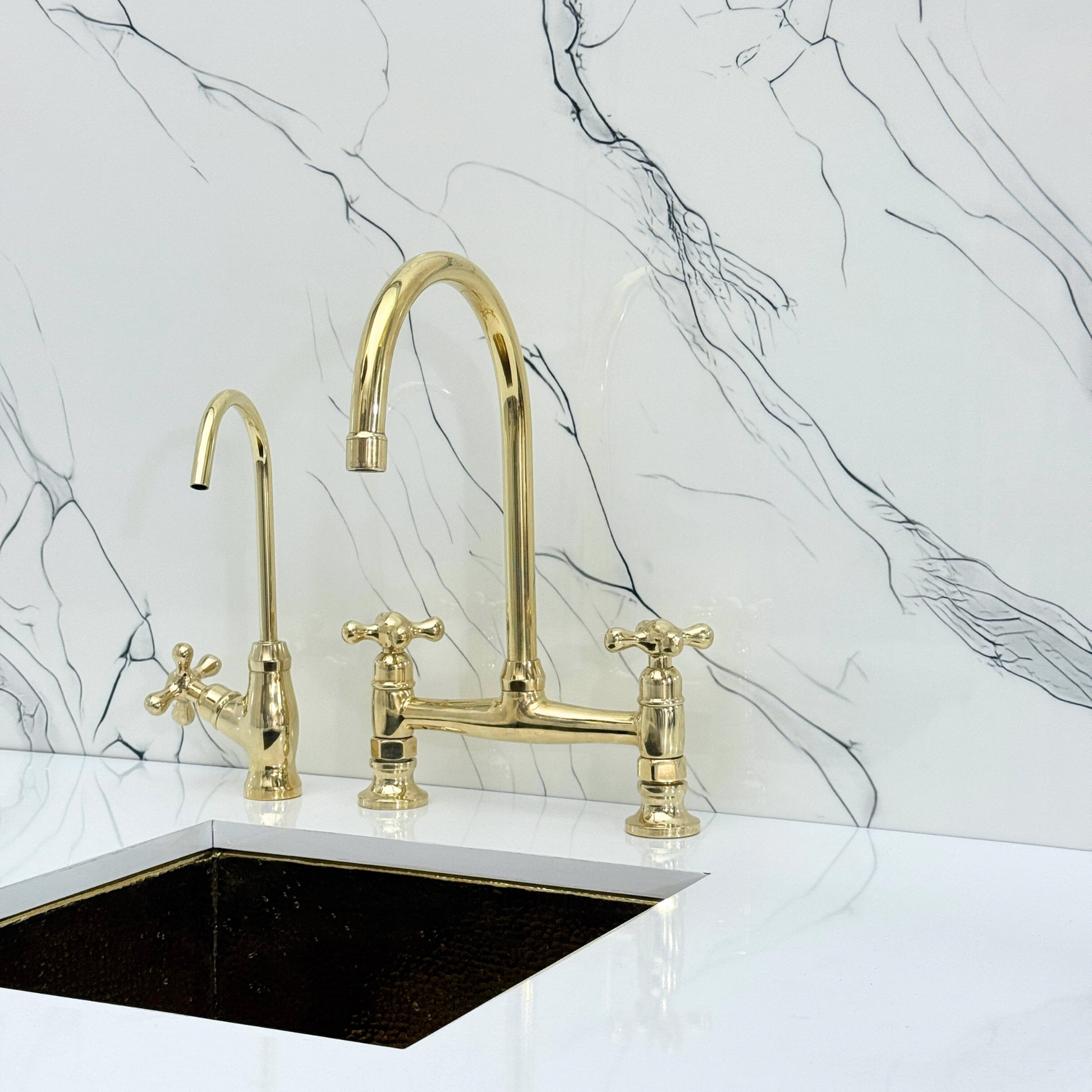 Unlacquered brass bridge vintage kitchen faucet brings together artisanal quality and everyday performance, tailored for kitchens that value both beauty and reliability. Crafted from premium solid brass, it features a natural unlacquered finish that develops a graceful patina over time. A 360° swivel gooseneck spout ensures full sink coverage and elegant movement. Designed with a dedicated drinking water tap and a high-pressure side sprayer, this set delivers full performance in a refined form. Cross handles ensure easy water control, while the faucet remains durable, corrosion-resistant, and simple to install and maintain.