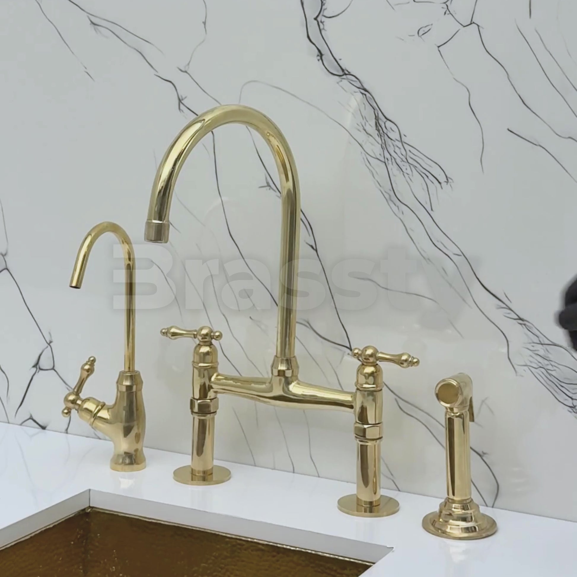 Unlacquered brass bridge kitchen faucet brings together artisanal quality and everyday performance, tailored for kitchens that value both beauty and reliability. Crafted from premium solid brass, it features a natural unlacquered finish that develops a graceful patina over time. The 360° swivel gooseneck spout offers a 7" reach, combining compact design with elegant functionality. Designed with a dedicated drinking water tap and a high-pressure side sprayer, this set delivers full performance in a refined form. Lever handles ensure easy water control, while the faucet remains durable, corrosion-resistant, and simple to install and maintain.