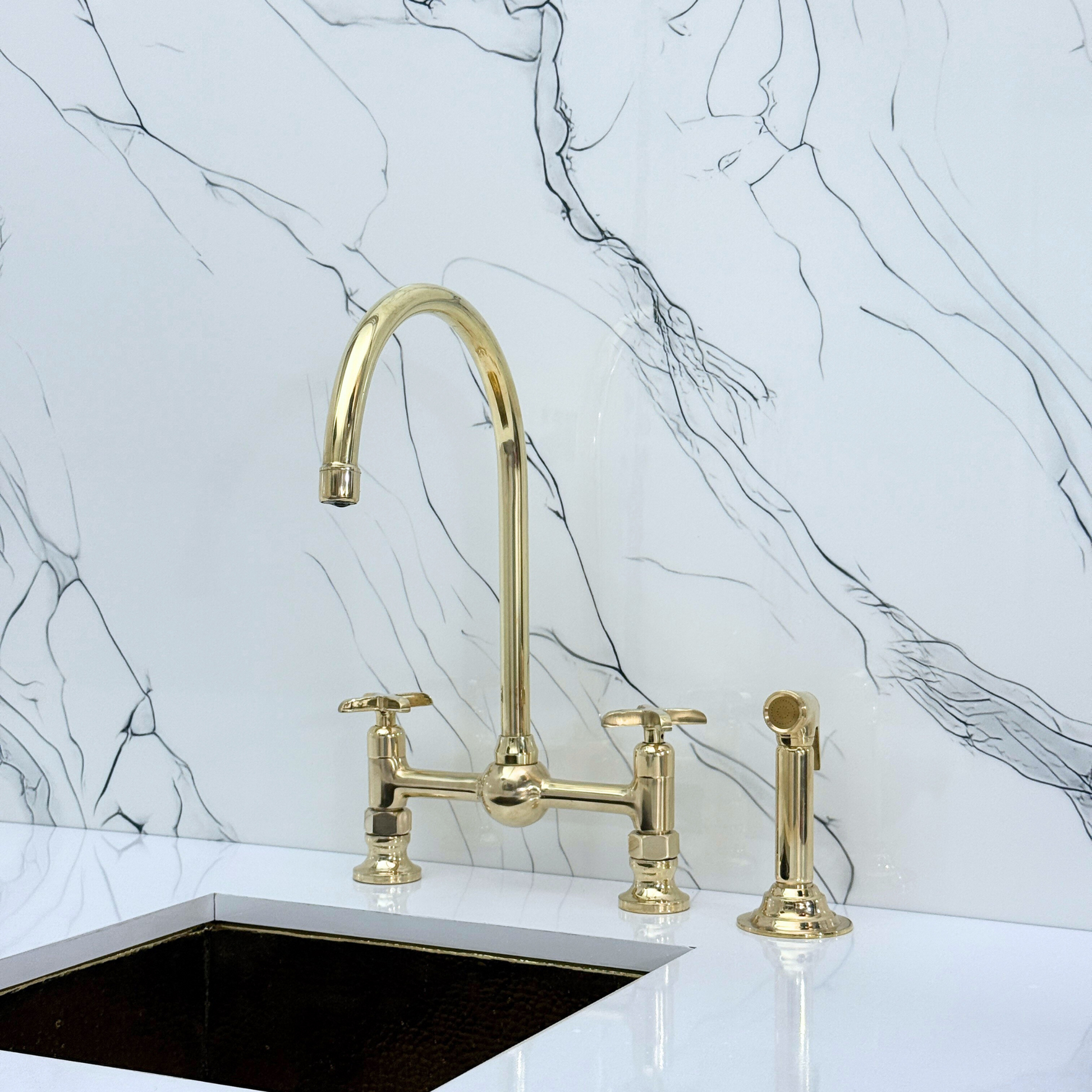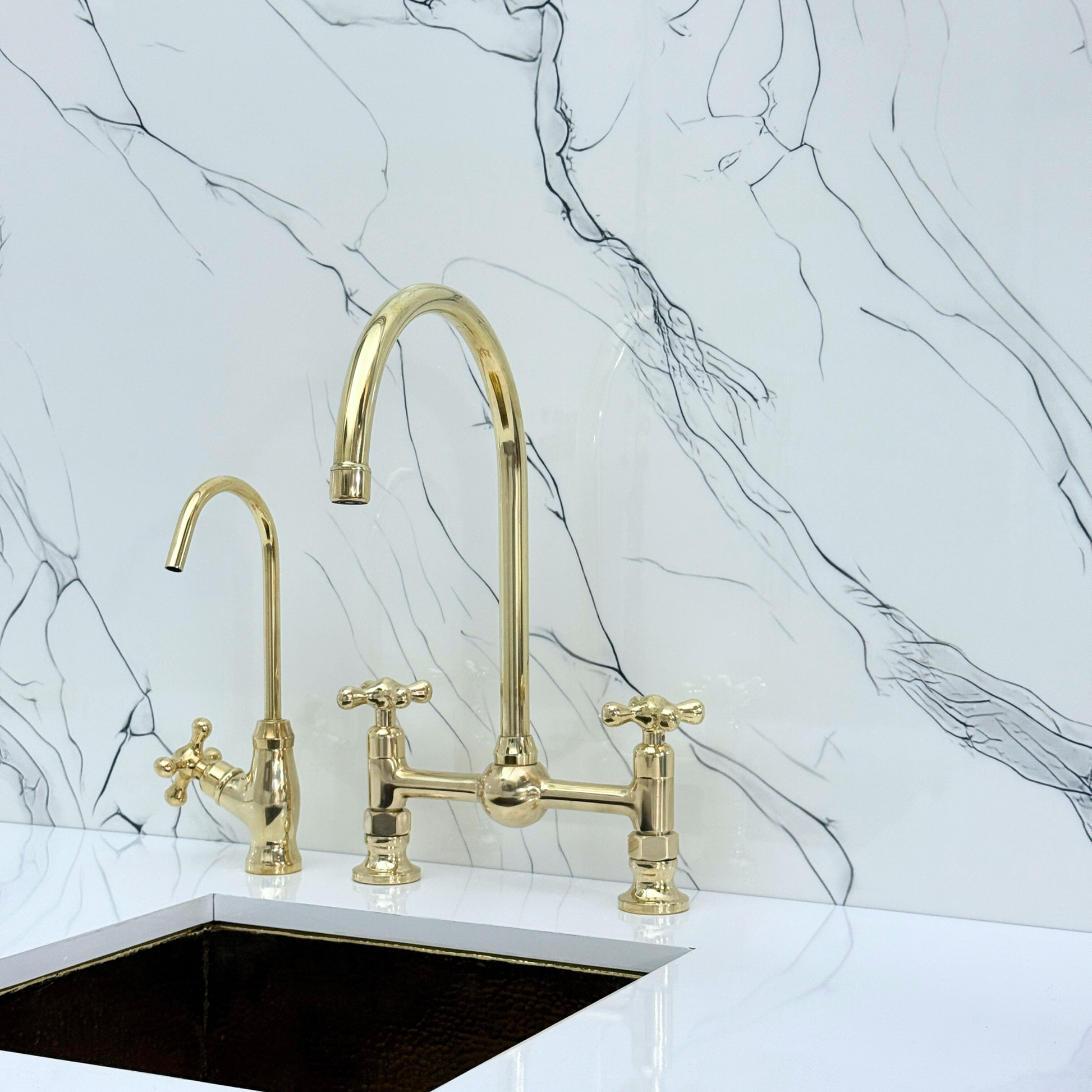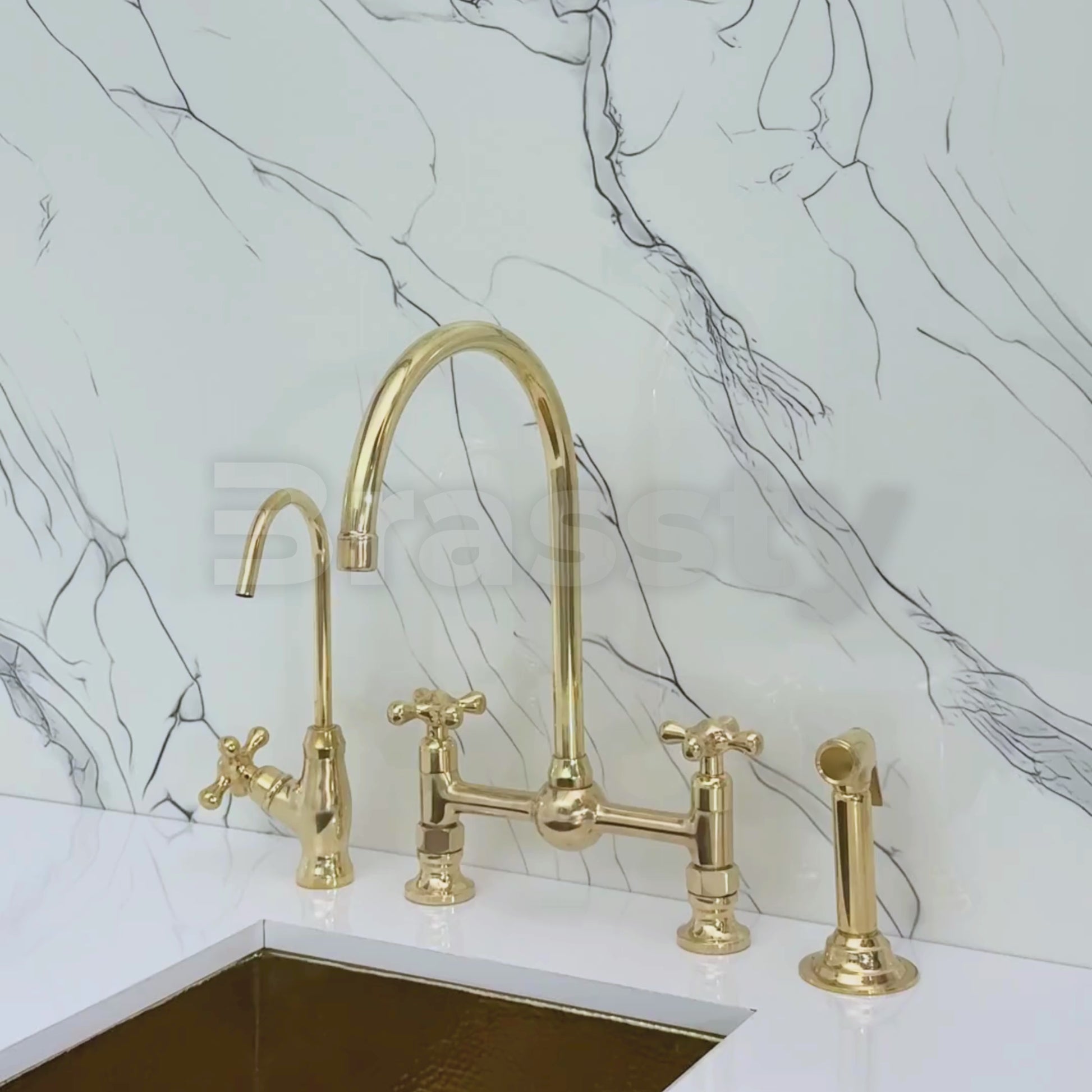 Unlacquered brass bridge vintage kitchen faucet brings together artisanal quality and everyday performance, tailored for kitchens that value both beauty and reliability. The smooth ball center detail enhances visual appeal, adding balance and sophistication to the design. Crafted from premium solid brass, it features a natural unlacquered finish that develops a graceful patina over time. A 360° swivel gooseneck spout ensures full sink coverage and elegant movement. Designed with a dedicated drinking water tap and a high-pressure side sprayer, this set delivers full performance in a refined form. Cross handles ensure easy water control, while the faucet remains durable, corrosion-resistant, and simple to install and maintain.