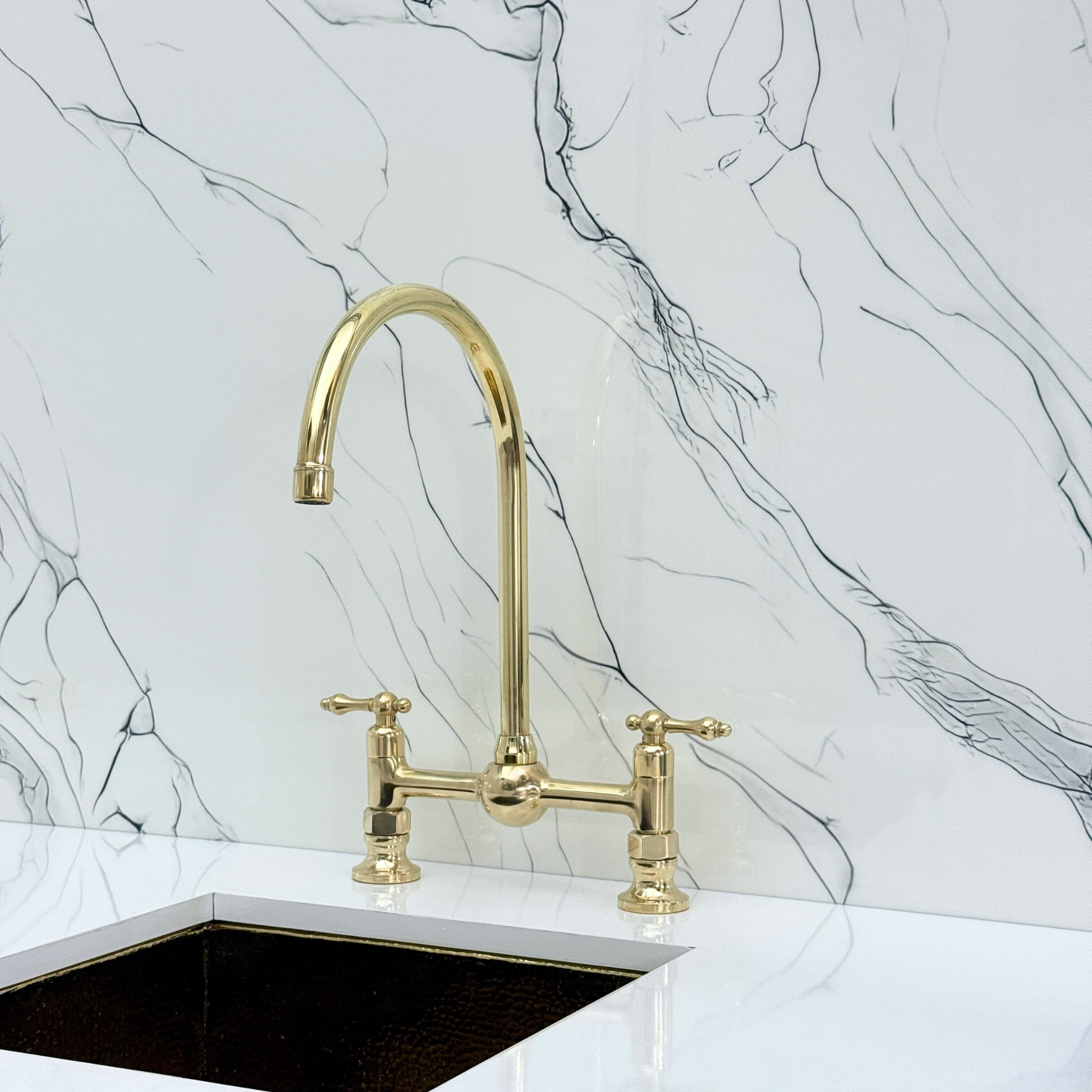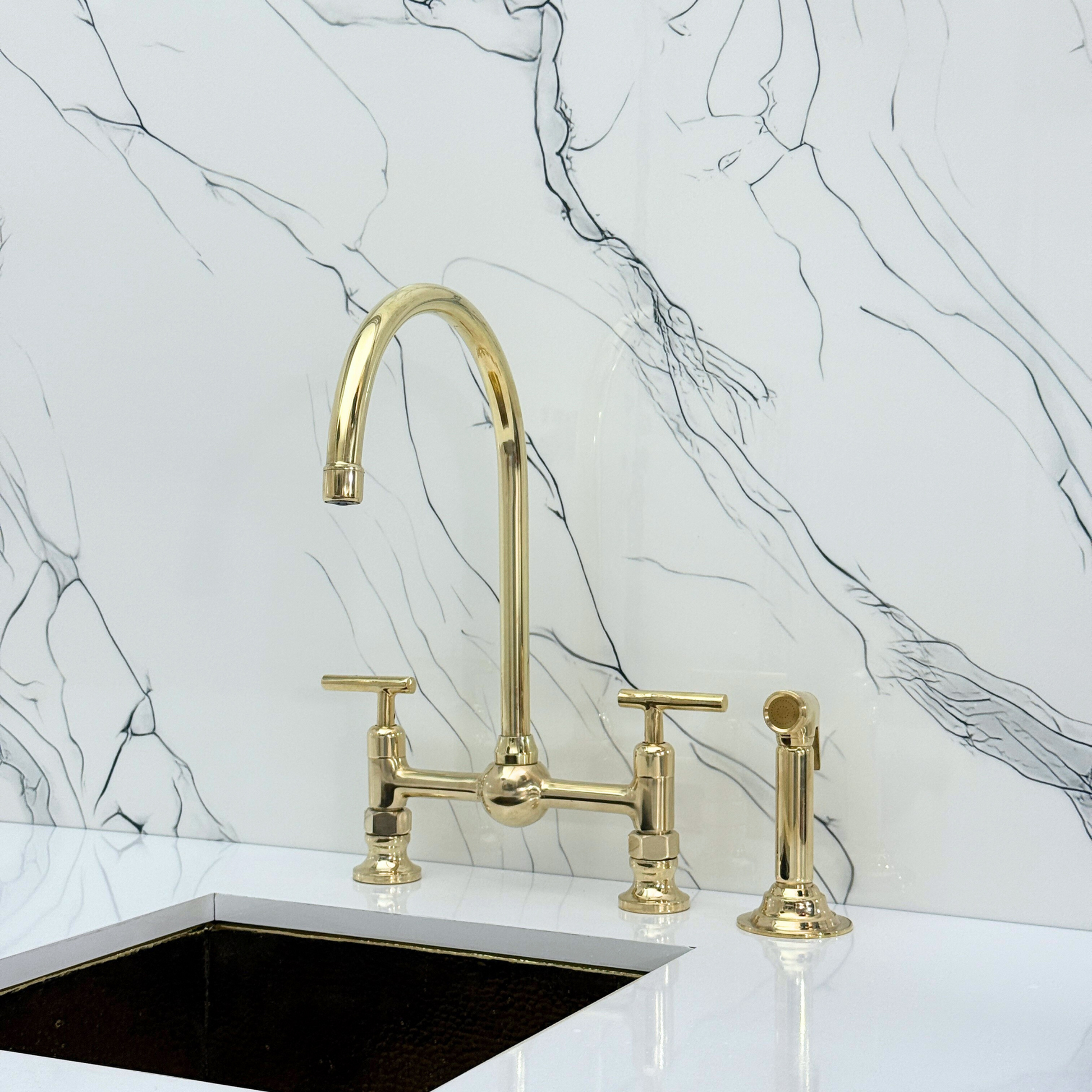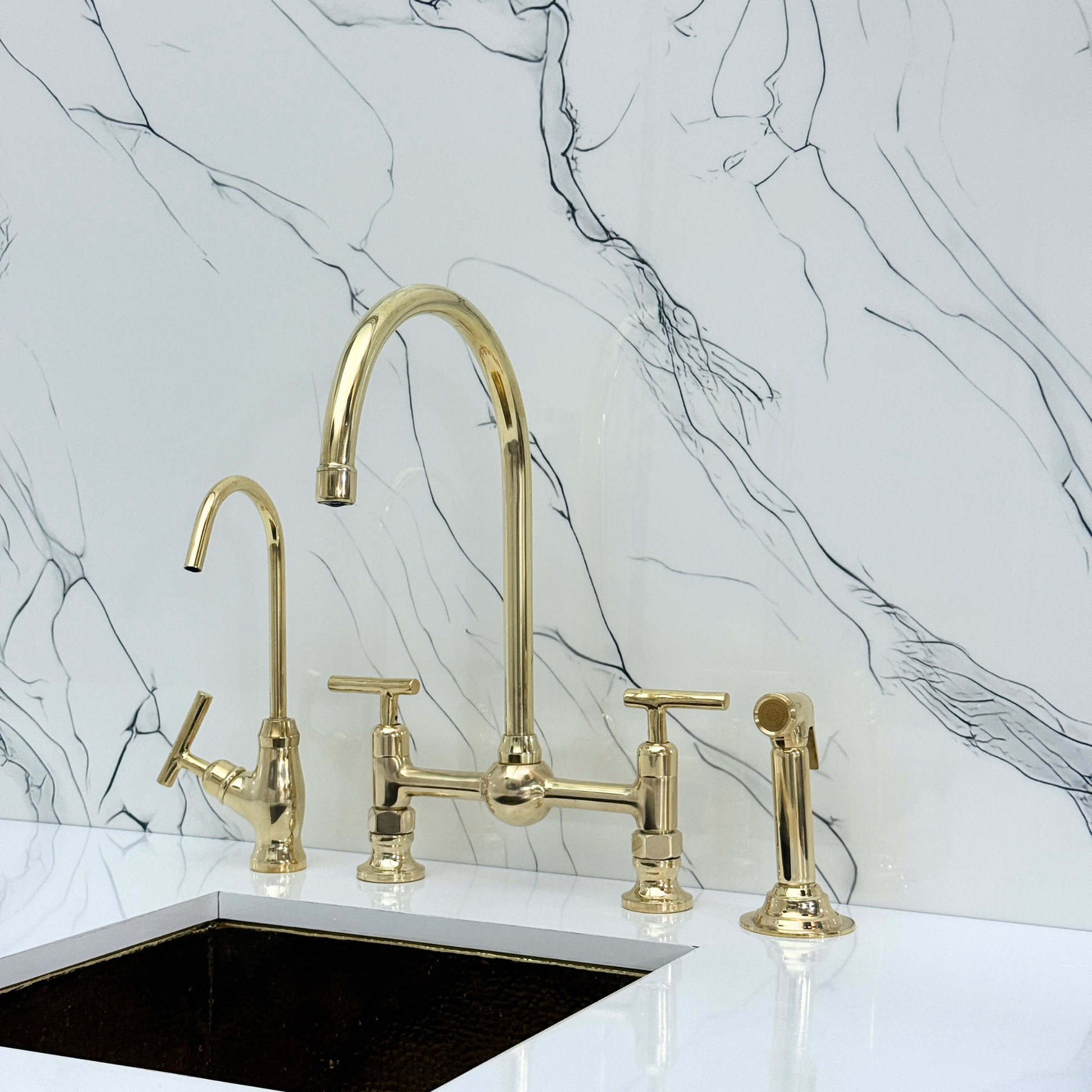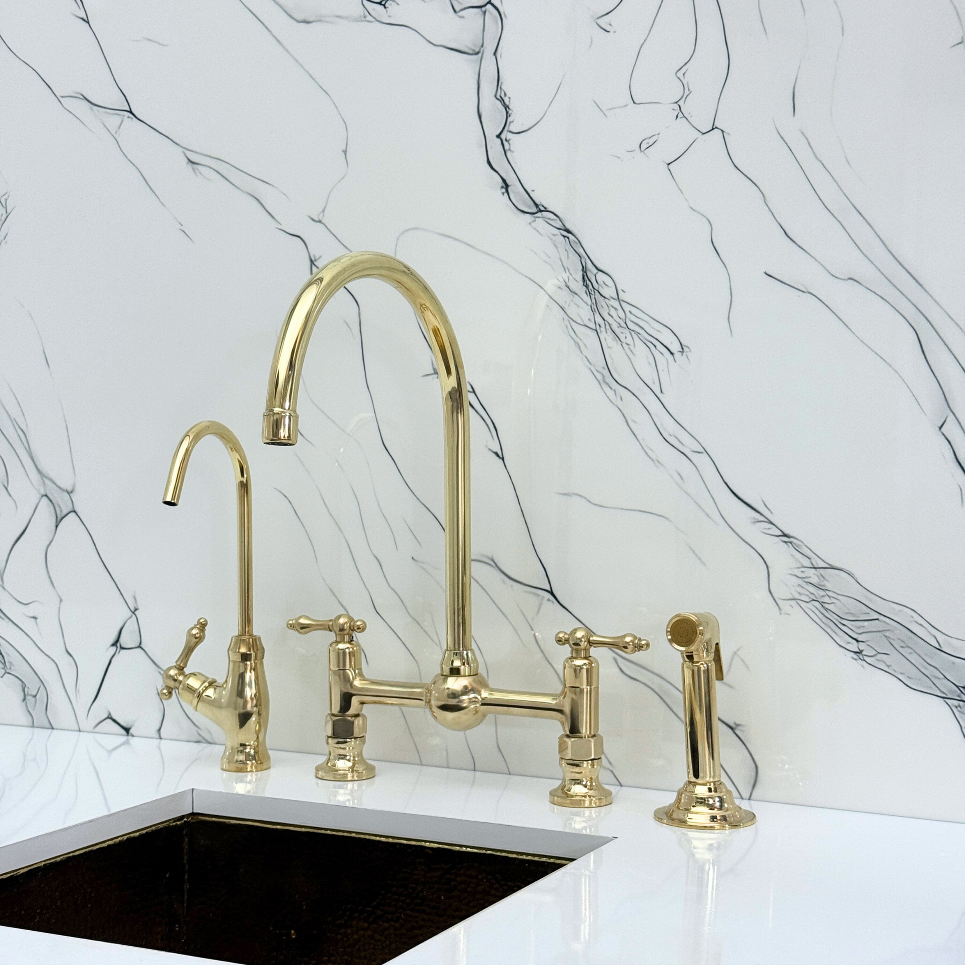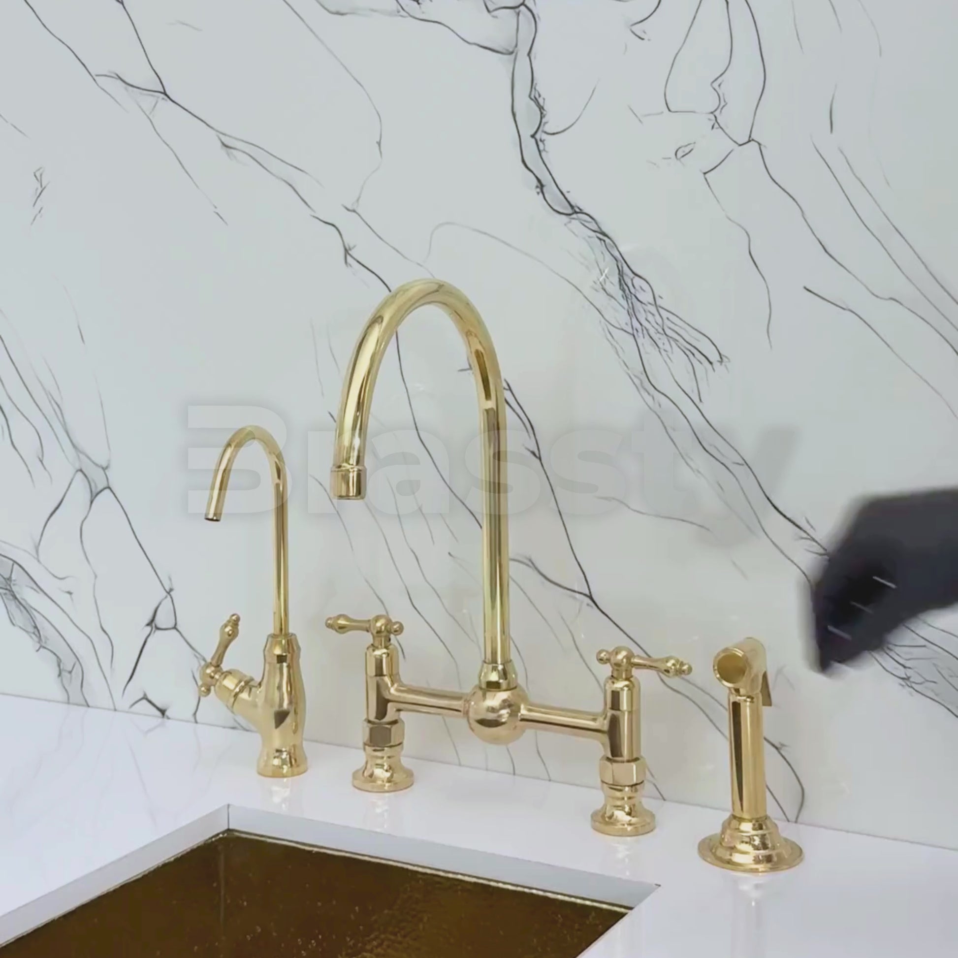 Unlacquered brass bridge vintage kitchen faucet brings together artisanal quality and everyday performance, tailored for kitchens that value both beauty and reliability. The smooth ball center detail enhances visual appeal, adding balance and sophistication to the design. Crafted from premium solid brass, it features a natural unlacquered finish that develops a graceful patina over time. A 360° swivel gooseneck spout ensures full sink coverage and elegant movement. Designed with a dedicated drinking water tap and a high-pressure side sprayer, this set delivers full performance in a refined form. Lever handles ensure easy water control, while the faucet remains durable, corrosion-resistant, and simple to install and maintain.