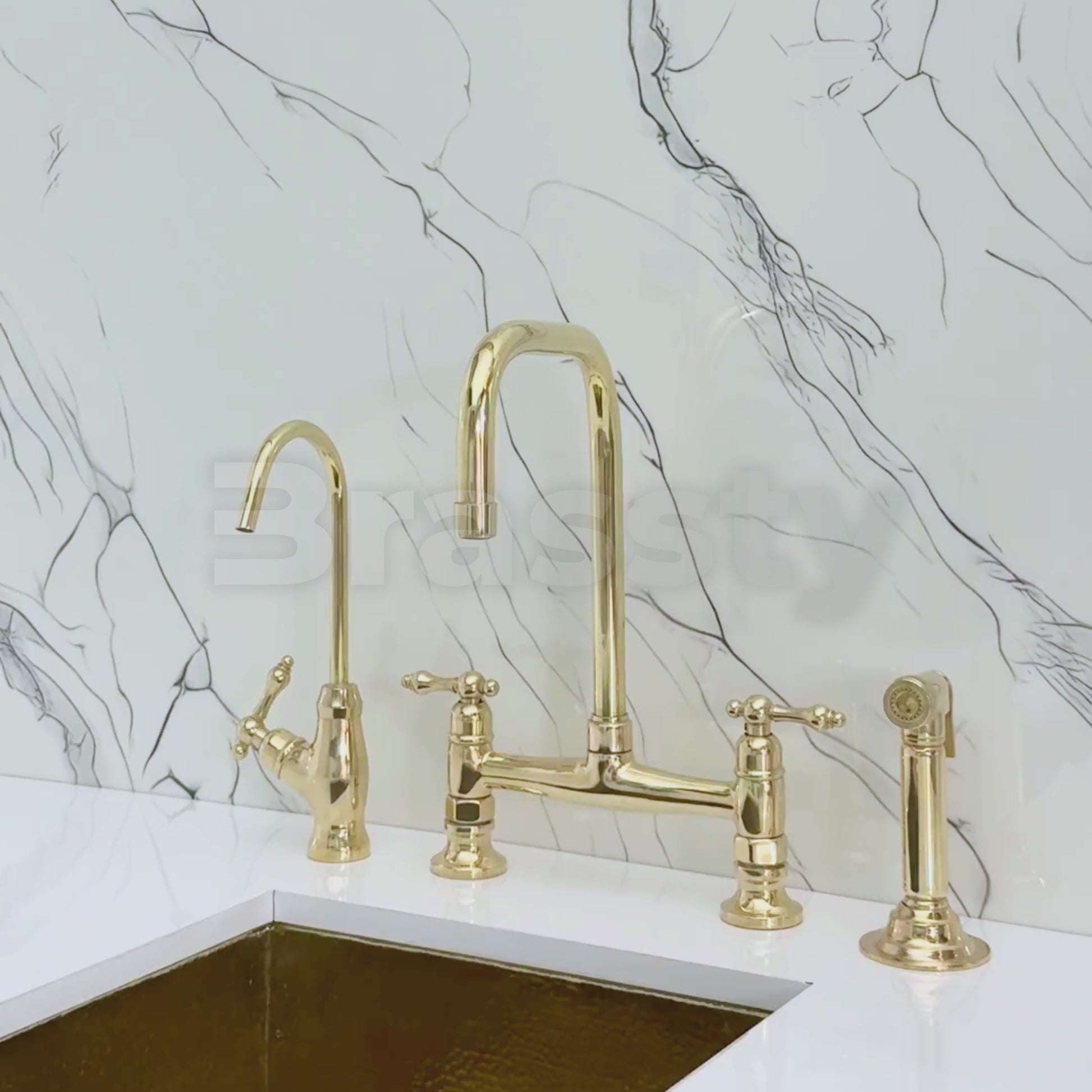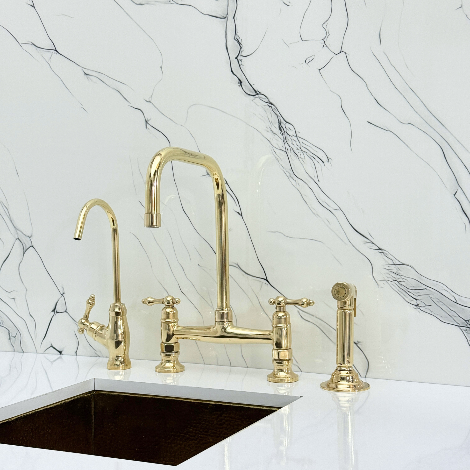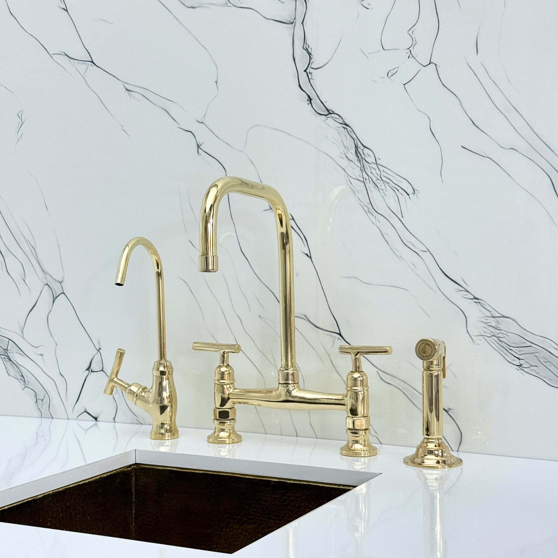 Unlacquered brass classic bridge faucet brings together artisanal quality and everyday performance, tailored for kitchens that value both beauty and reliability. Crafted from premium solid brass, it features a natural unlacquered finish that develops a graceful patina over time. A 360° swivel gooseneck spout with a 9" reach ensures full sink coverage and elegant movement. Designed with a dedicated drinking water tap and a high-pressure side sprayer, this set delivers full performance in a refined form. Lever handles ensure easy water control, while the faucet remains durable, corrosion-resistant, and simple to install and maintain.
