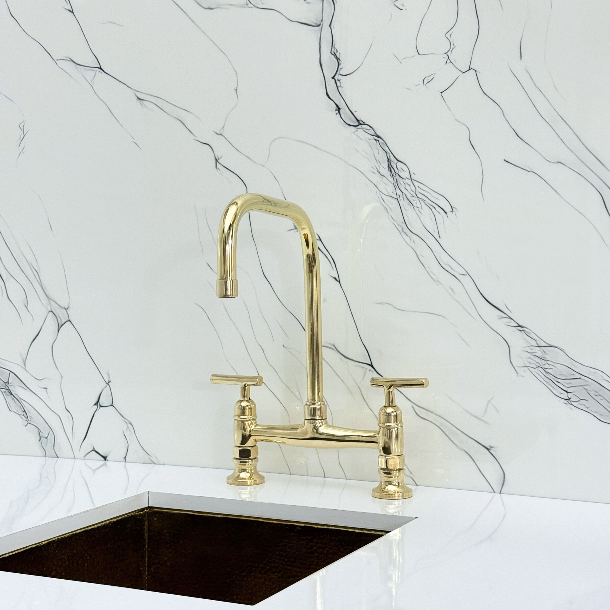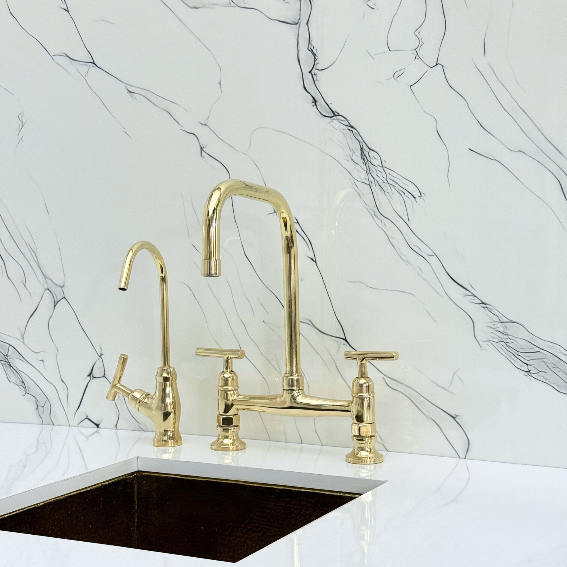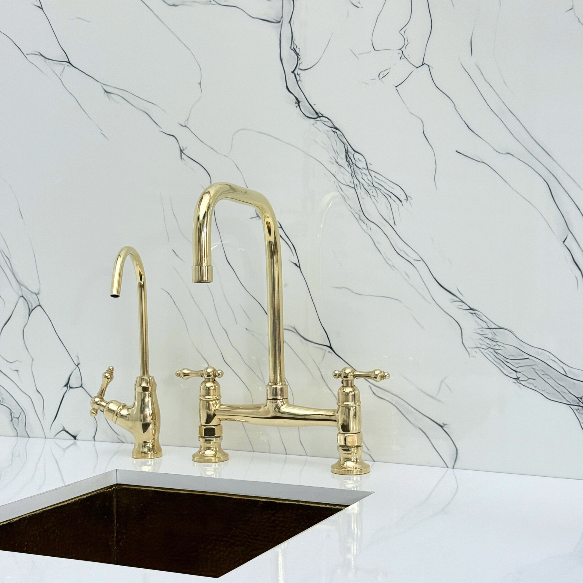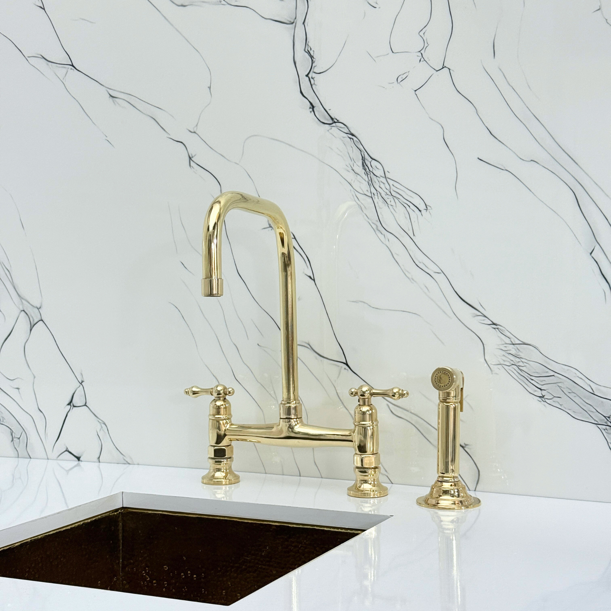 Unlacquered brass classic bridge faucet brings together artisanal quality and everyday performance, tailored for kitchens that value both beauty and reliability. Crafted from premium solid brass, it features a natural unlacquered finish that develops a graceful patina over time. A 360° swivel gooseneck spout with a 9" reach ensures full sink coverage and elegant movement. Designed with a dedicated drinking water tap and a high-pressure side sprayer, this set delivers full performance in a refined form. Lever handles ensure easy water control, while the faucet remains durable, corrosion-resistant, and simple to install and maintain.