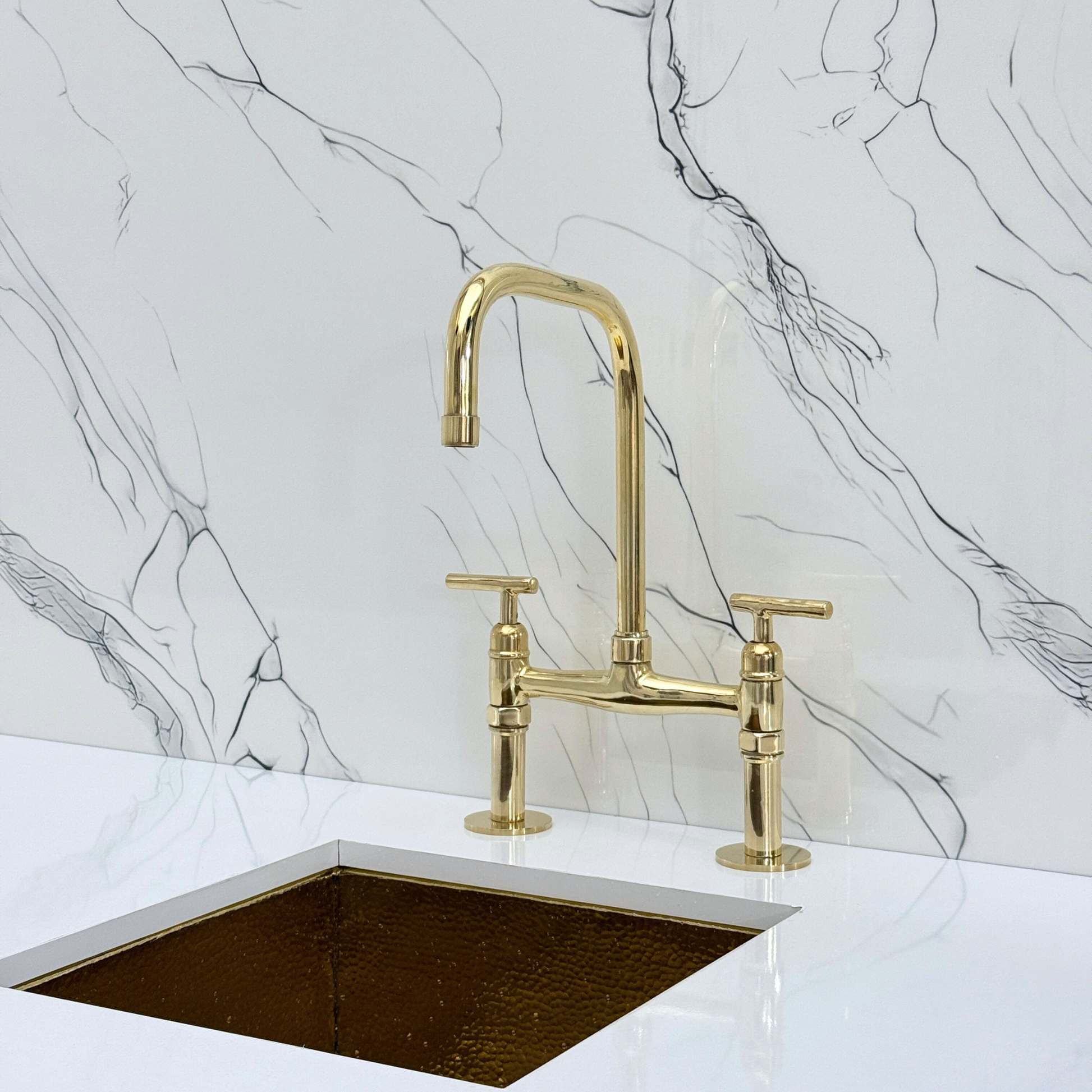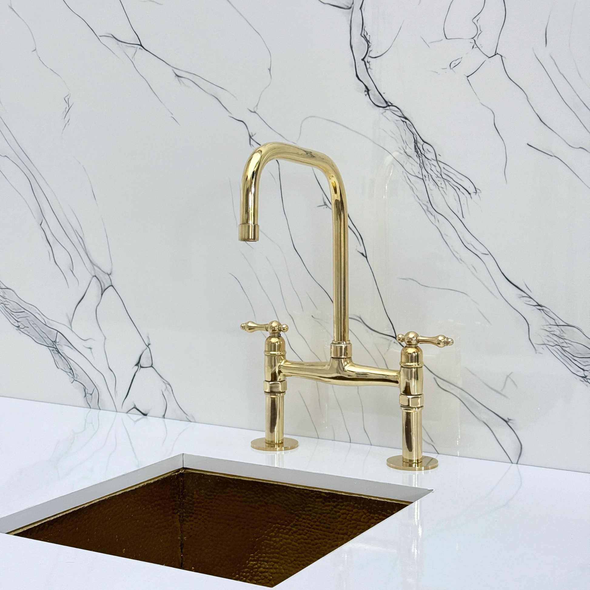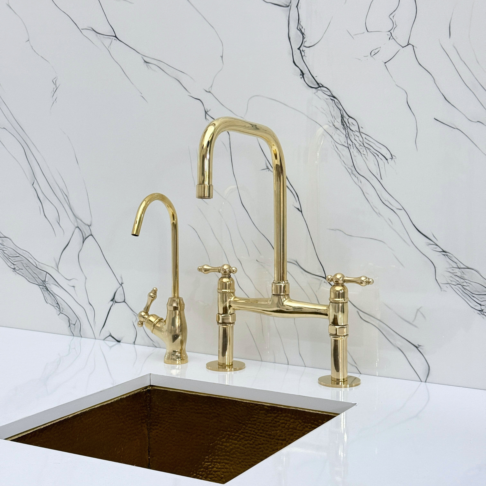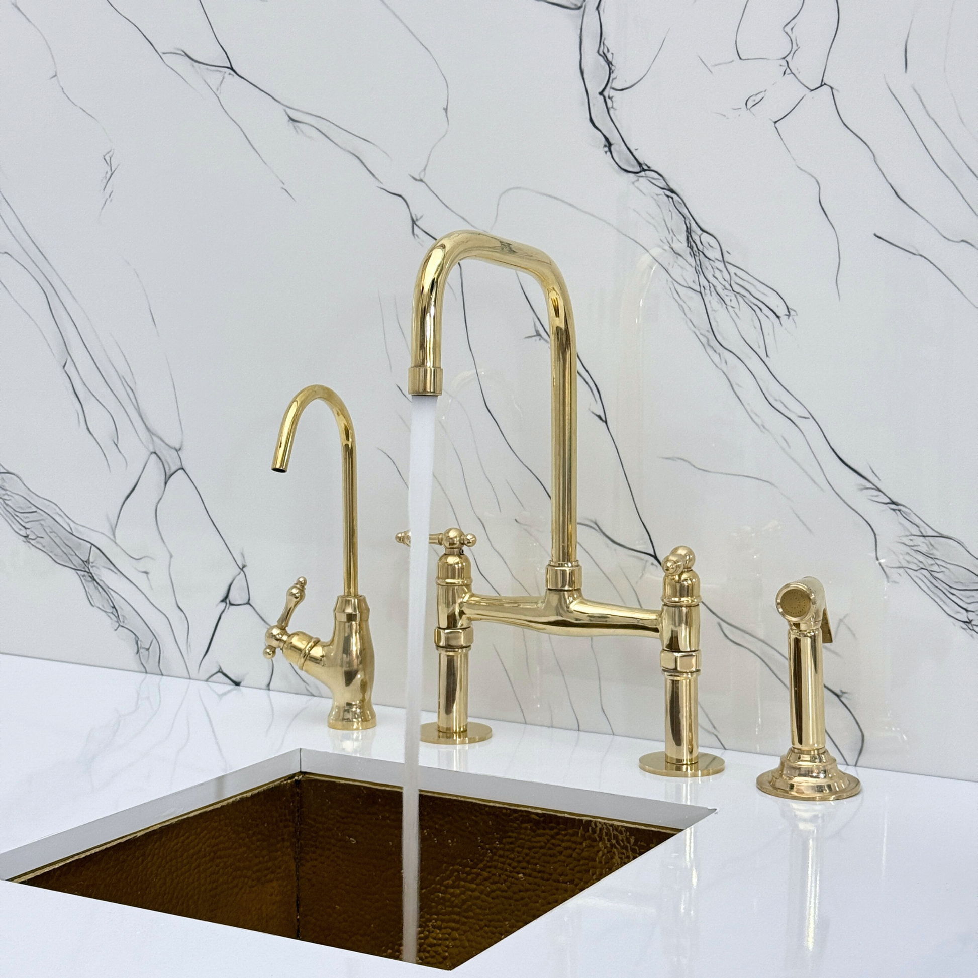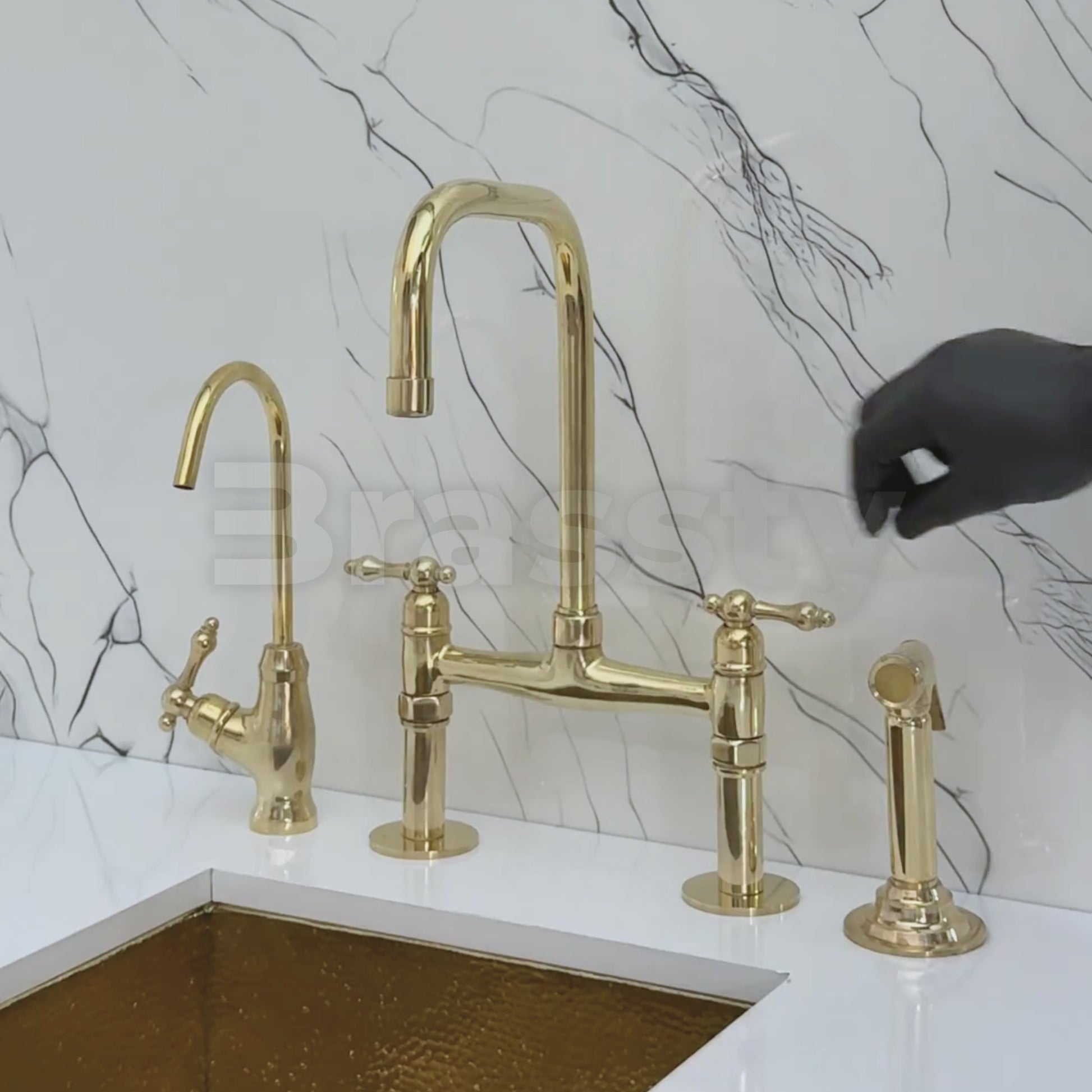 Unlacquered brass classic faucet brings together artisanal quality and everyday performance, tailored for kitchens that value both beauty and reliability. The sculpted Classic-style spout adds a timeless touch, echoing classic design traditions. Crafted from premium solid brass, it features a natural unlacquered finish that develops a graceful patina over time. A 360° swivel gooseneck spout ensures full sink coverage and elegant movement. The set also includes a dedicated drinking water tap and a high-pressure side sprayer for efficient rinsing. Lever handles ensure easy water control, while the faucet remains durable, corrosion-resistant, and simple to install and maintain.