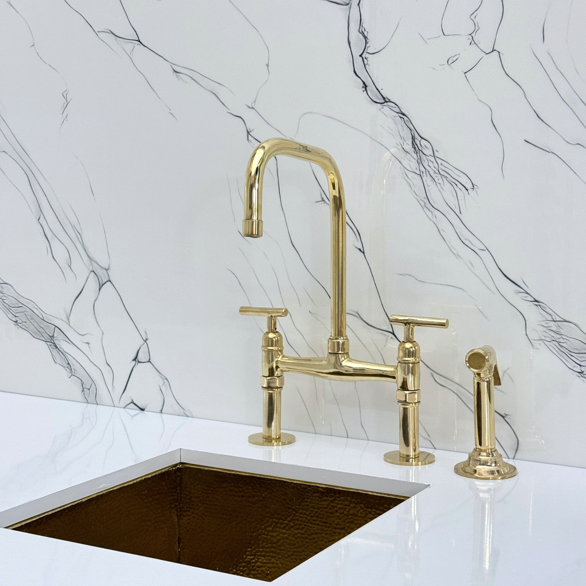 Unlacquered Brass Classic Bridge Faucet with Sprayer, Cold Water Faucet and Lever Handles