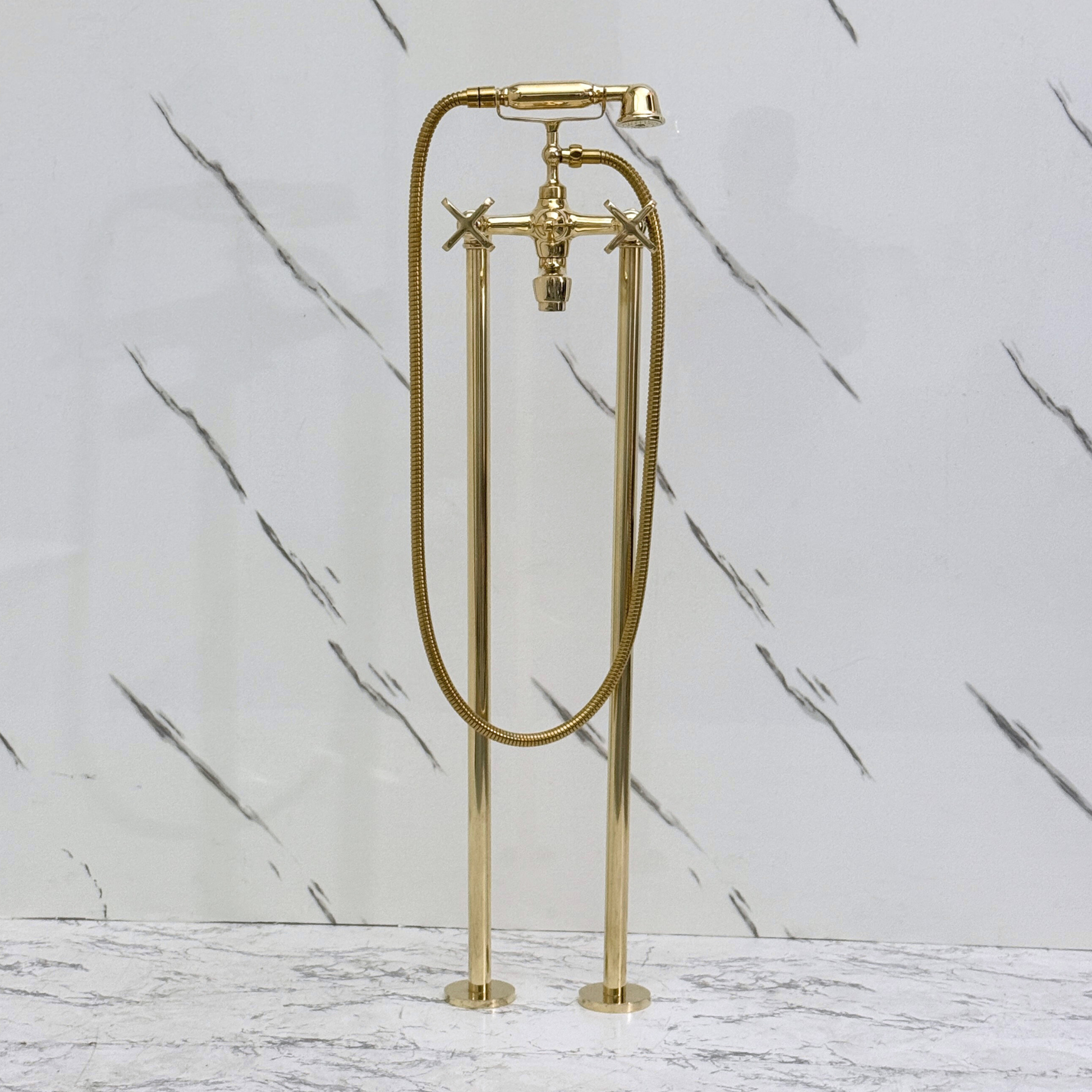 Unlacquered Brass freestanding bathtub faucet crafted from premium solid brass. Featuring a natural unlacquered finish that develops a graceful patina over time, this tub filler brings classic elegance and durability to your bathroom. Cross handles provide precise water control, ensuring effortless adjustments for the perfect temperature and flow. Equipped with a versatile handheld shower head, it offers flexibility for targeted rinsing and easy cleaning.