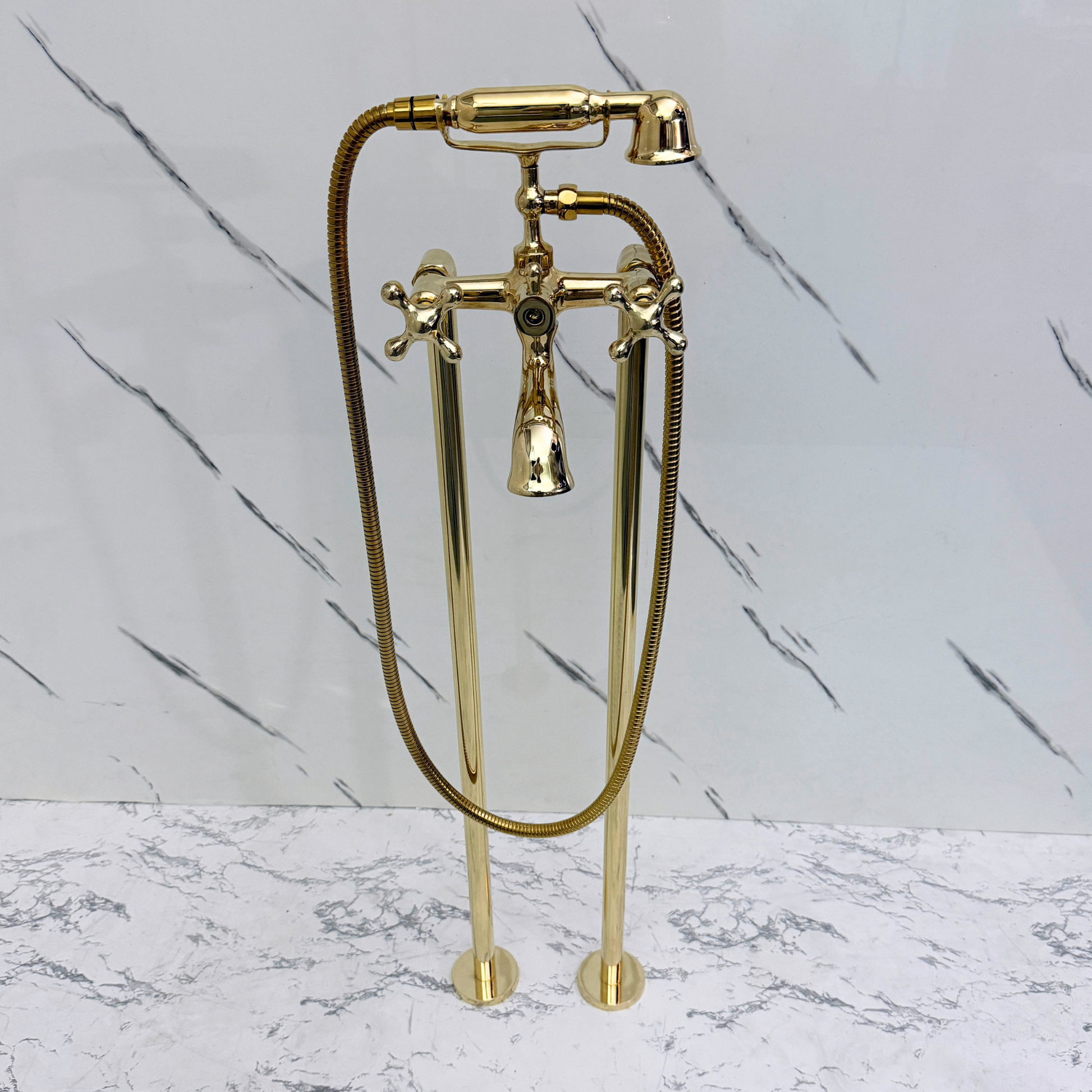 Unlacquered Brass freestanding bathtub faucet crafted from premium solid brass. Featuring a natural unlacquered finish that develops a graceful patina over time, this tub filler brings classic elegance and durability to your bathroom. Cross handles provide precise water control, ensuring effortless adjustments for the perfect temperature and flow. Equipped with a versatile handheld shower head, it offers flexibility for targeted rinsing and easy cleaning. The small middle lever acts as a diverter, allowing you to effortlessly switch water flow between the tub filler and the handheld shower head.