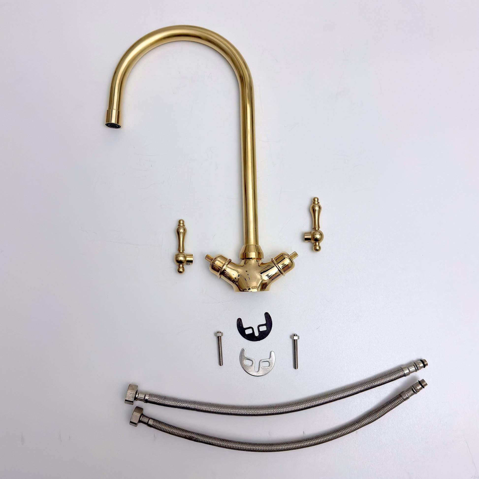 Elevate your bathroom vanity with this exquisite Single Hole Bathroom Faucet, defined by its exceptionally tall gooseneck spout and classic lever handles. Crafted from premium solid brass, it features a natural unlacquered finish that develops a graceful patina over time. The high-arched spout provides a full 360-degree rotation, offering superior clearance for both bathroom vanities and small kitchen sinks. This deck-mounted fixture combines timeless elegance with precise temperature control via its integrated two-handle design, while the single-hole layout provides a clean, space-saving custom look.