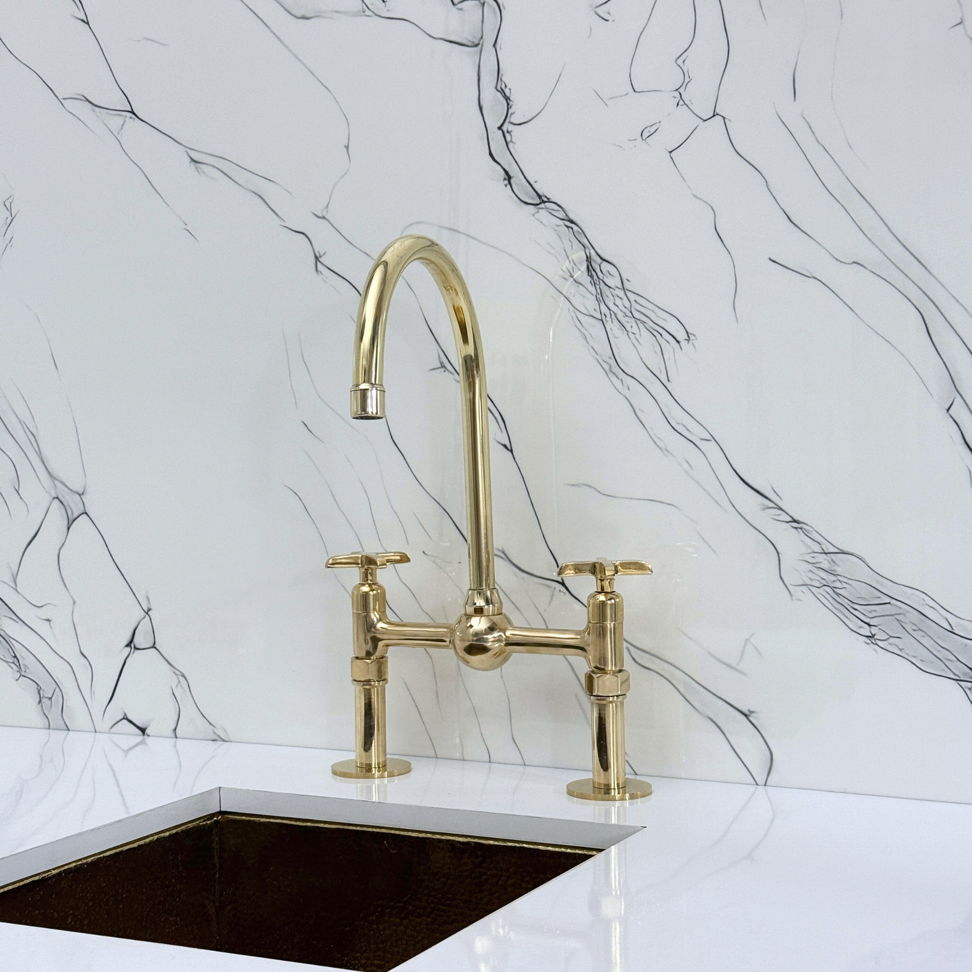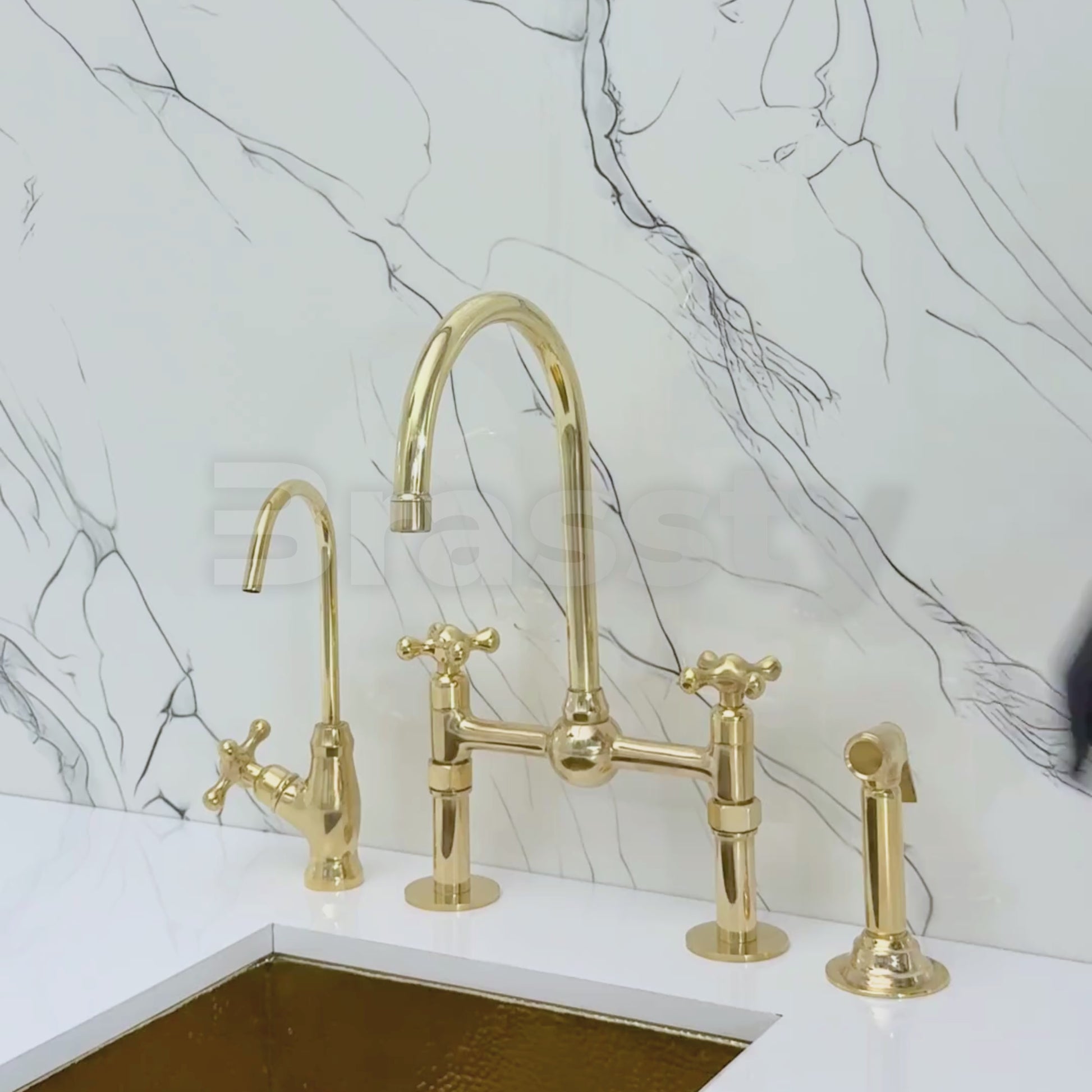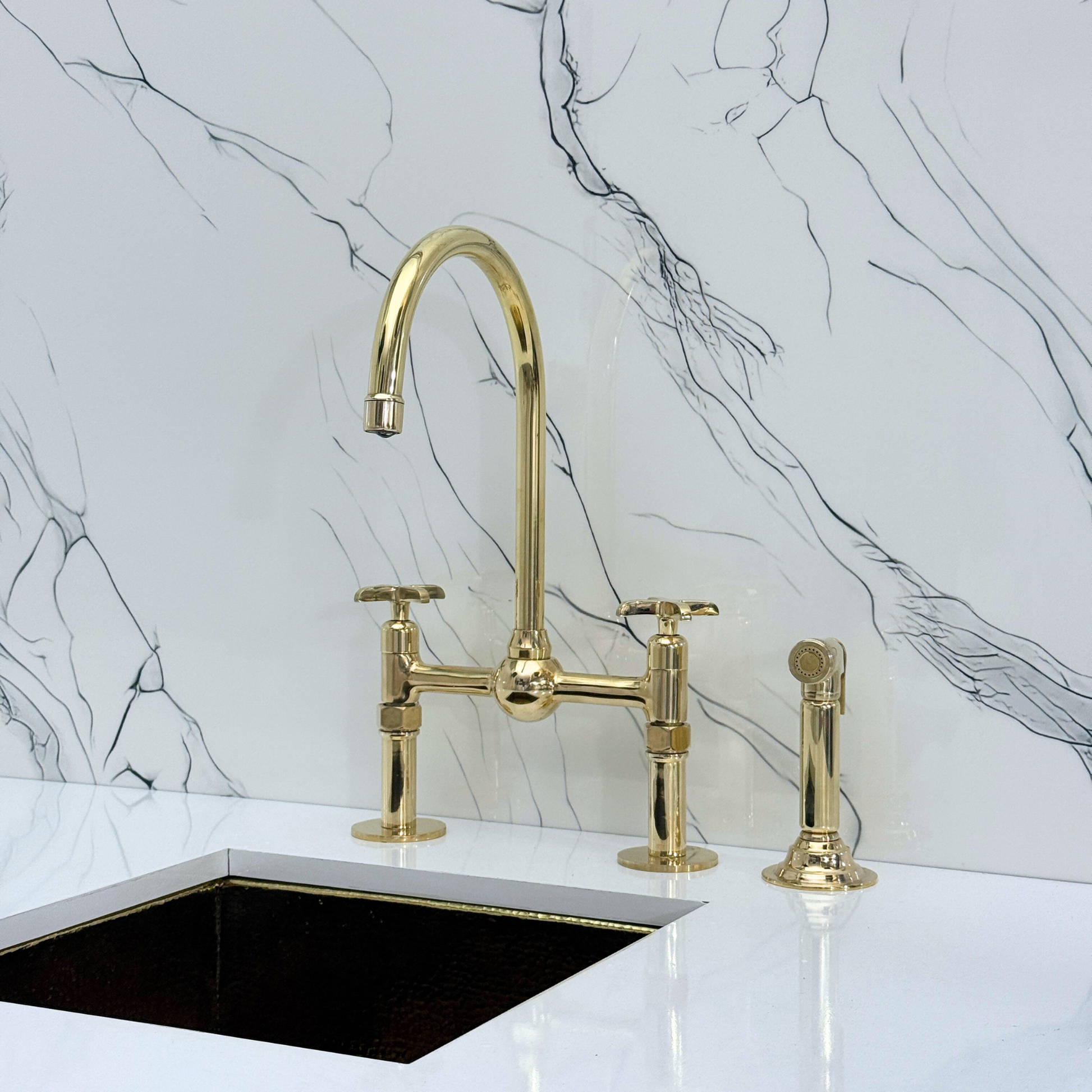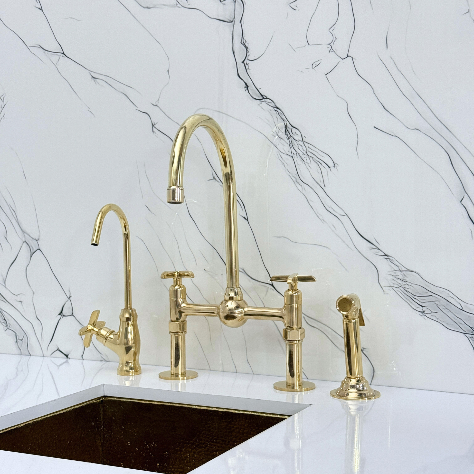 Unlacquered Brass Bridge Faucet with Ball Center brings together artisanal quality and everyday performance, tailored for kitchens that value both beauty and reliability. The smooth ball center detail enhances visual appeal, adding balance and sophistication to the design. Crafted from premium solid brass, it features a natural unlacquered finish that develops a graceful patina over time. A 360° swivel gooseneck spout ensures full sink coverage and elegant movement. Designed with a dedicated drinking water tap and a high-pressure side sprayer, and a straight-leg base, this set delivers full performance in a refined form. Cross handles ensure easy water control, while the faucet remains durable, corrosion-resistant, and simple to install and maintain.