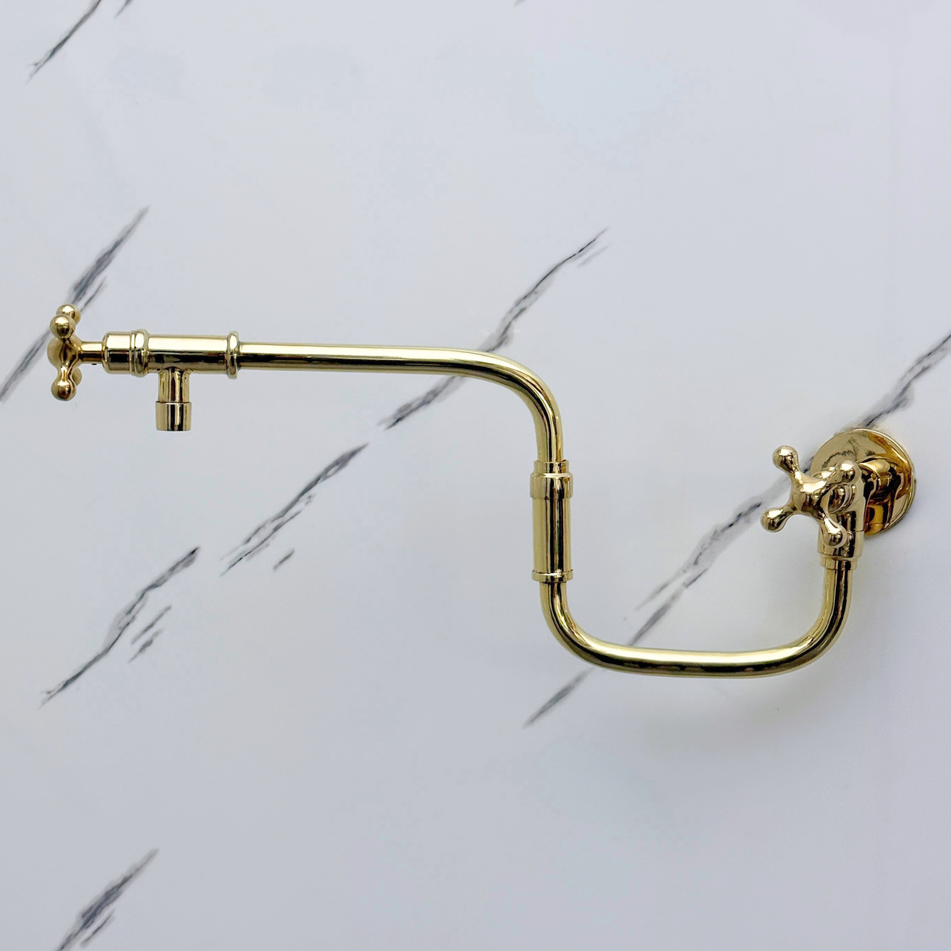 Unlacquered Brass Pot Filler combines artisanal quality with everyday efficiency, designed for kitchens that value beauty. Crafted from premium solid brass, its natural unlacquered finish develops a graceful patina over time. The Double Joint swing arm ensures full stove coverage and folds away for a space-saving design. With smooth cross handles for precise water control, this faucet remains durable, corrosion-resistant, and simple to maintain.