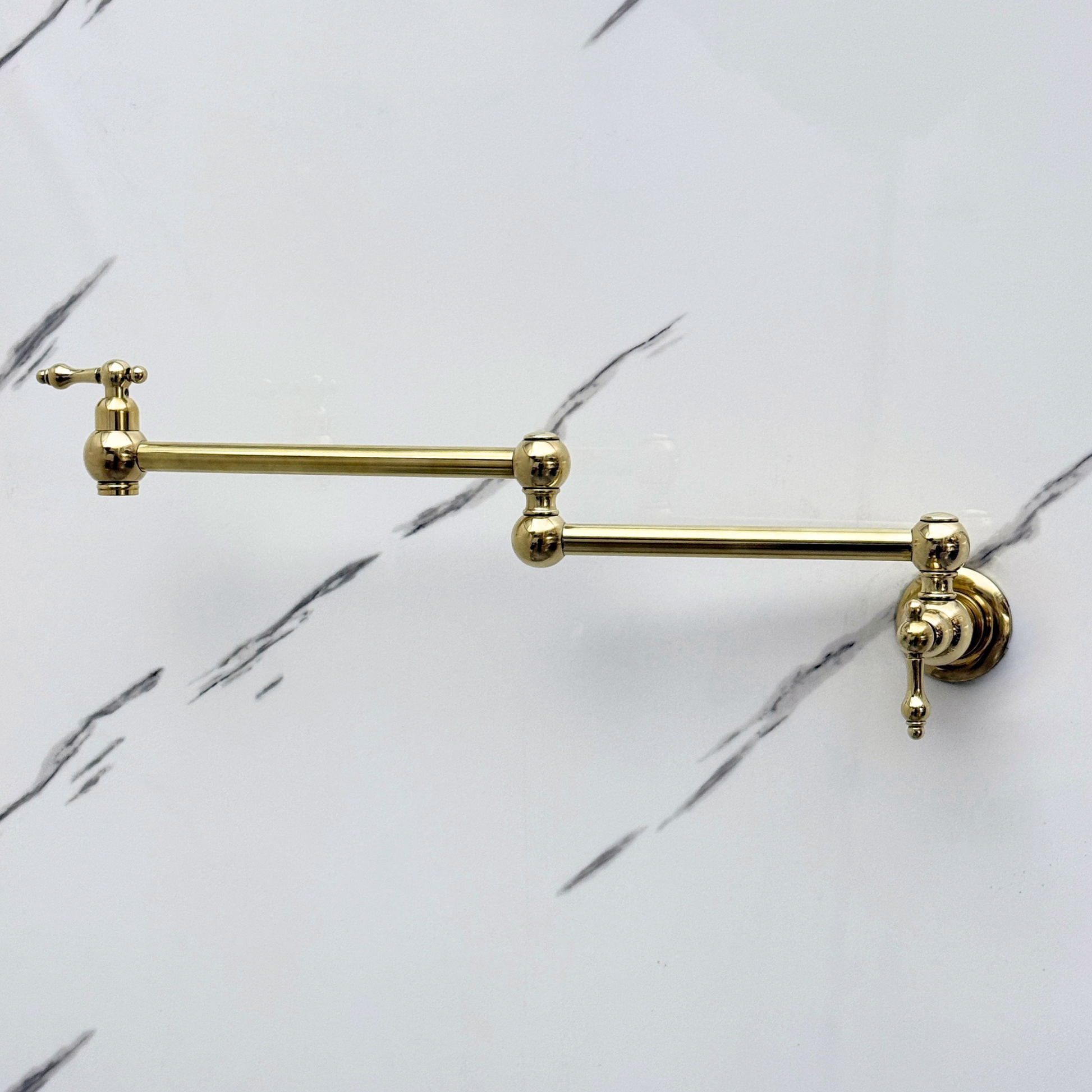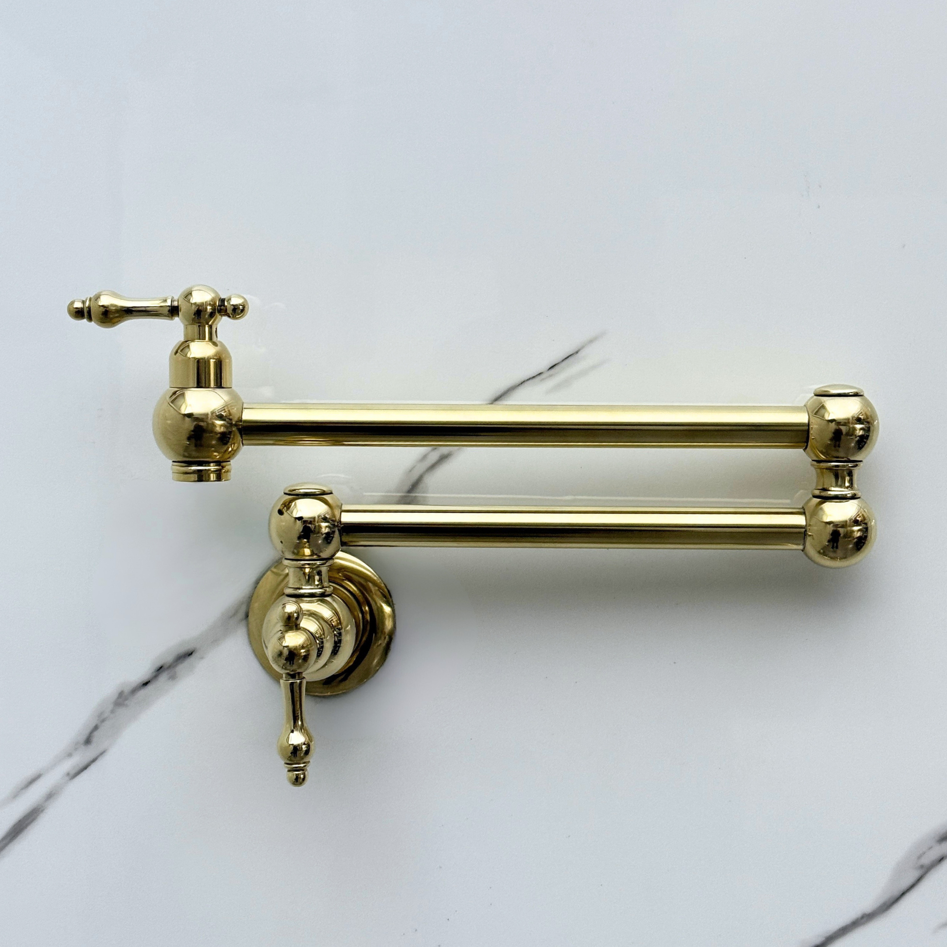 Unlacquered Brass Pot Filler combines artisanal quality with everyday efficiency, designed for kitchens that value beauty. Crafted from premium solid brass, its natural unlacquered finish develops a graceful patina over time. The double-jointed swing arm ensures full stove coverage and folds away for a space-saving design. With smooth lever handles for precise water control, this faucet remains durable, corrosion-resistant, and simple to maintain.