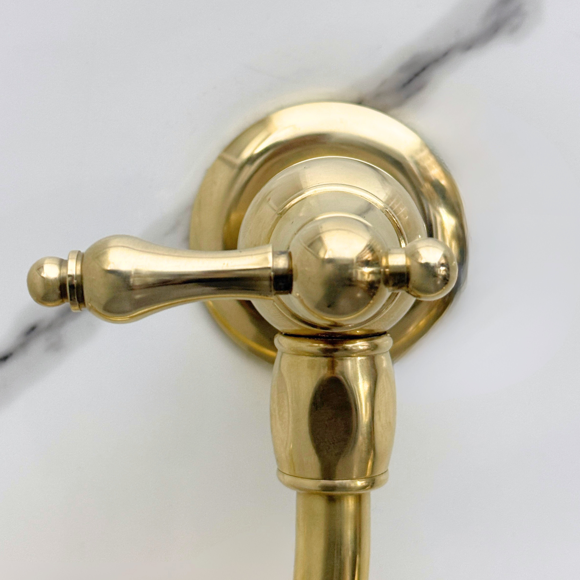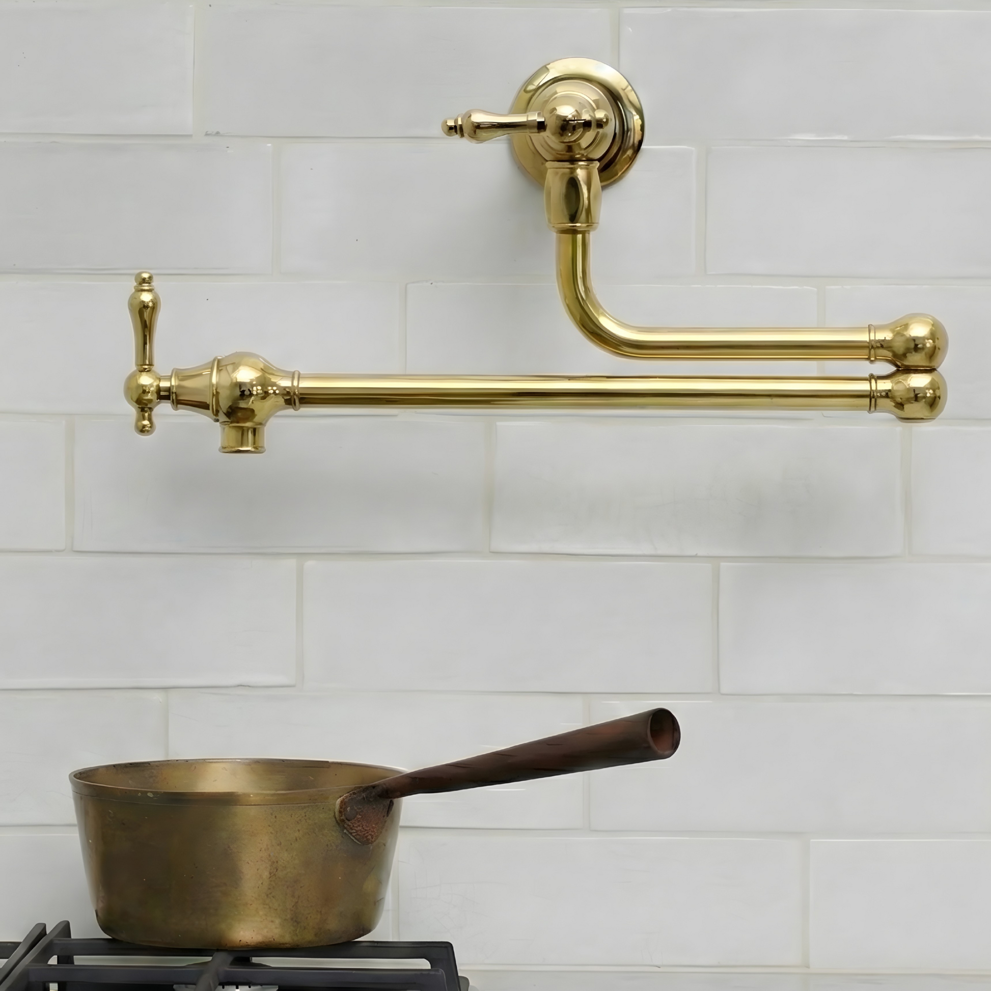 Unlacquered Brass Pot Filler combines artisanal quality with everyday efficiency, designed for kitchens that value beauty. Crafted from premium solid brass, its natural unlacquered finish develops a graceful patina over time. The double-jointed swing arm ensures full stove coverage and folds away for a space-saving design. With smooth lever handles for precise water control, this faucet remains durable, corrosion-resistant, and simple to maintain.