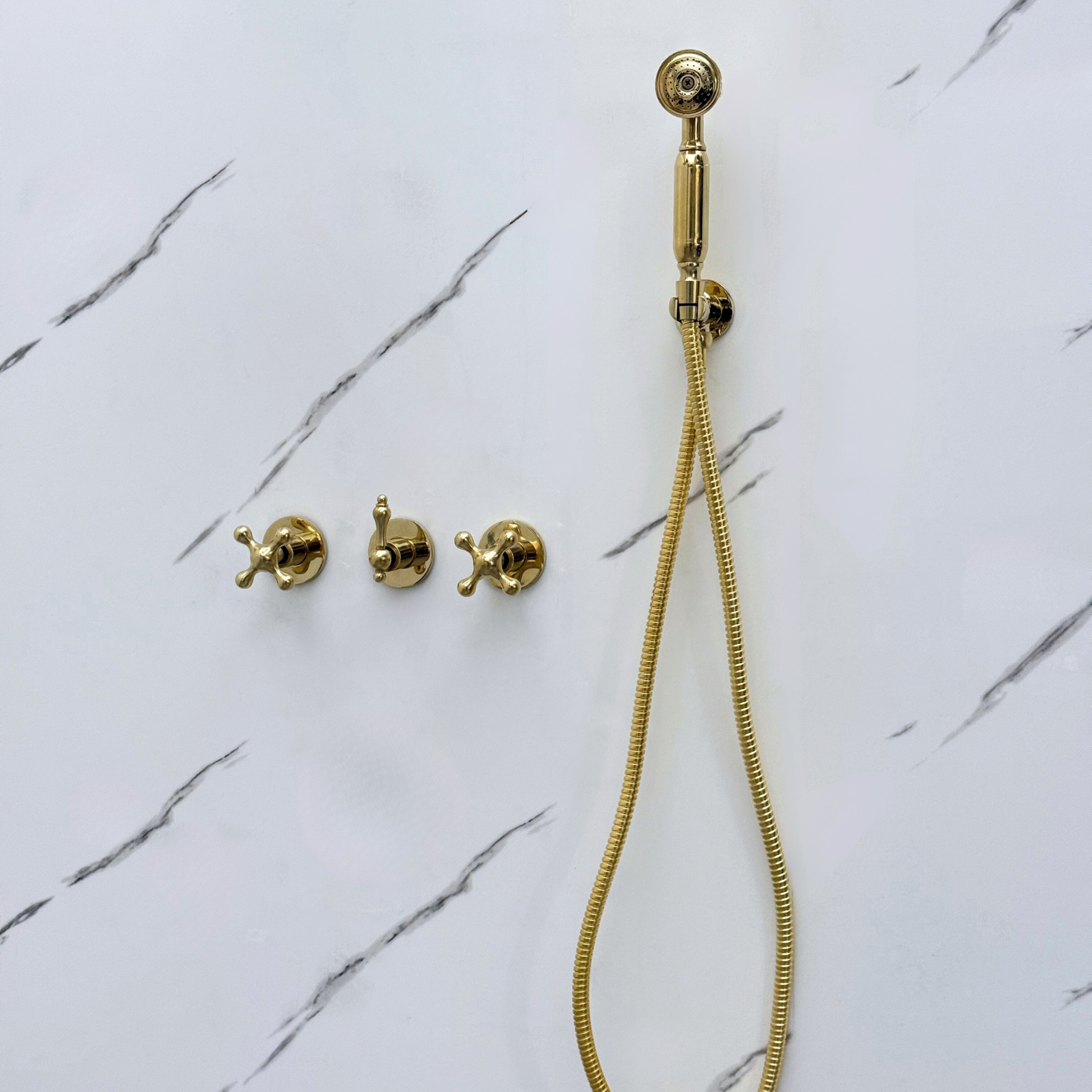 This Unlacquered Brass Shower System, crafted from premium solid brass, features a natural unlacquered finish that develops a graceful patina over time. The flat square rain shower head provides a soothing rainfall effect, and an Adjustable Shower Head Connector is available to customize the shower angle for added comfort. A flexible handheld shower head offers precise rinsing, while the classic cross handles provide smooth, reliable water control. A central lever handle serves as the diverter, allowing you to switch effortlessly between shower functions.