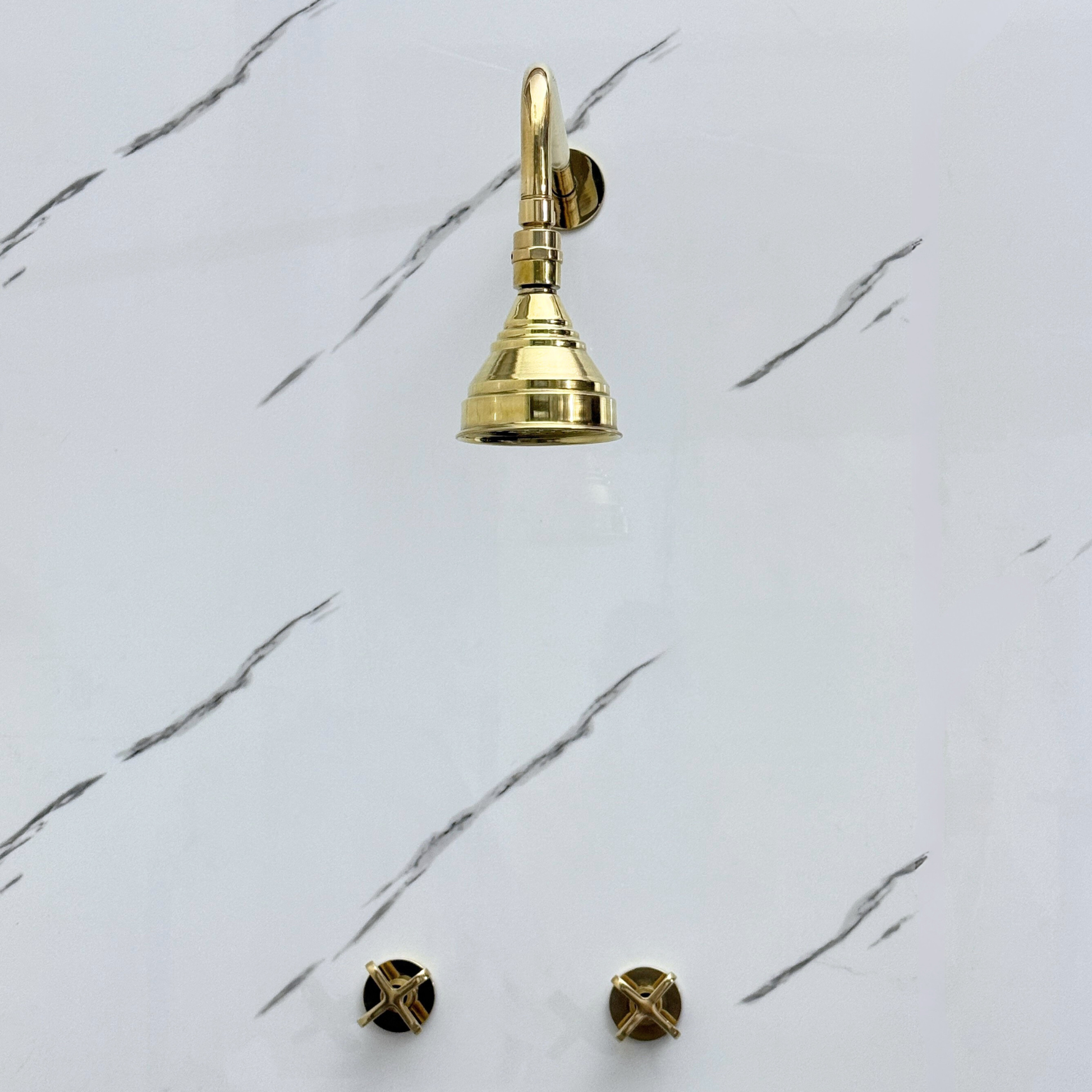 Unlacquered Brass shower system crafted from premium solid brass. Featuring a natural unlacquered finish that develops a graceful patina over time, this wall-mounted shower set combines elegance and durability. The straight arm supports a round rain shower head for a soothing rainfall effect, while the cross handles provide precise water control for an effortless and timeless shower experience. An optional Adjustable Shower Head Connector is available, allowing you to customize the shower angle for added comfort.