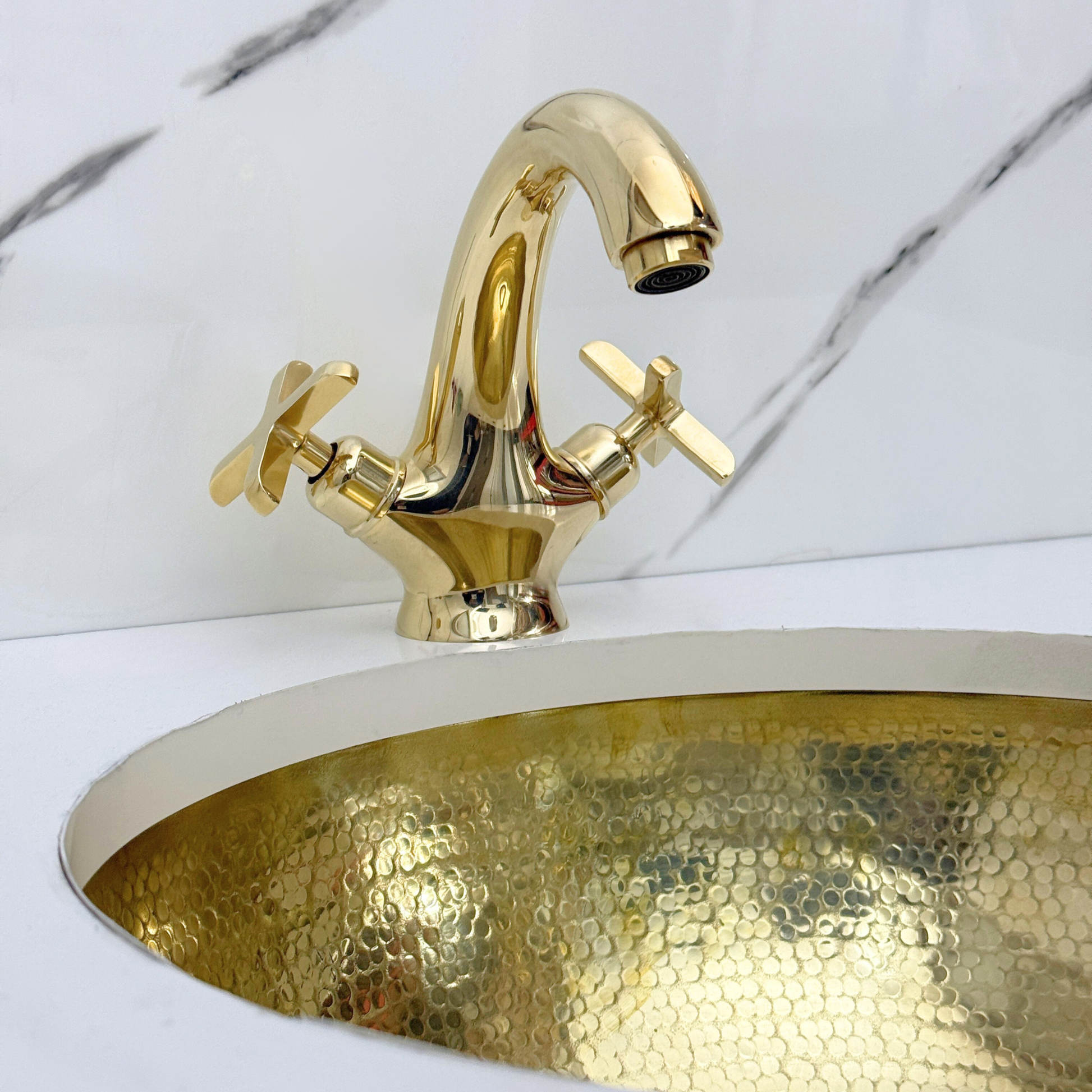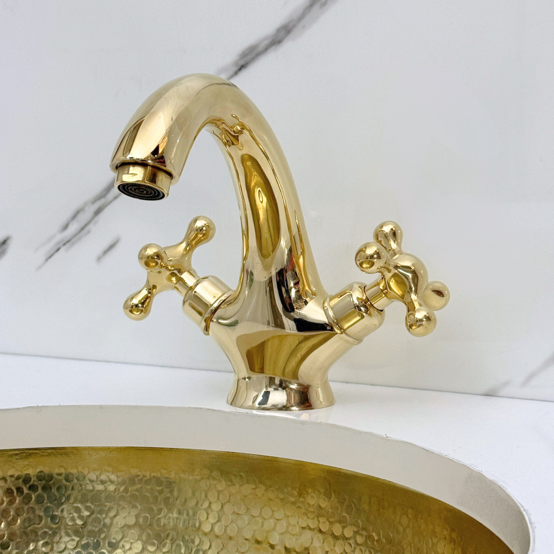 Elevate your bathroom vanity with this exquisite Single Hole Bathroom Faucet. Crafted from premium solid brass, it features a natural unlacquered finish that develops a graceful patina over time. Featuring a curved spout and classic cross handles, this deck-mounted fixture combines timeless elegance with modern functionality. The integrated two-handle design ensures precise temperature control, while the single-hole layout provides a clean, space-saving custom look.