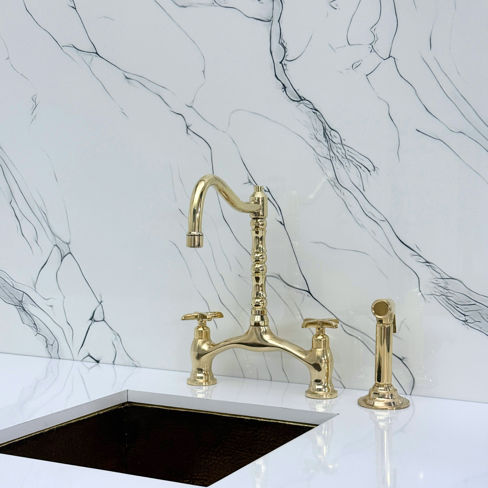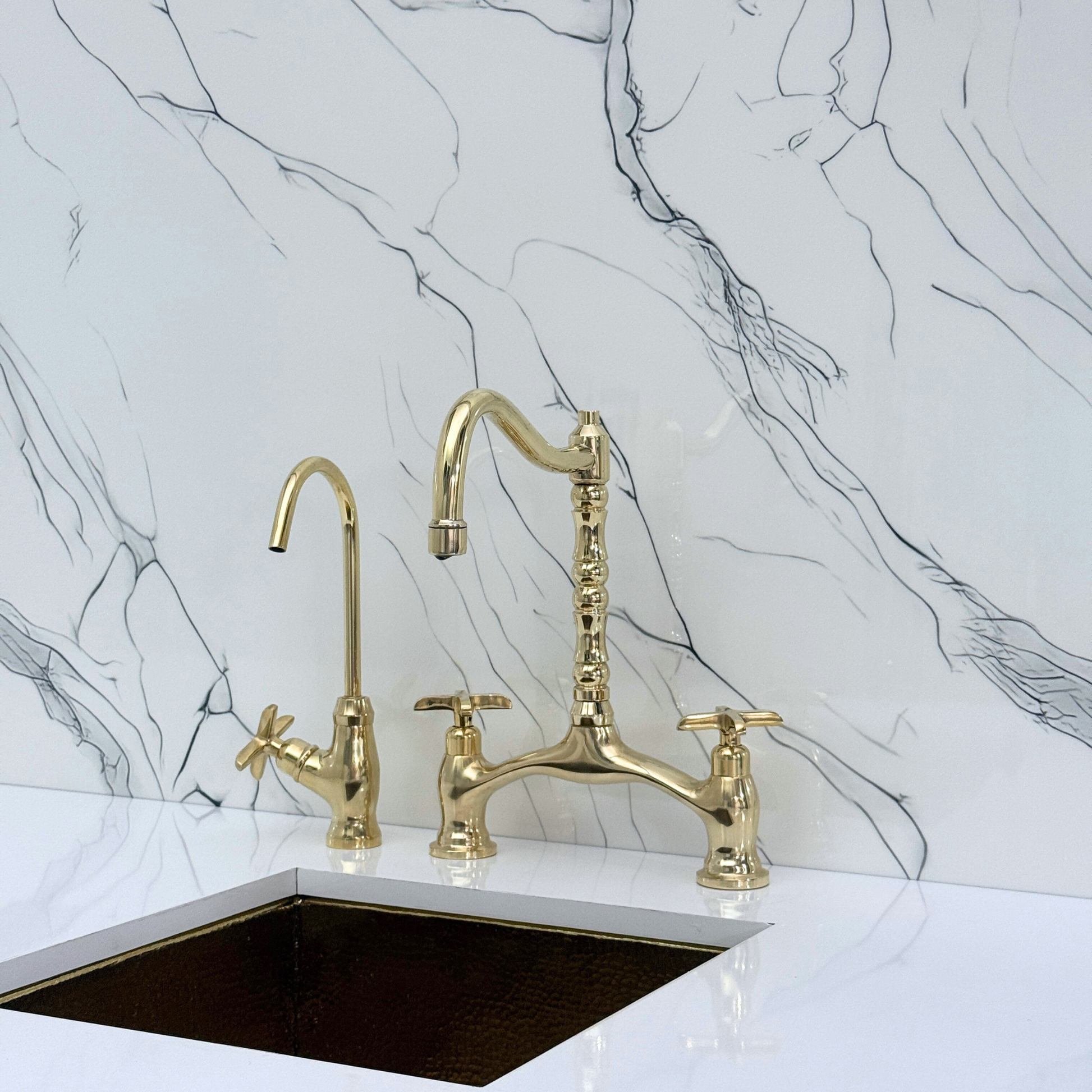Unlacquered Brass Victorian Bridge Kitchen Faucet with Sprayer, Drinking Water Tap and Cross Handles